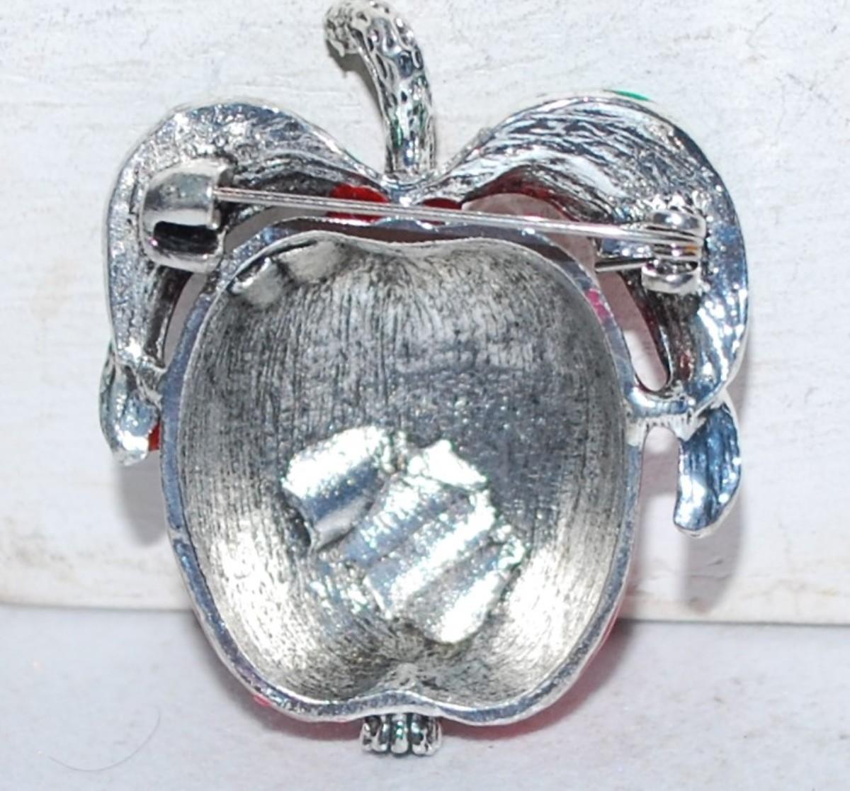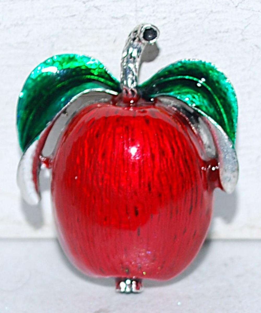 Bright RED APPLE BROOCH (1¾" x 1½") with Green Leaves and Silver Stem on a Silver Tone Setting