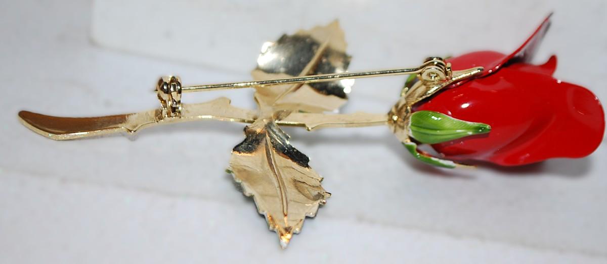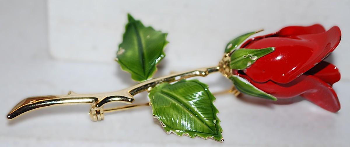 Bright RED Long Stem ROSE BROOCH (3" x 1¾") with Green Leaves and Gold Colored Stem & Gold Tone Setting
