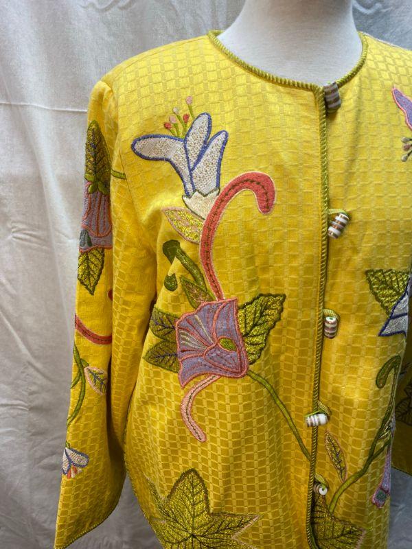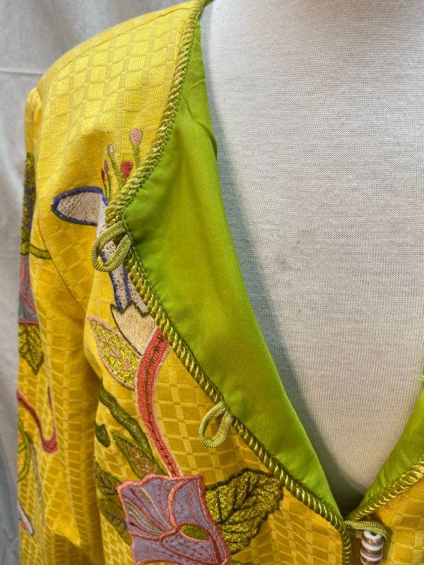 Bright yellow floral embroidered jacket. Lime green lining and edging. Glass bead buttons. Tags were cut out, unsure of brand or size. I can guess it is a size large/xlarge based on other items similar from the estate. light makeup on inside of collar.