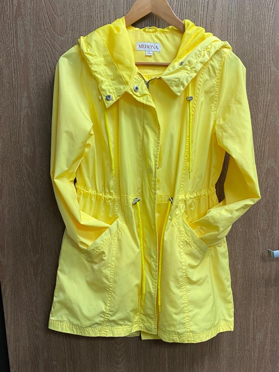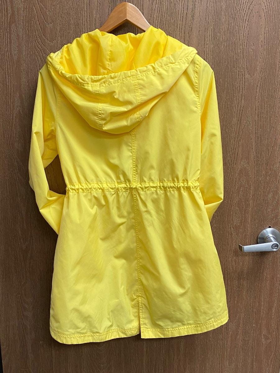 Bright Yellow Lightweight Windbreaker Raincoat Jacket with Hood, Size Small. In good condition.