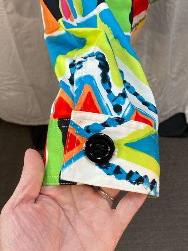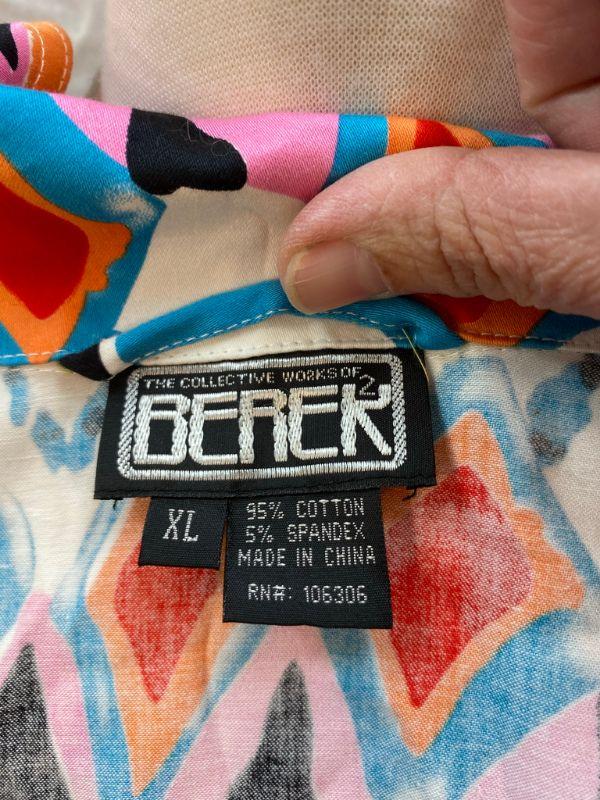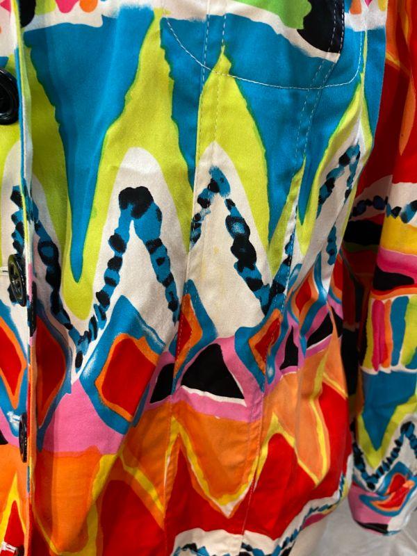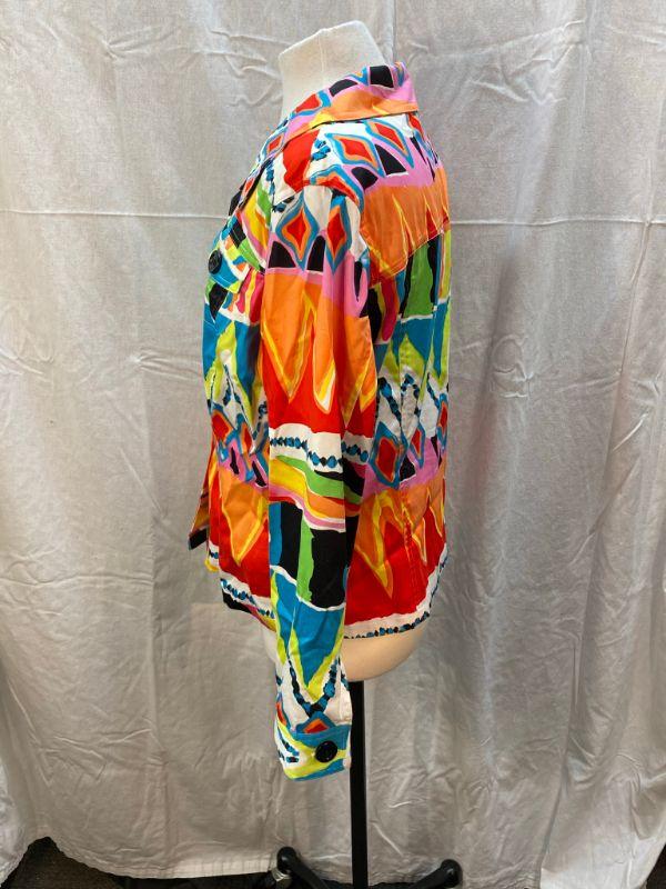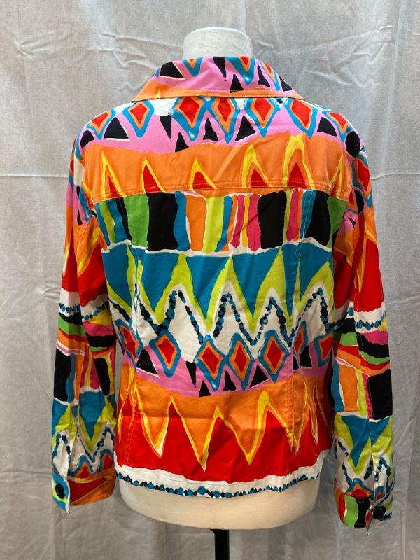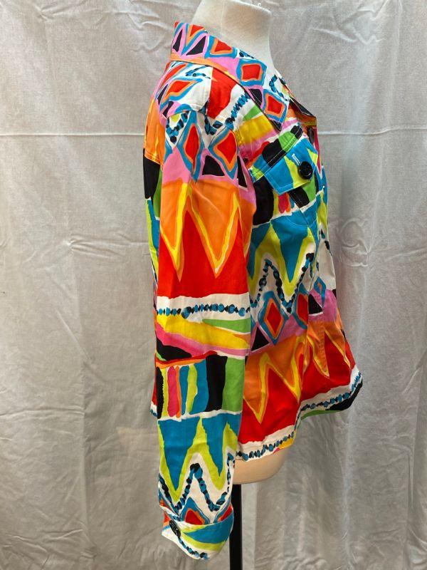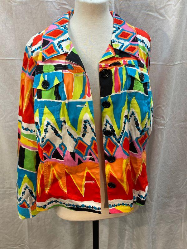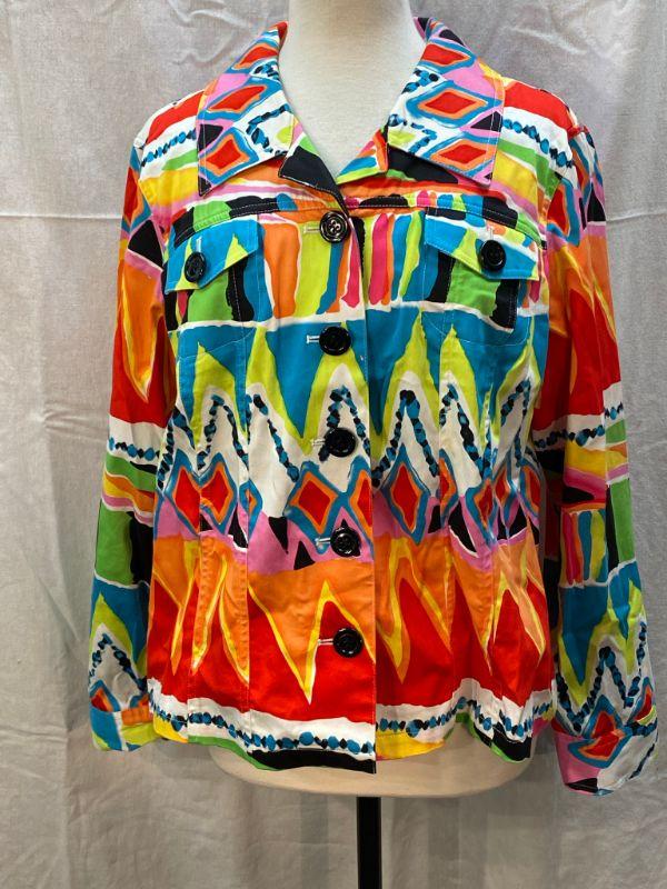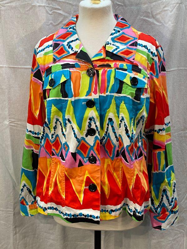 Brightly colored abstract print jacket by Berek 2. Button front. No pockets. Size XL. Good condition.