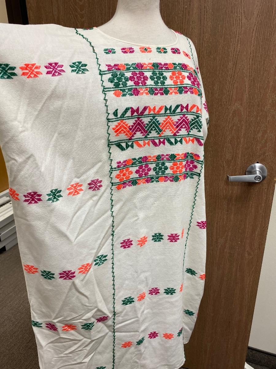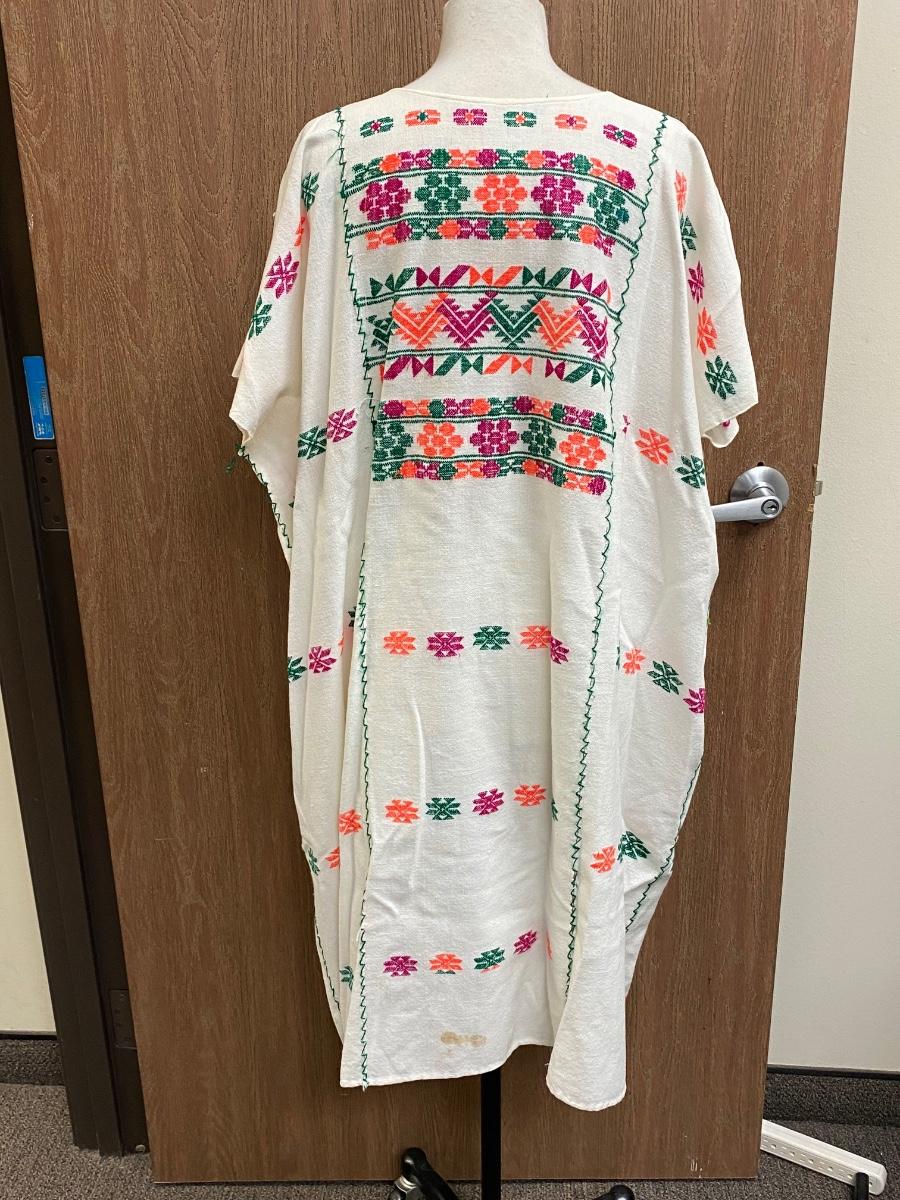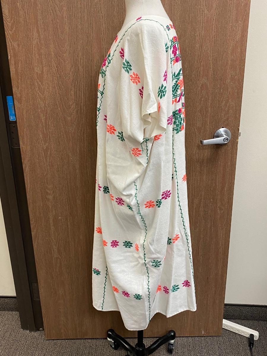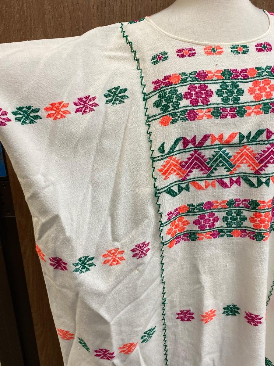 Brightly colored embroidered Mexican caftan dress. In good condition, there is a spot at the bottom. Below the knee length, could be altered to above the spot easily. Medium/large size.