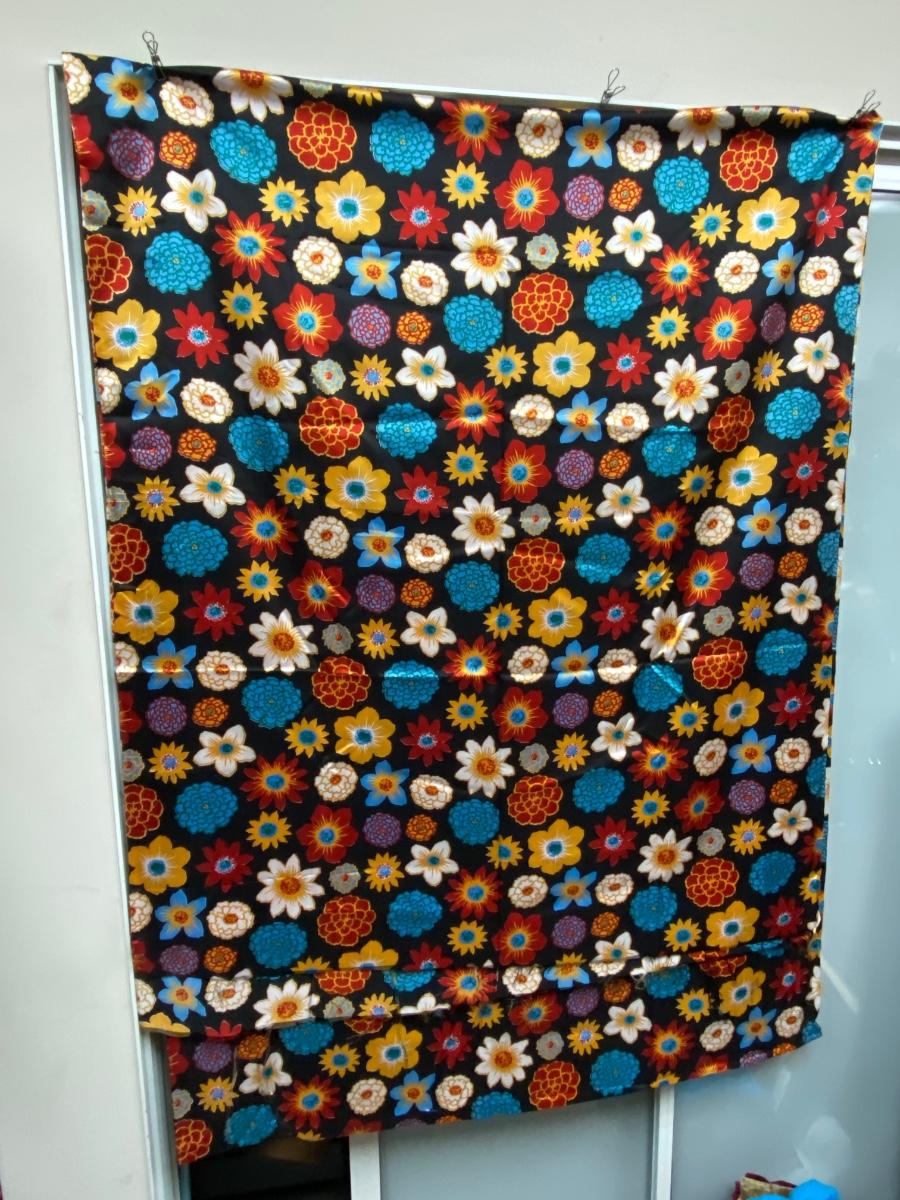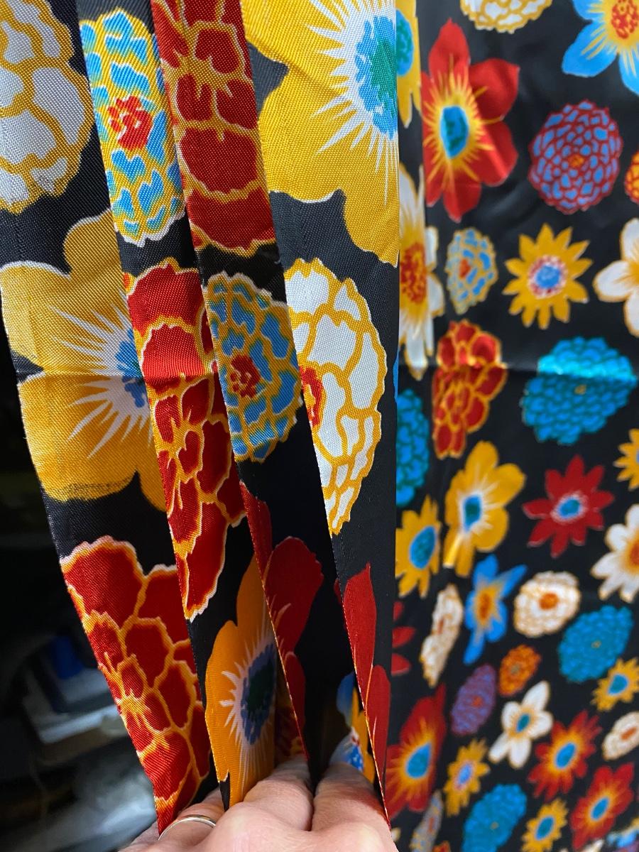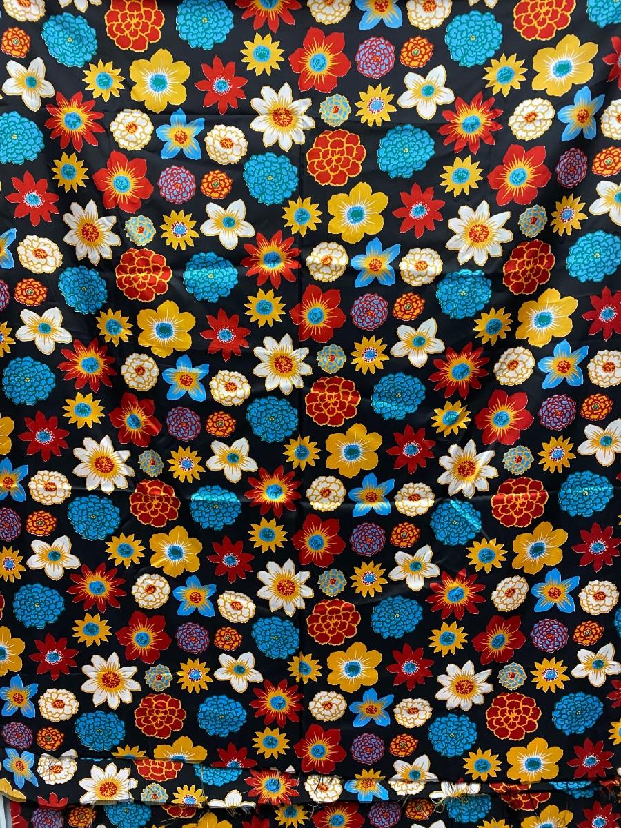 Brightly Colored Floral Flower Material. About 4'x10'. Looks to be in good condition. Has a satin feel to the fabric.