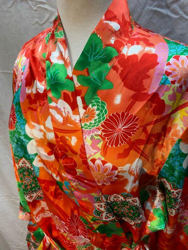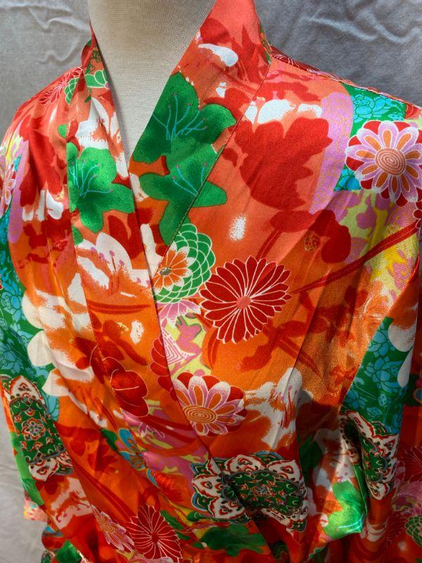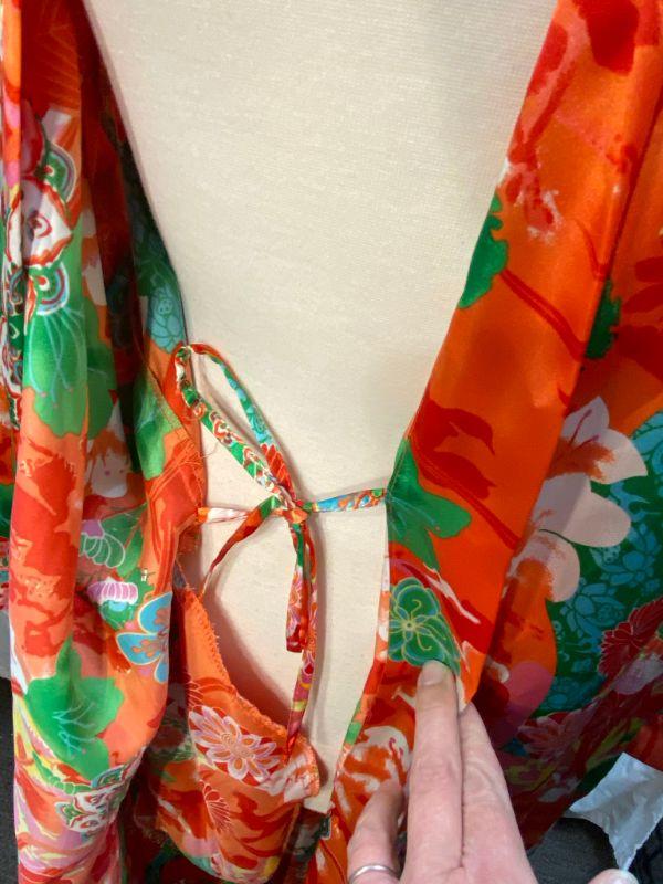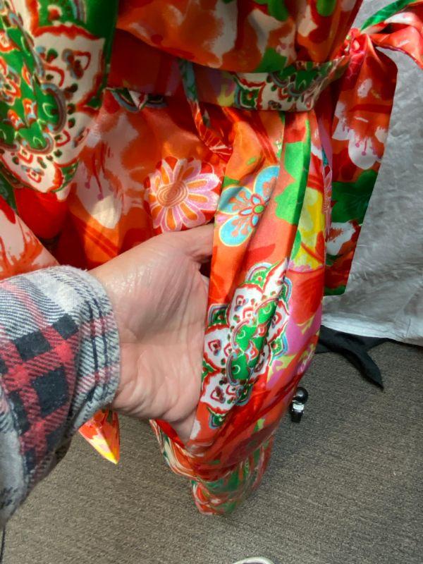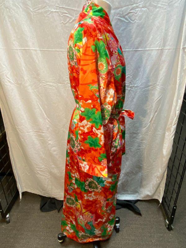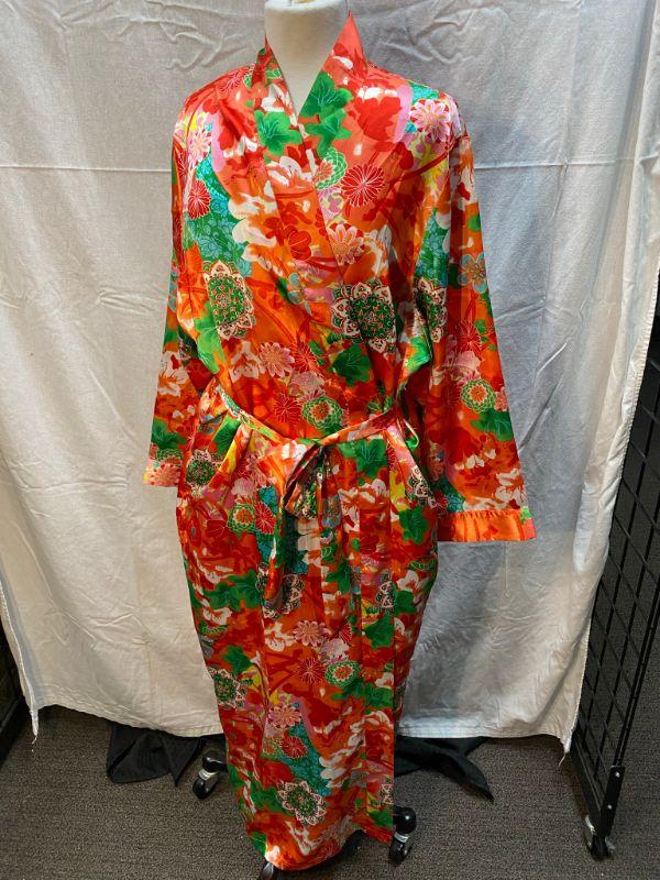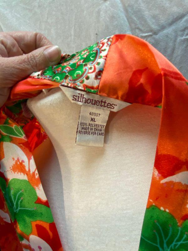 Brightly colored robe by Silhouettes. Floral pattern in bright oranges, reds, and greens. Full length. Has inside tie as well as belt. Size XL. Good condition.