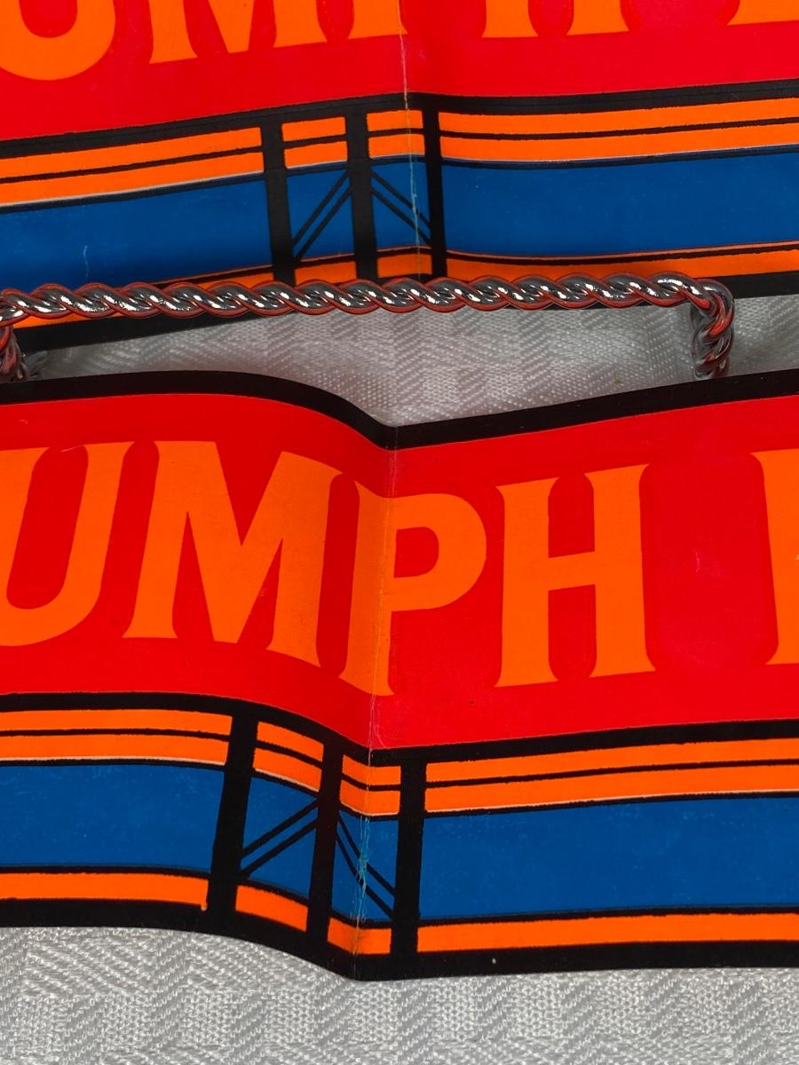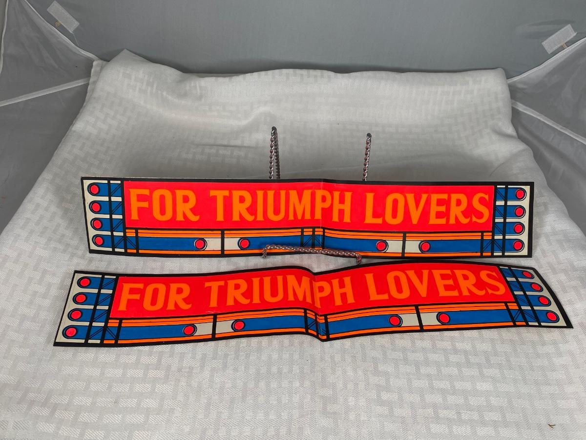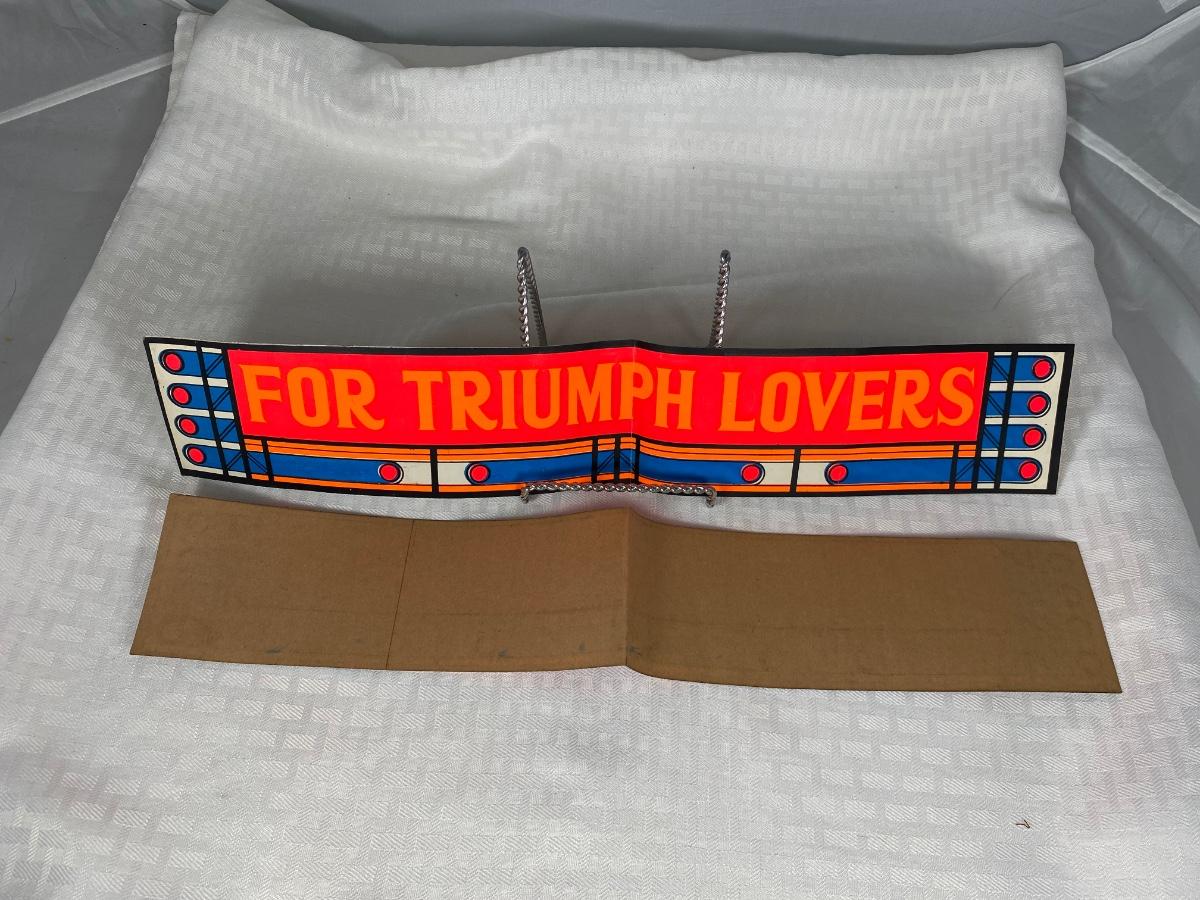 Brightly Colored Retro "For Triumph Lovers" Bumper Stickers. Unsure of their origins, but they are bright. Could be the rock band, could be the motorcycle, could be something else.