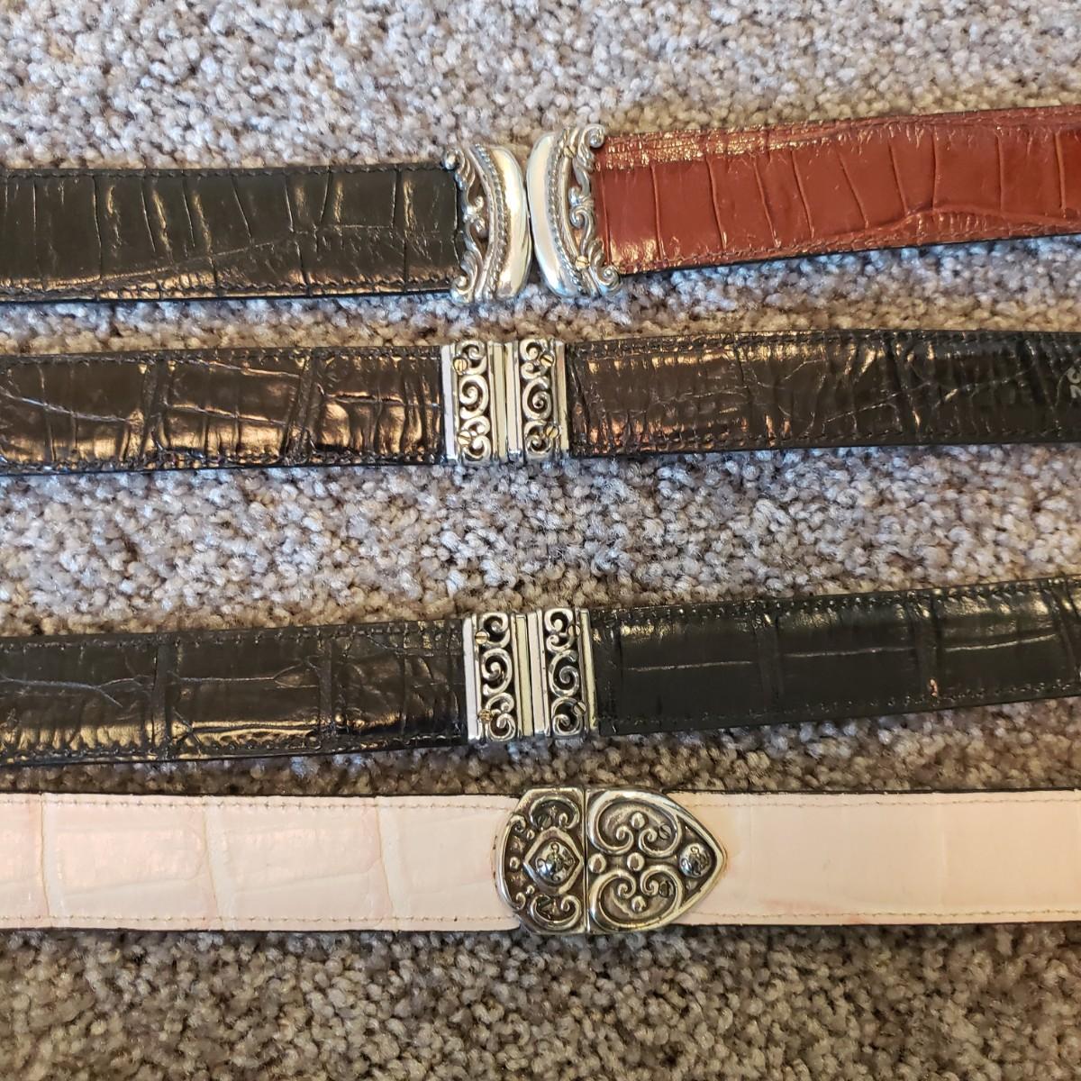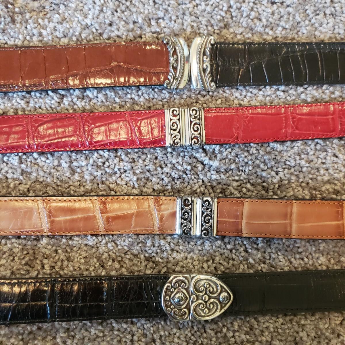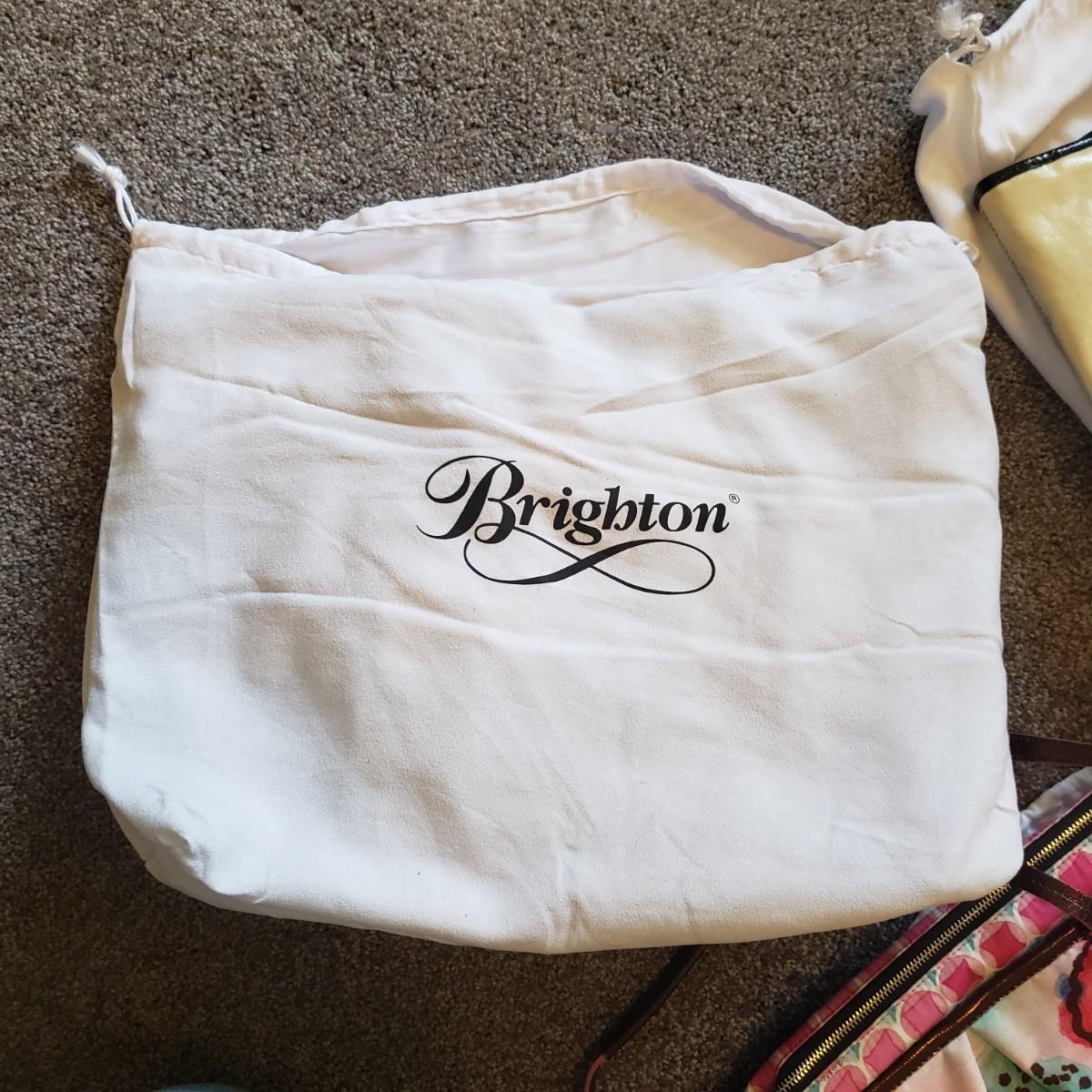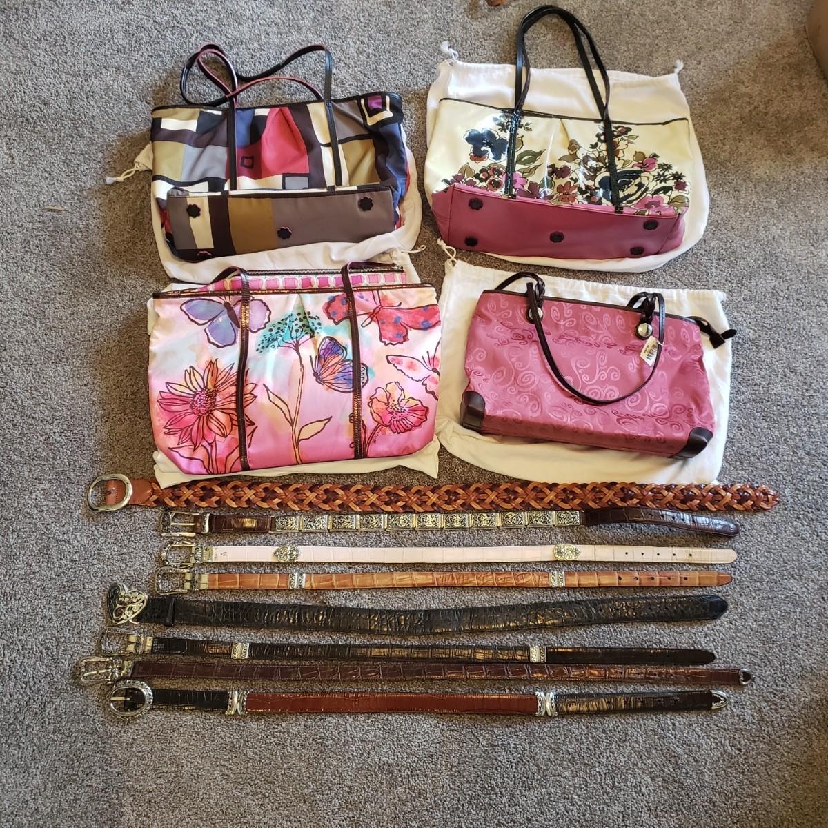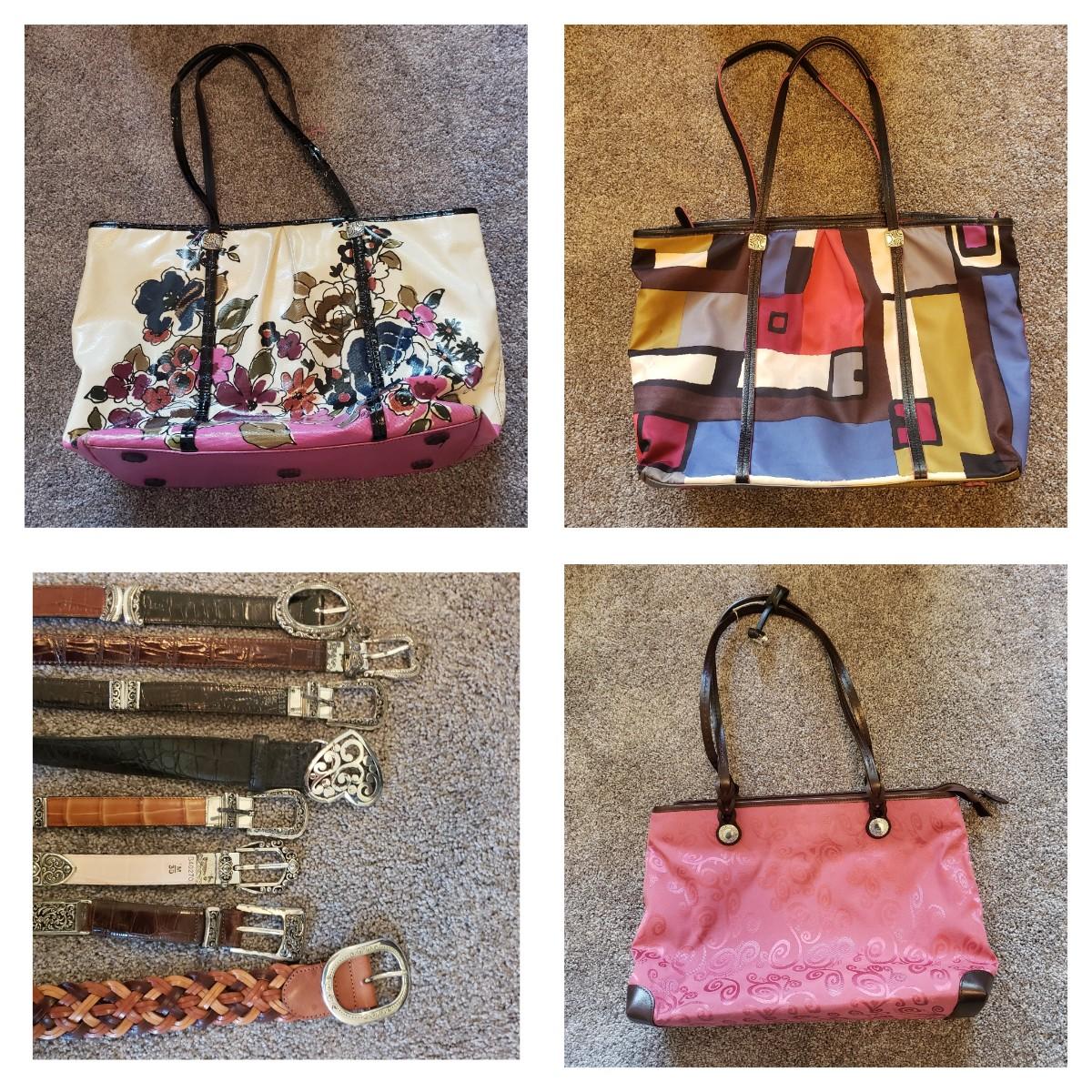 This lot features four Brighton brand bags and eight belts. The bags measure approximately 18" x 6" x 21"H with strap measurement included. Two of the bags have a satiny material, one a canvas and the last is a plastic, waterproof material. The belts appear to be leather with metal features. See pictures for lengths. Four of the belts have a reversible feature, by pulling apart the metal, and turning it, see last pictures for details.