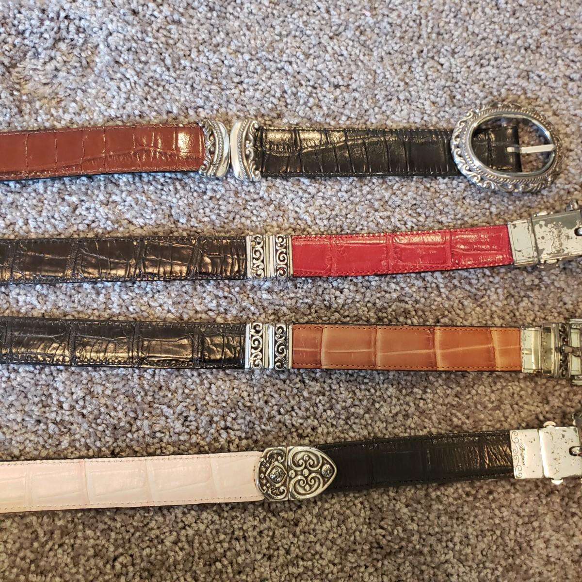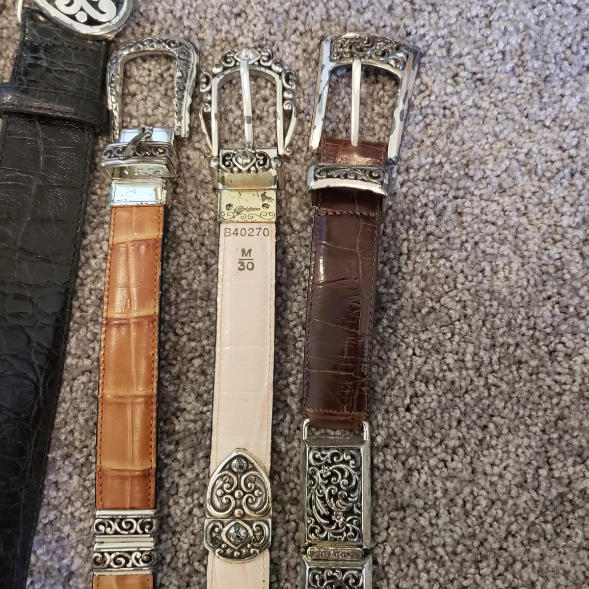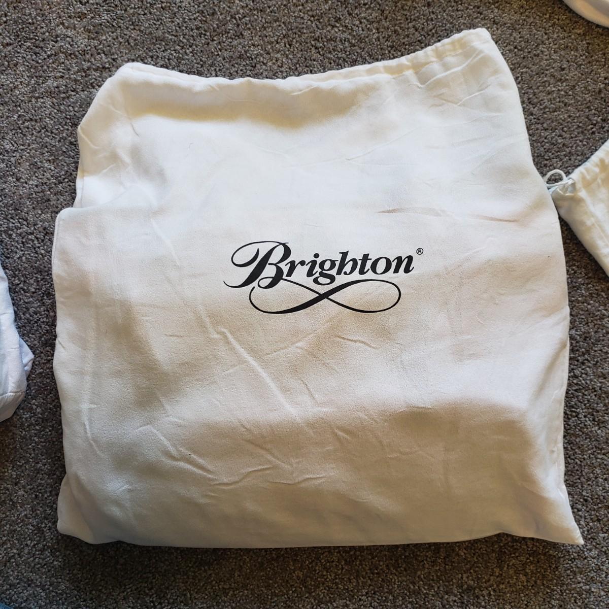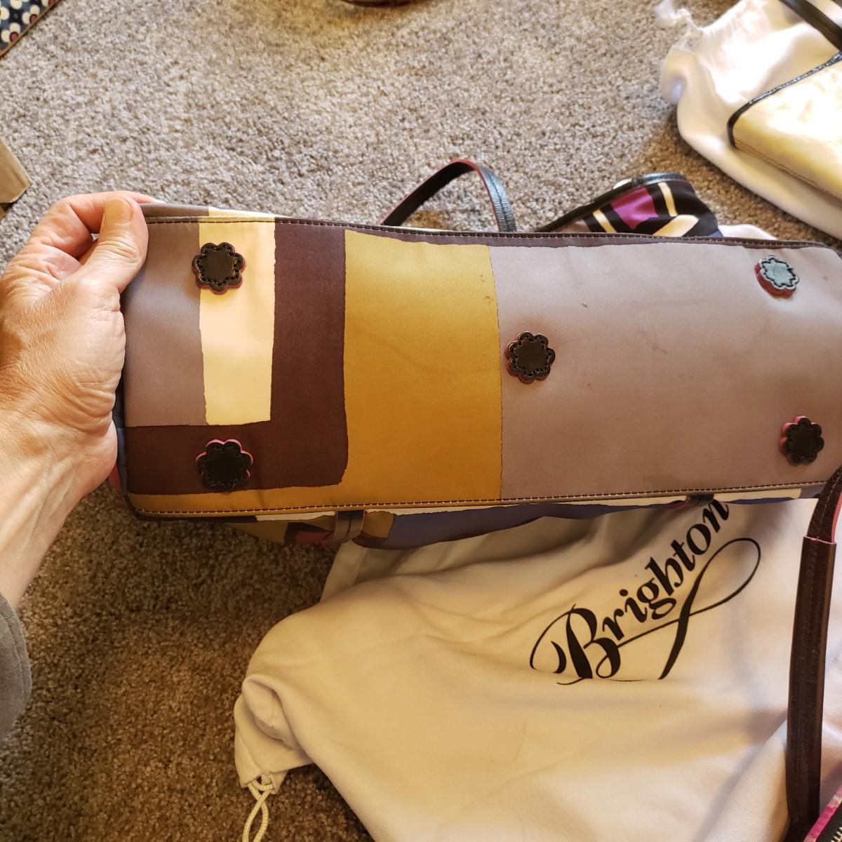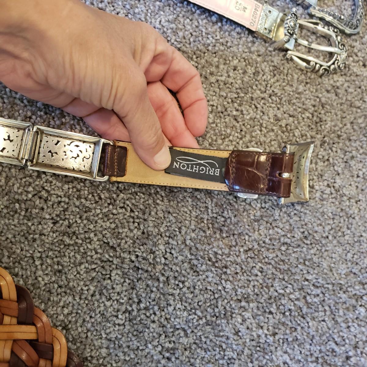 This lot features four Brighton brand bags and eight belts. The bags measure approximately 18" x 6" x 21"H with strap measurement included. Two of the bags have a satiny material, one a canvas and the last is a plastic, waterproof material. The belts appear to be leather with metal features. See pictures for lengths. Four of the belts have a reversible feature, by pulling apart the metal, and turning it, see last pictures for details.