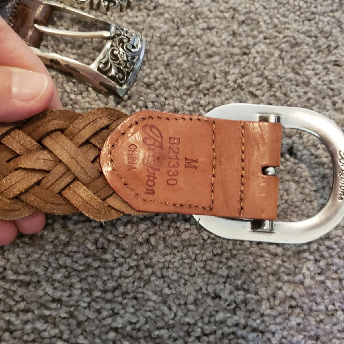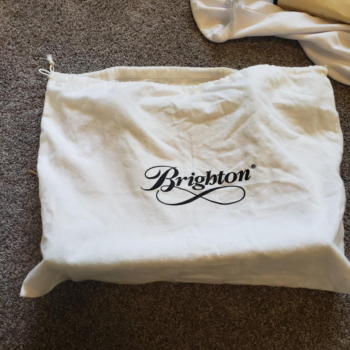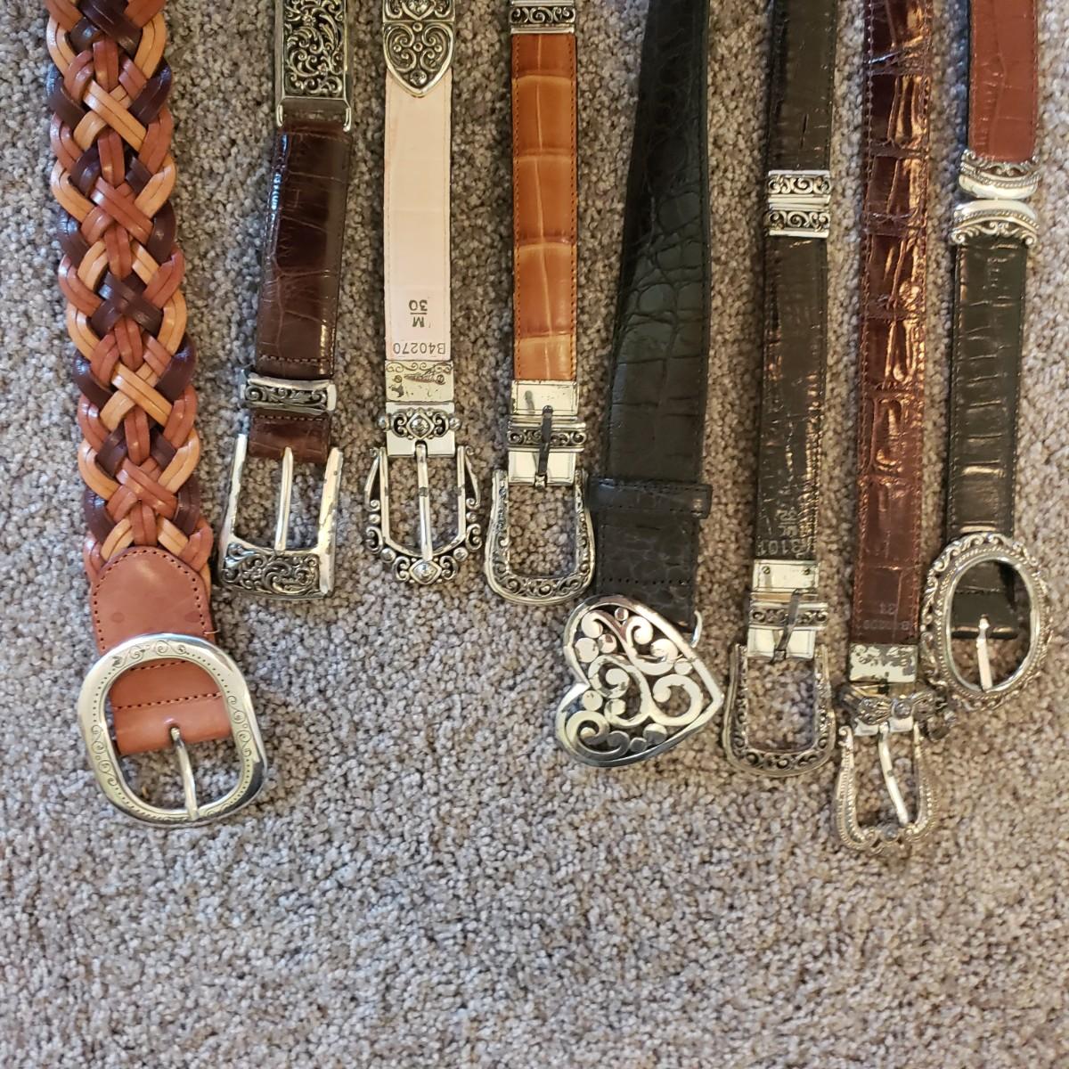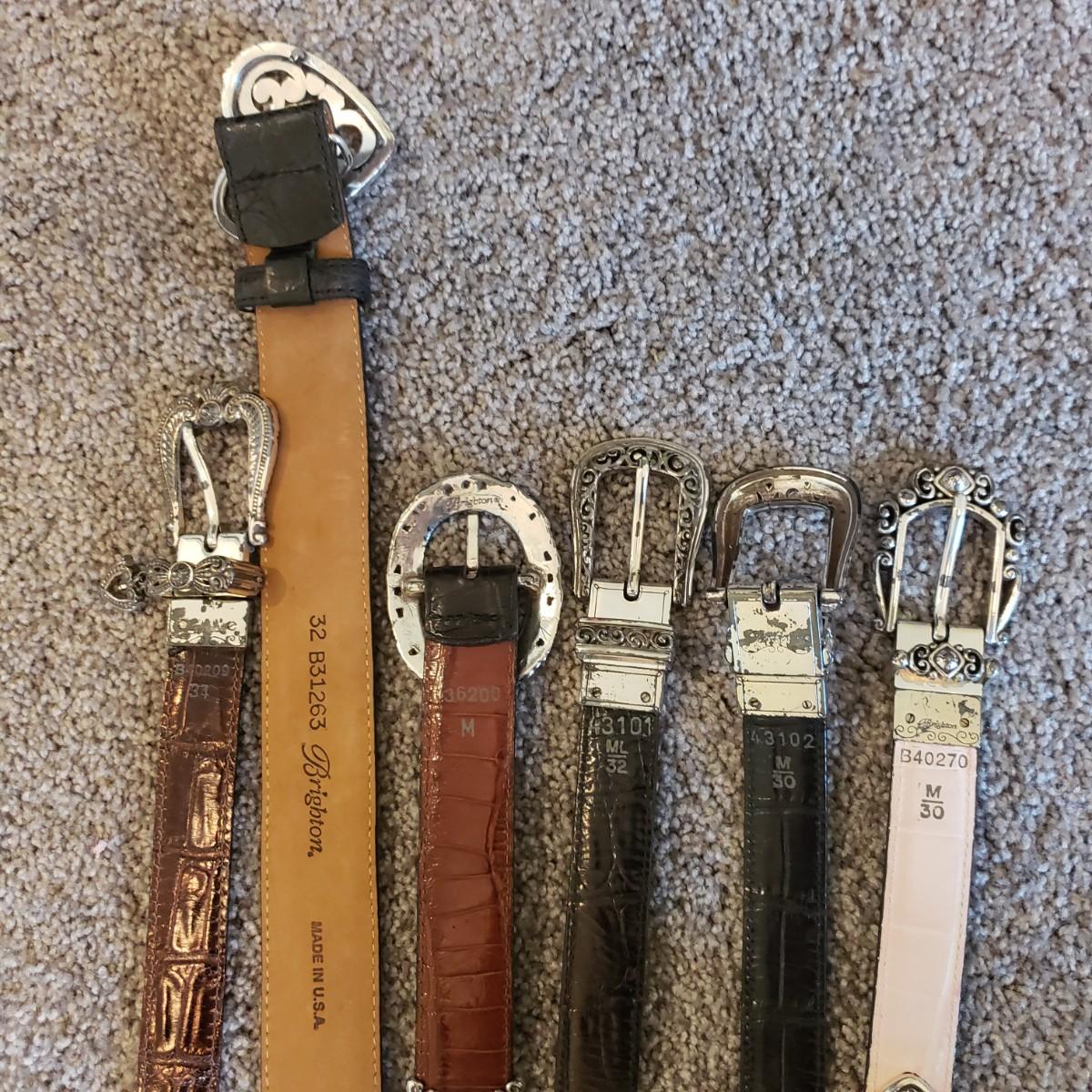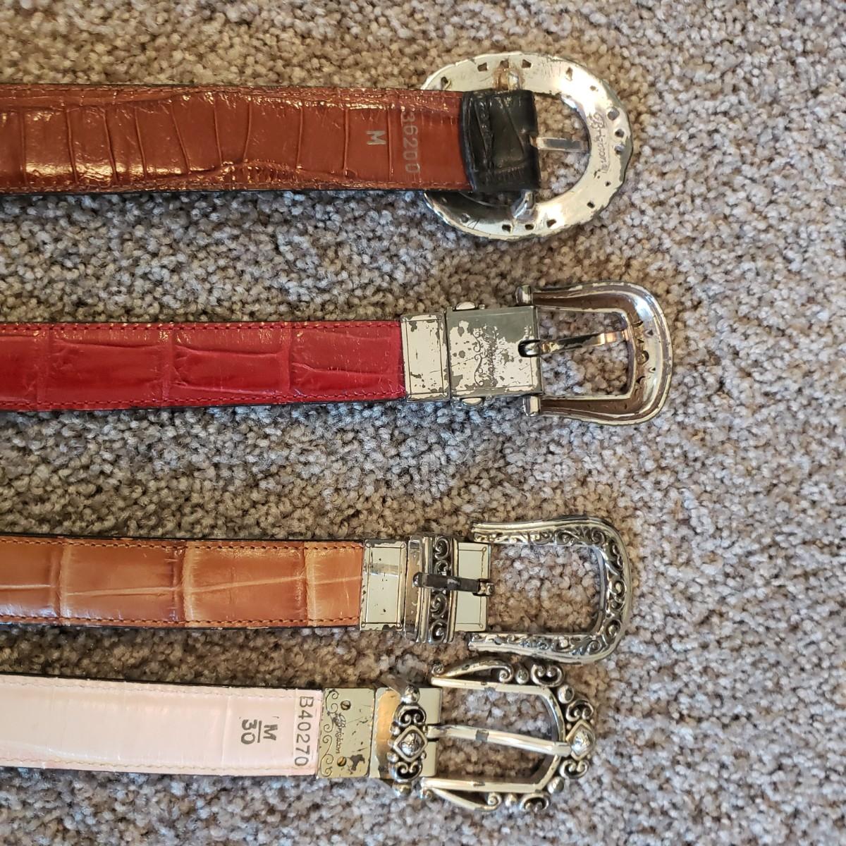 This lot features four Brighton brand bags and eight belts. The bags measure approximately 18" x 6" x 21"H with strap measurement included. Two of the bags have a satiny material, one a canvas and the last is a plastic, waterproof material. The belts appear to be leather with metal features. See pictures for lengths. Four of the belts have a reversible feature, by pulling apart the metal, and turning it, see last pictures for details.