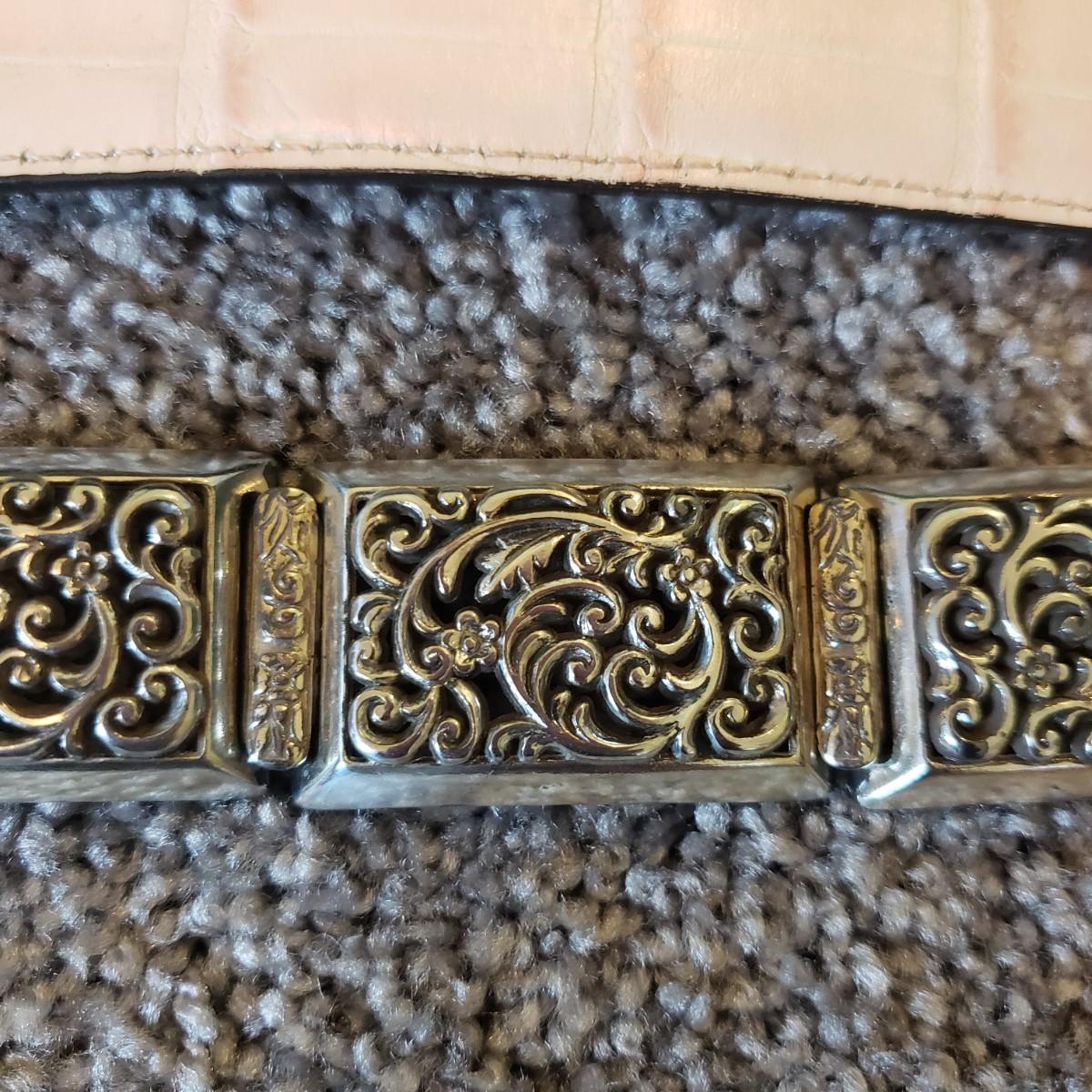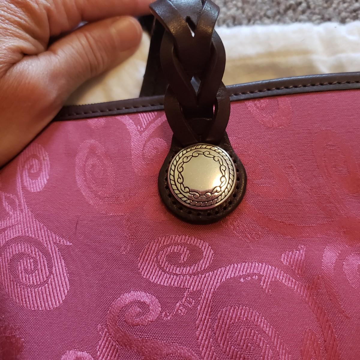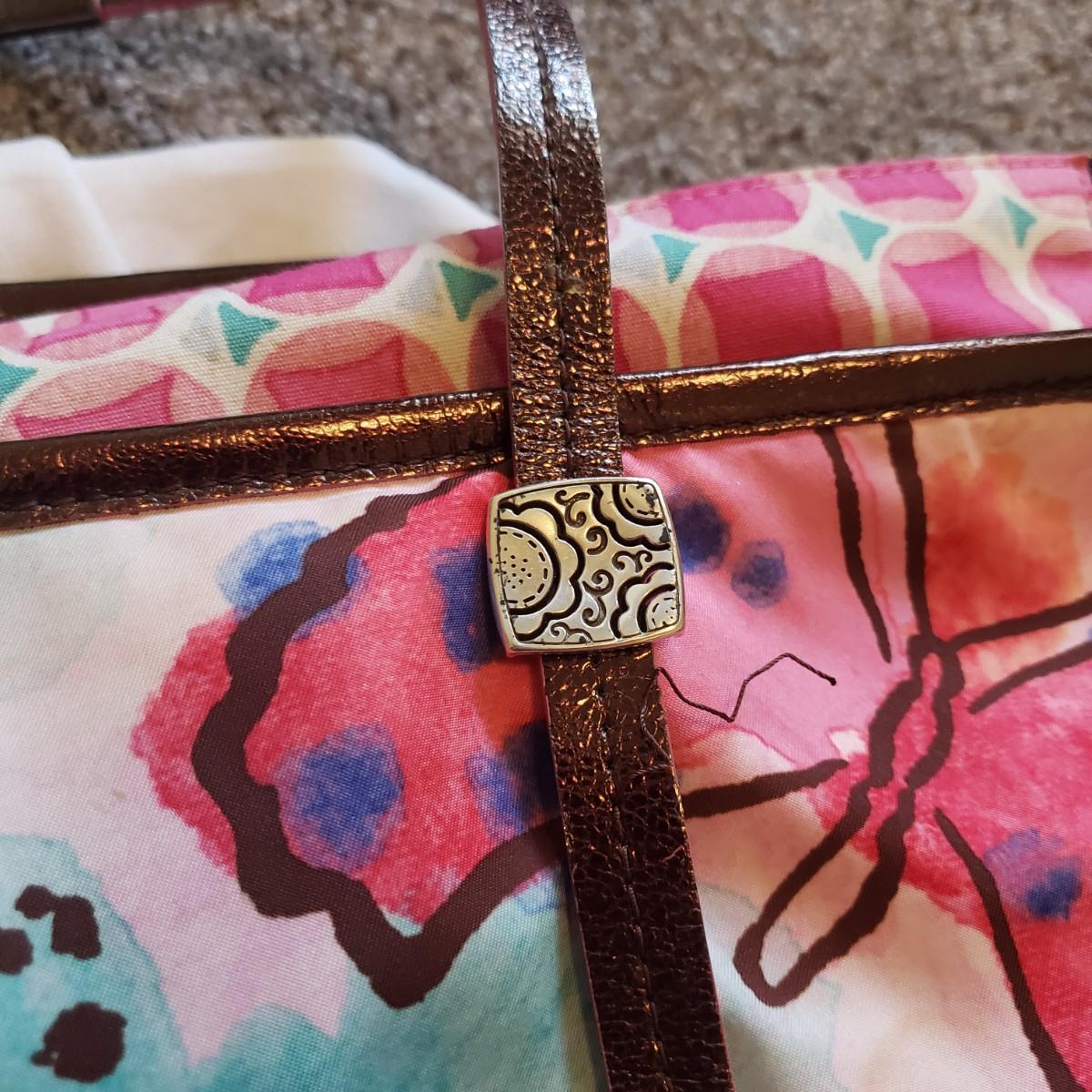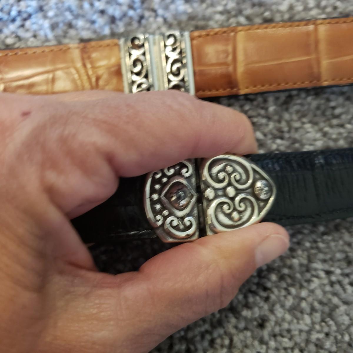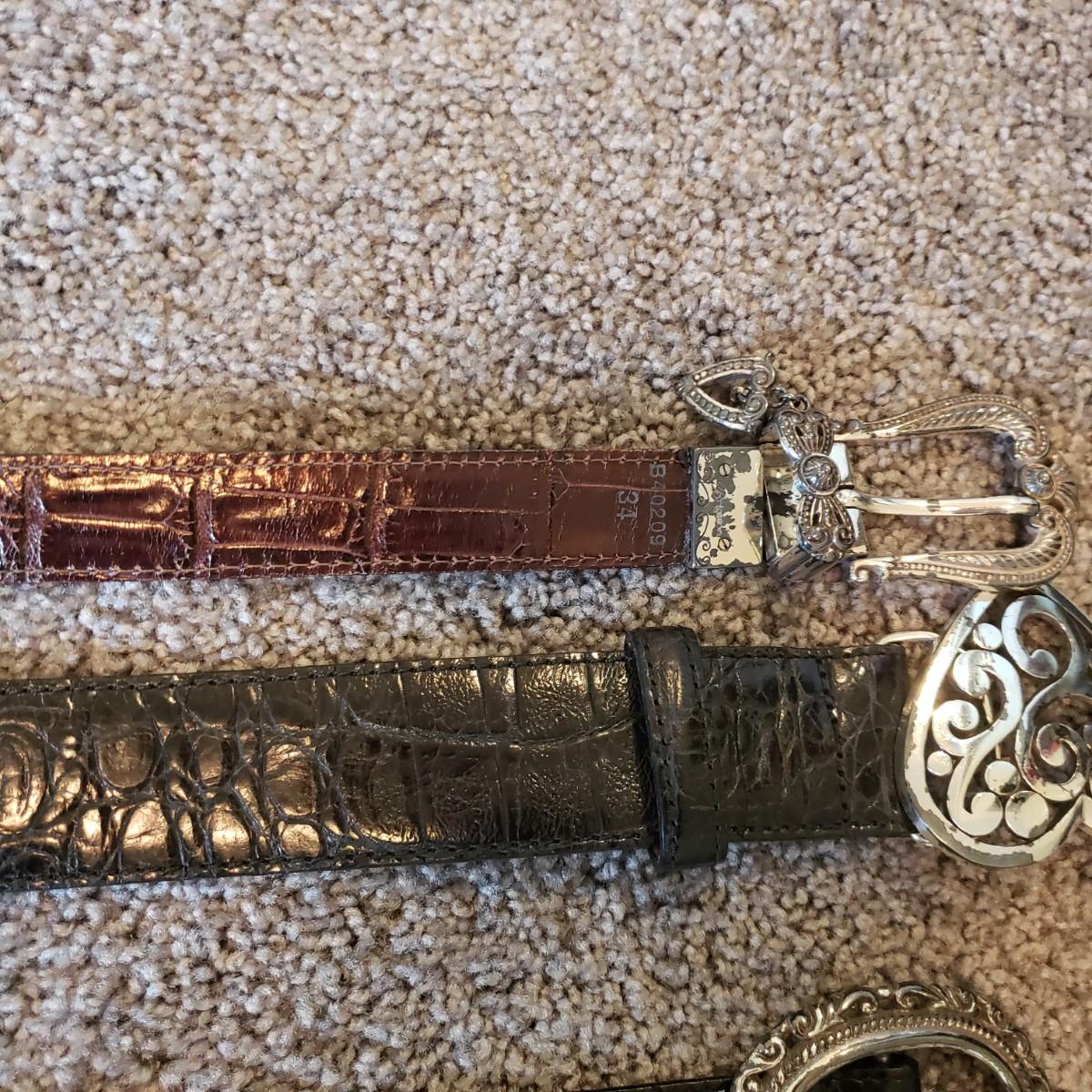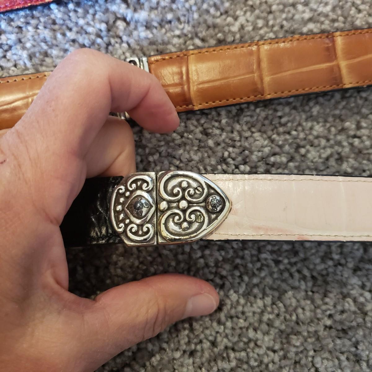 This lot features four Brighton brand bags and eight belts. The bags measure approximately 18" x 6" x 21"H with strap measurement included. Two of the bags have a satiny material, one a canvas and the last is a plastic, waterproof material. The belts appear to be leather with metal features. See pictures for lengths. Four of the belts have a reversible feature, by pulling apart the metal, and turning it, see last pictures for details.