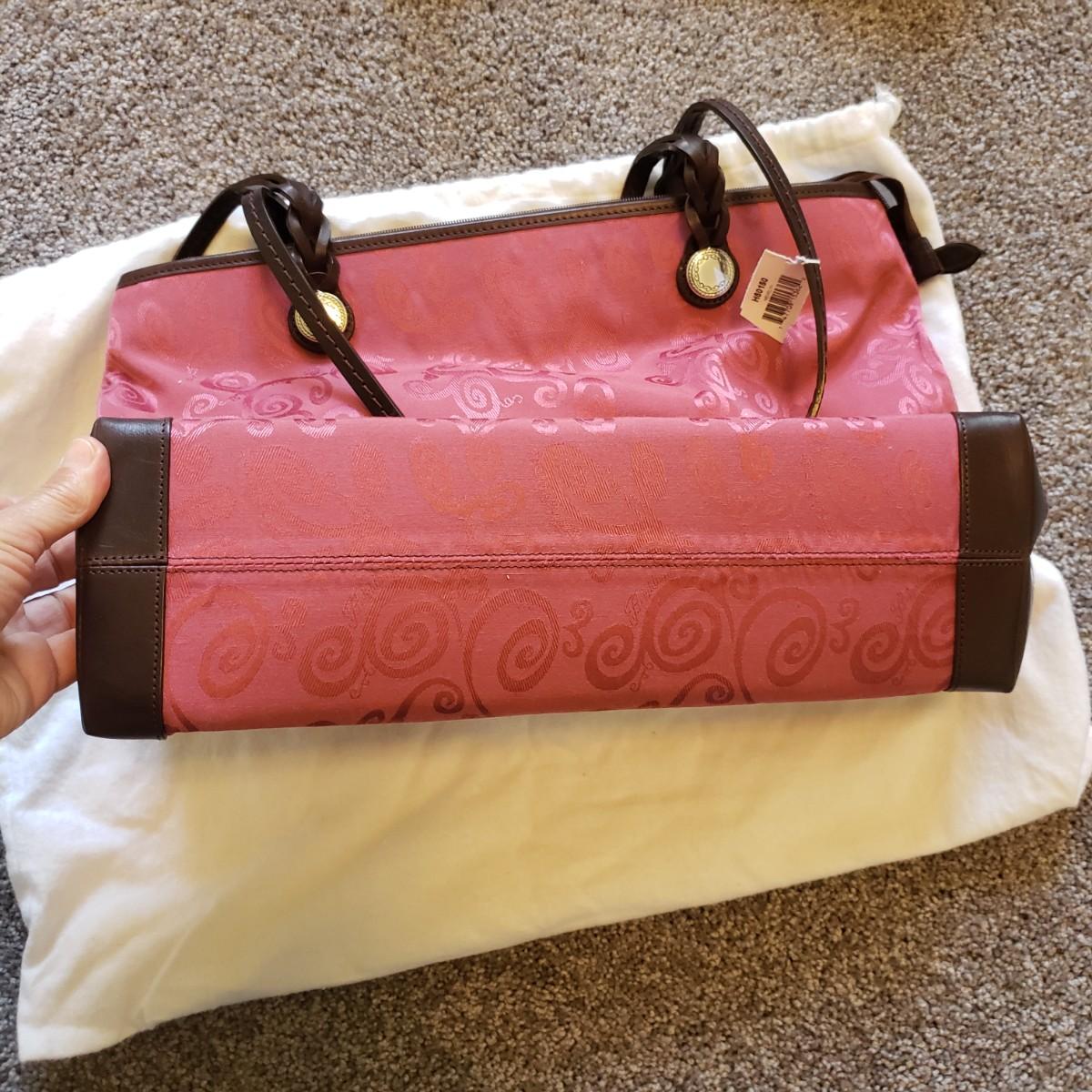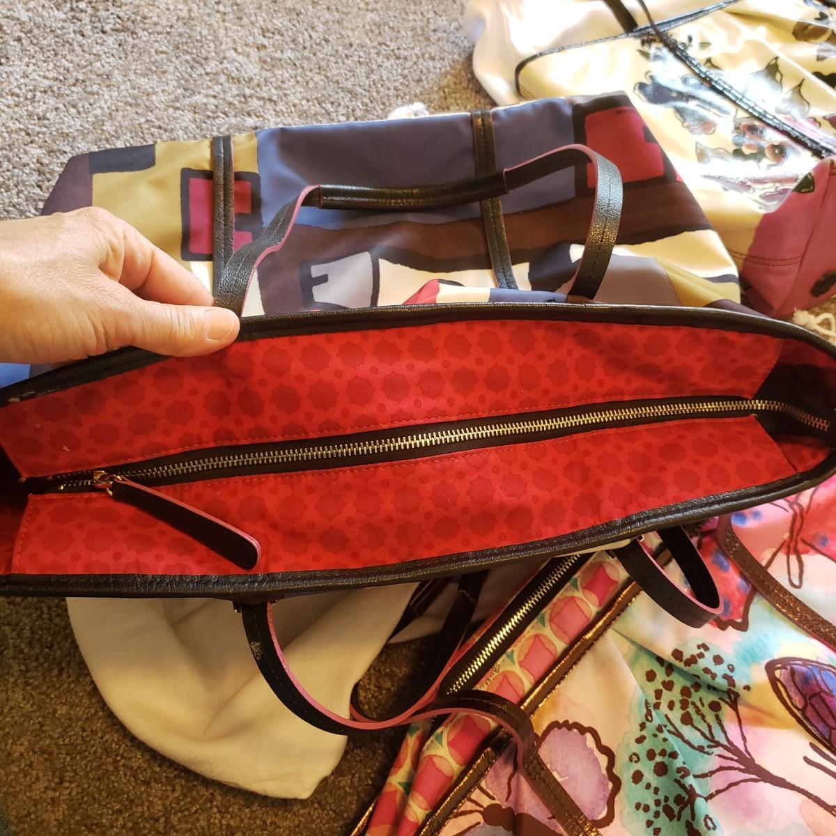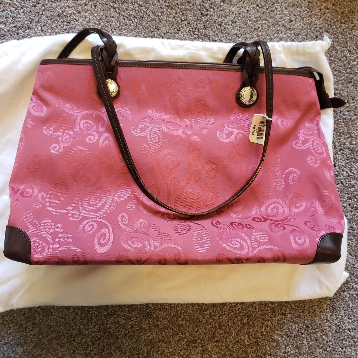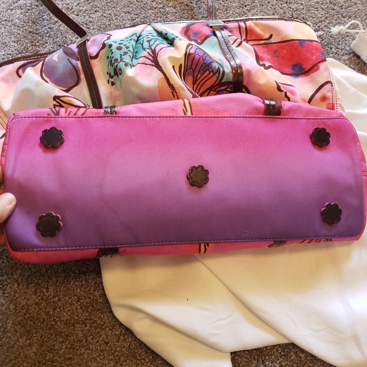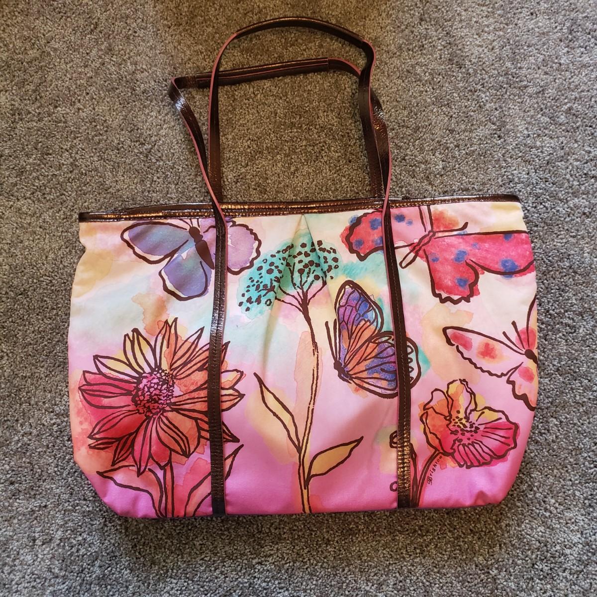 This lot features four Brighton brand bags and eight belts. The bags measure approximately 18" x 6" x 21"H with strap measurement included. Two of the bags have a satiny material, one a canvas and the last is a plastic, waterproof material. The belts appear to be leather with metal features. See pictures for lengths. Four of the belts have a reversible feature, by pulling apart the metal, and turning it, see last pictures for details.