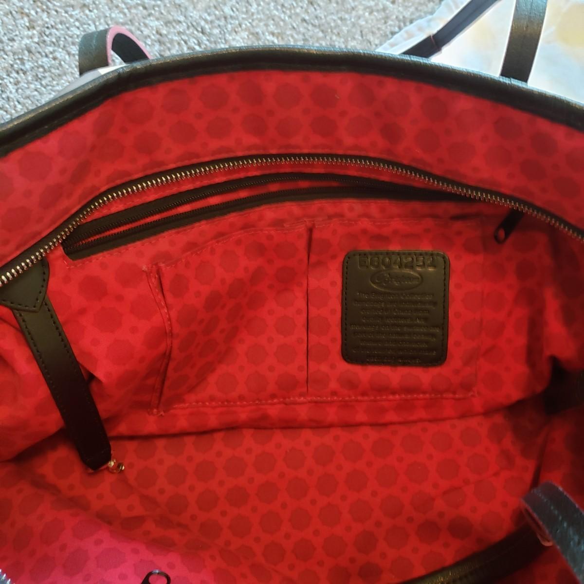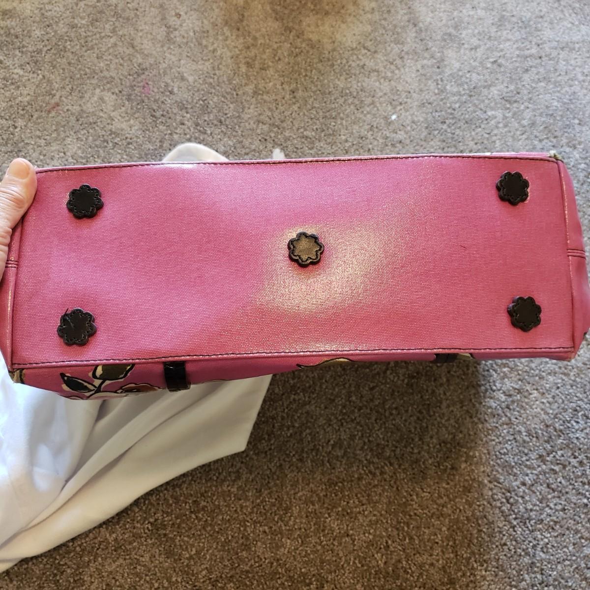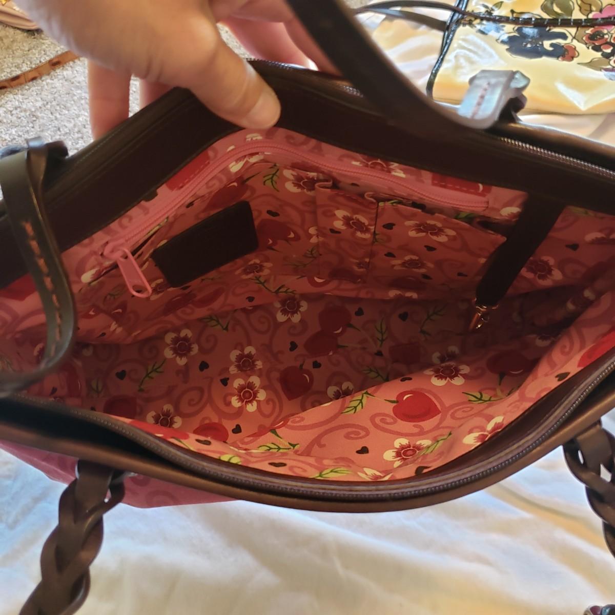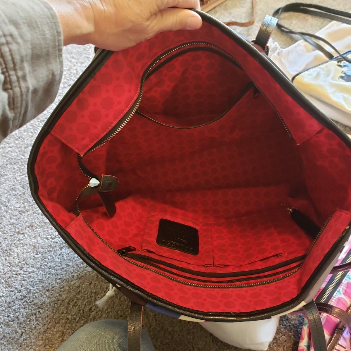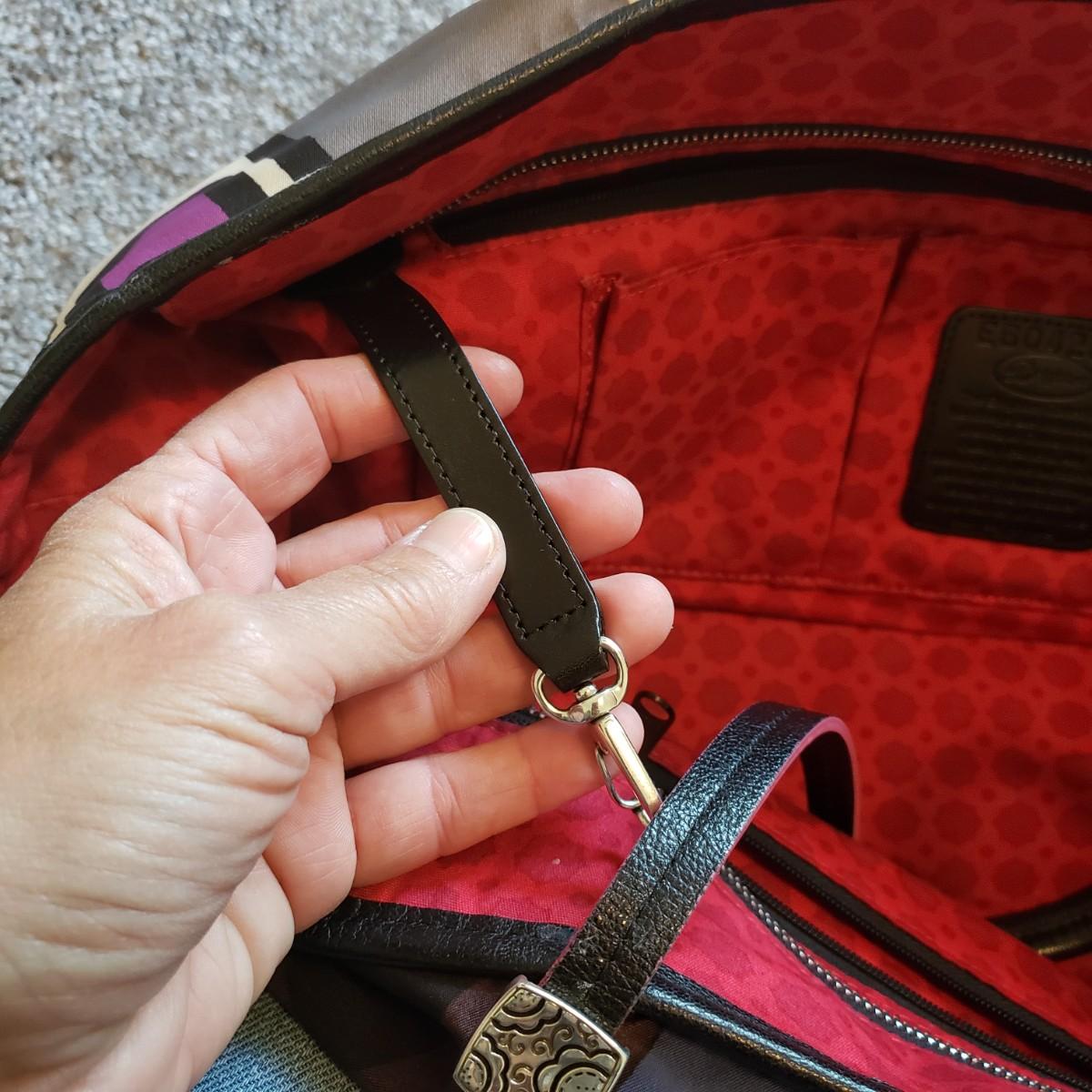This lot features four Brighton brand bags and eight belts. The bags measure approximately 18" x 6" x 21"H with strap measurement included. Two of the bags have a satiny material, one a canvas and the last is a plastic, waterproof material. The belts appear to be leather with metal features. See pictures for lengths. Four of the belts have a reversible feature, by pulling apart the metal, and turning it, see last pictures for details.