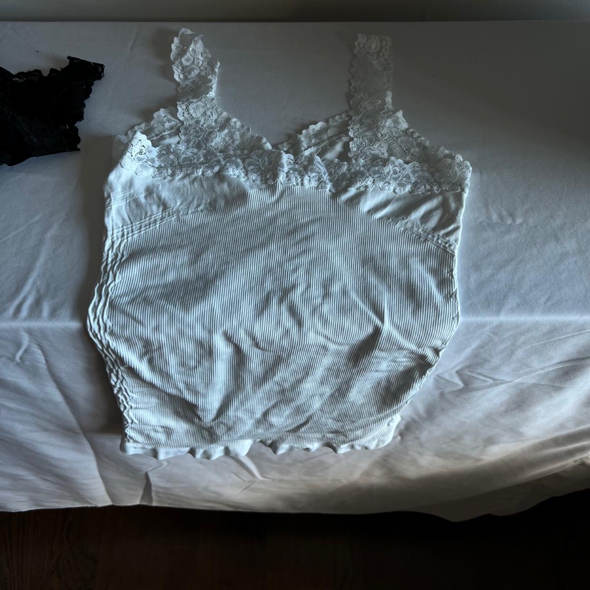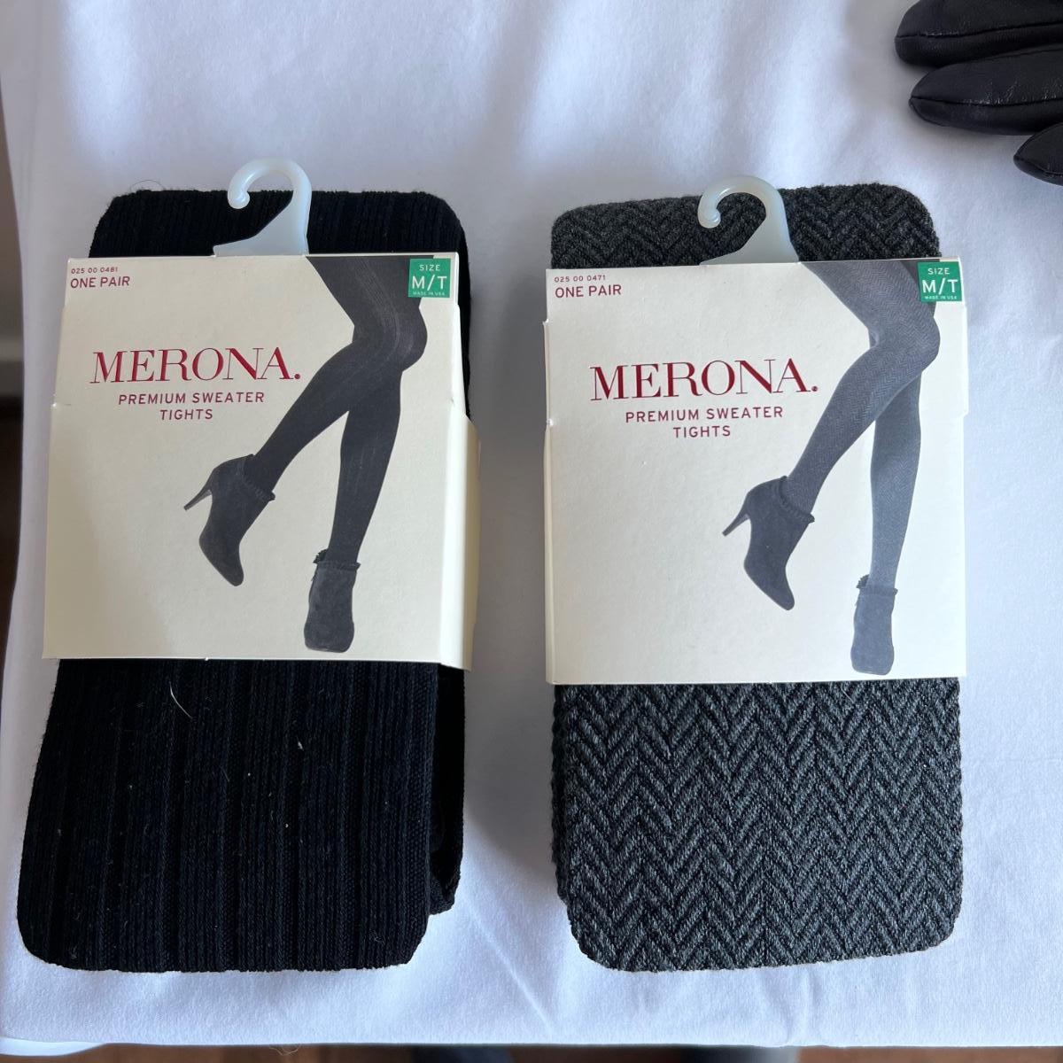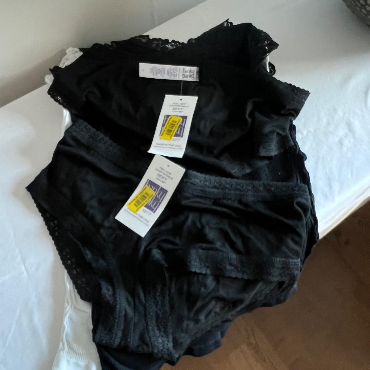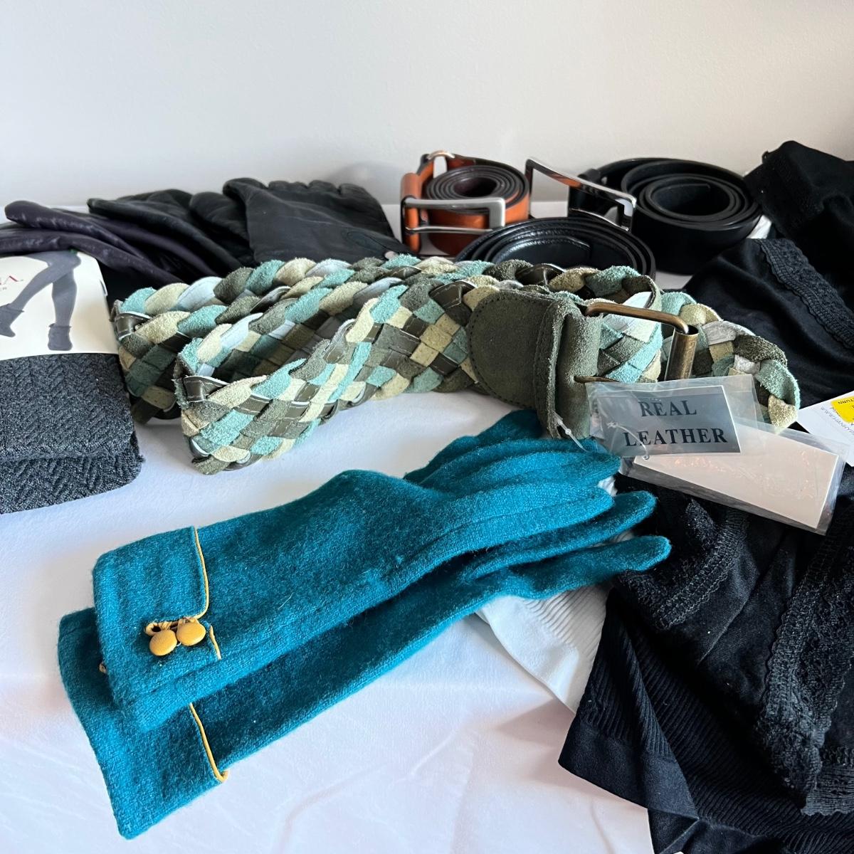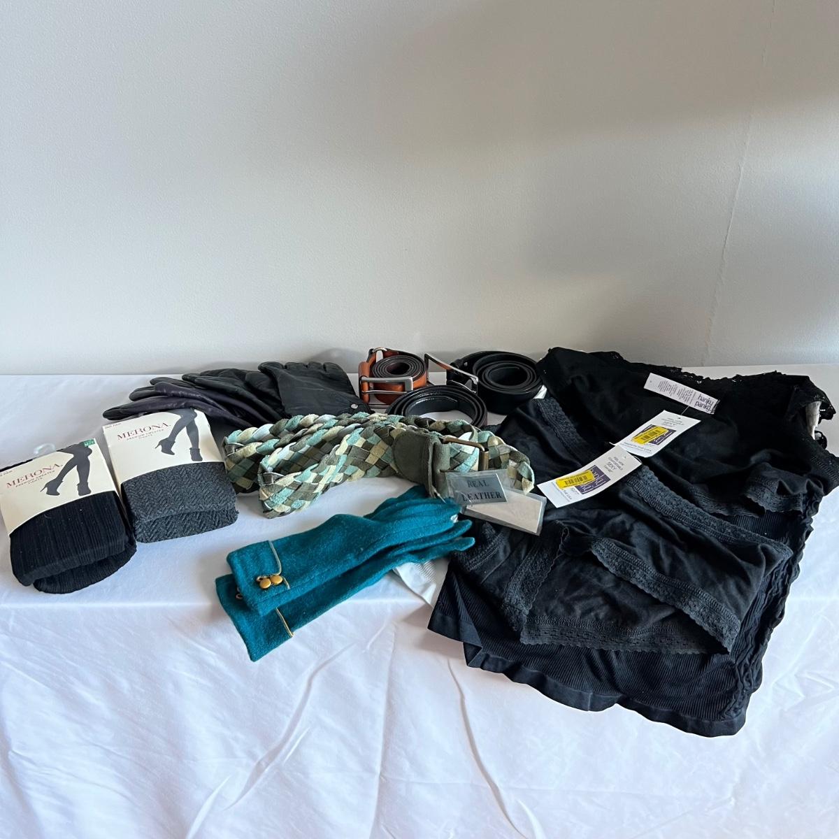 All but the Brighton belt of these four belts is marked "genuine leather", and includes two from Banana Republic and one with no mfg. tag. Gloves also appear to be leather but are unmarked. The bright blue pair are wool. No sizes found on the gloves but they appear to be medium to large in size. Lot also includes two pairs of Hanky Panky underwear and two pairs of Merona tights, all new with tags, as well as two "one size fits all" spandex camisole tops.