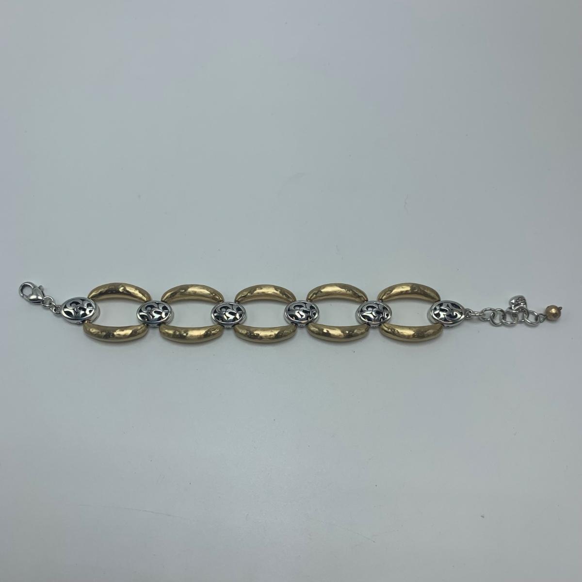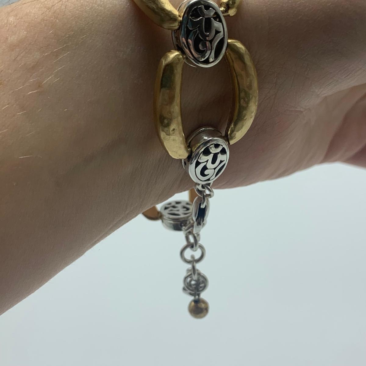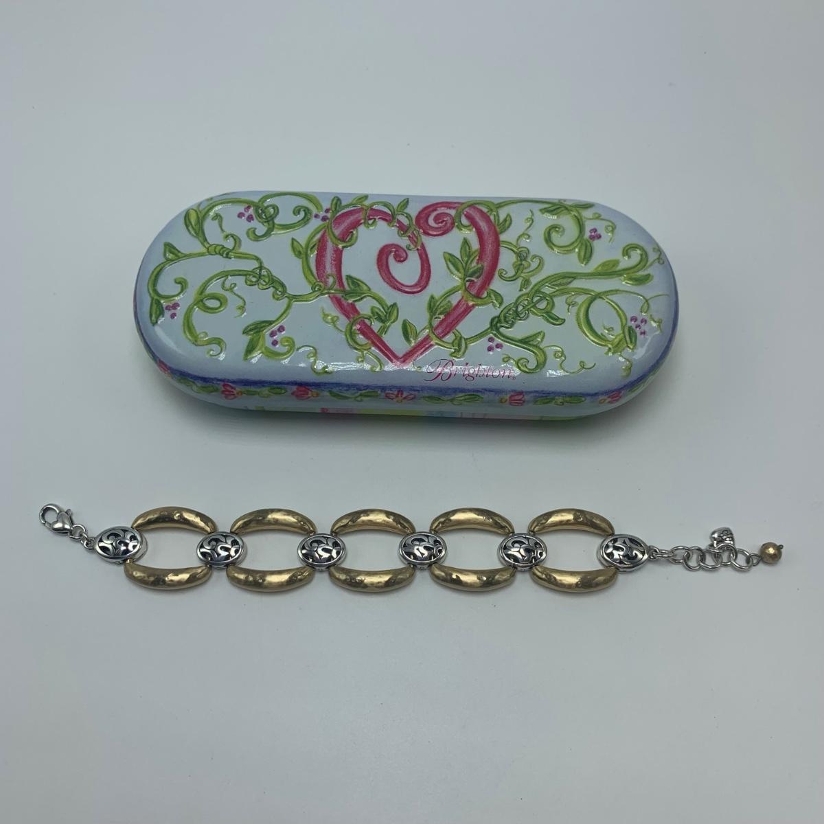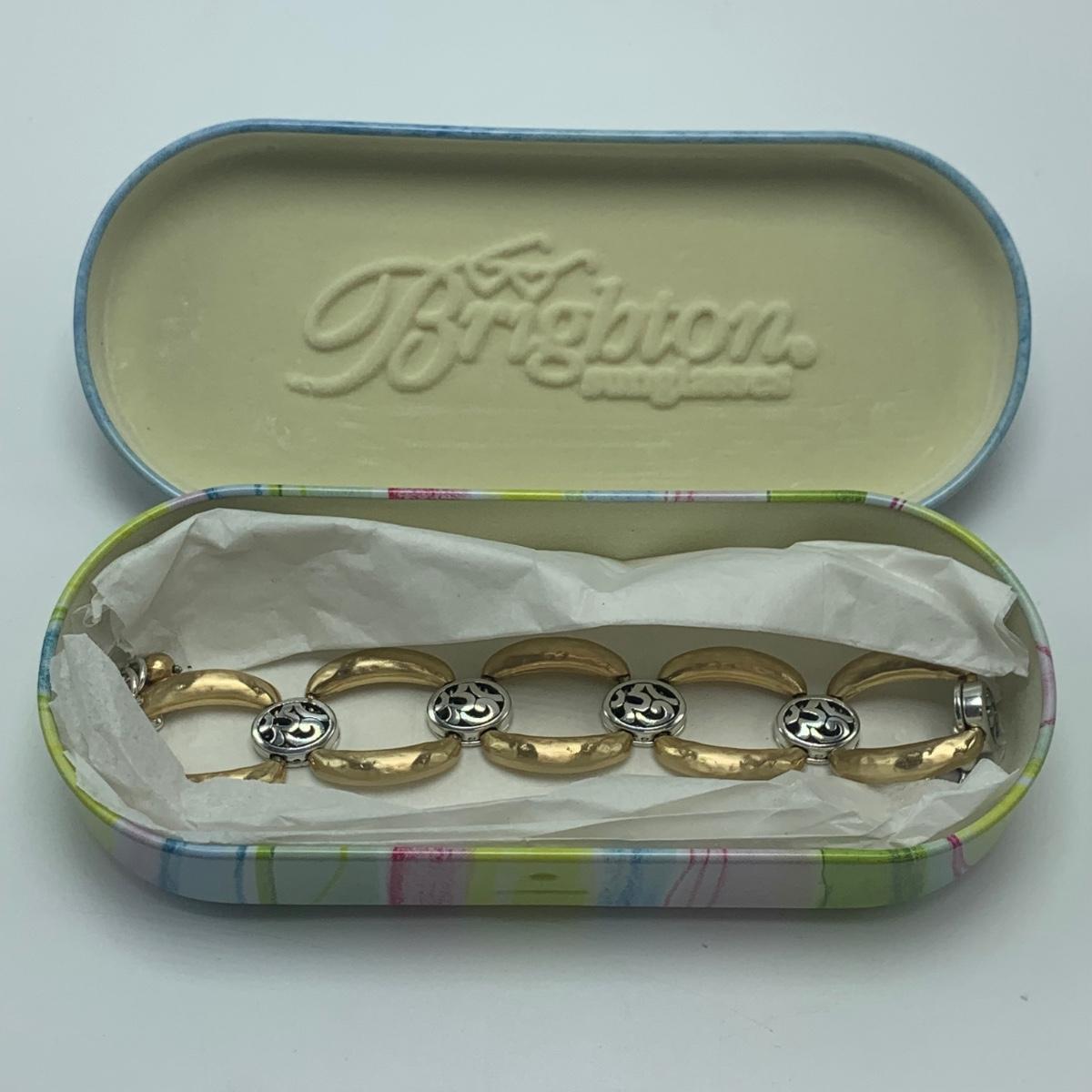 Brighton bracelet is made of gold and silver colored metals. It is approximately 8.5” and is adjustable in length. Metal case is included.