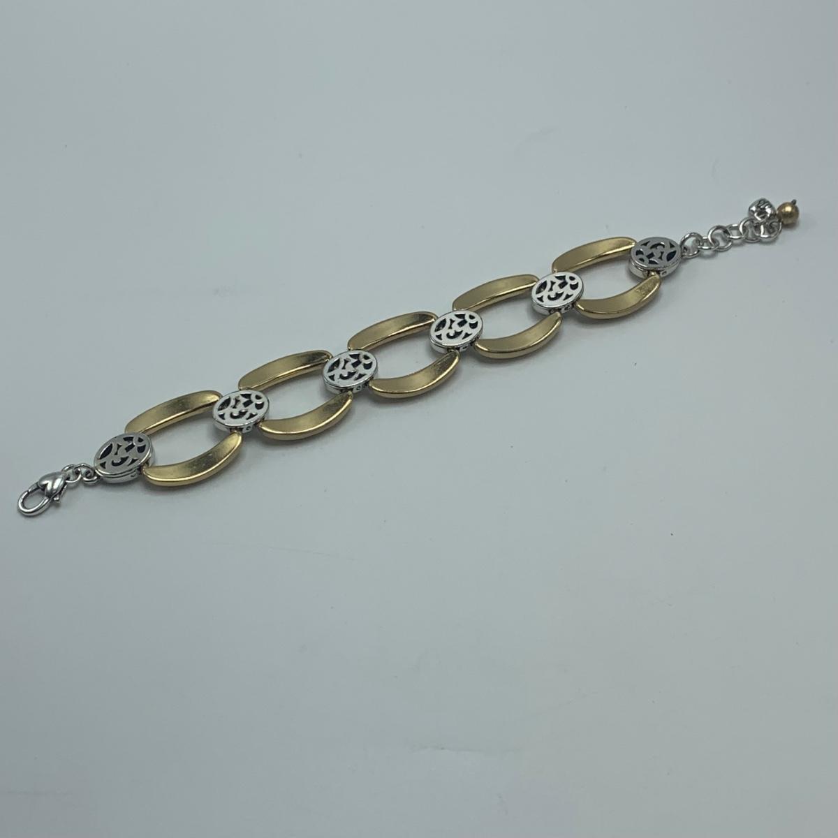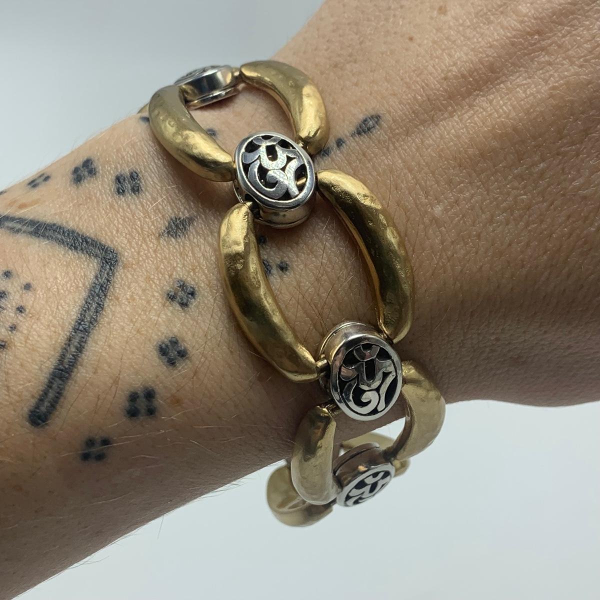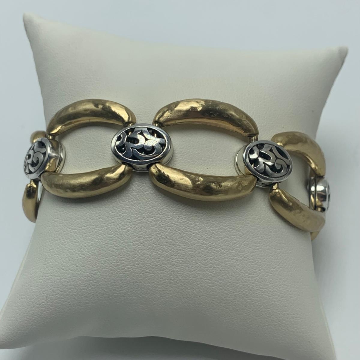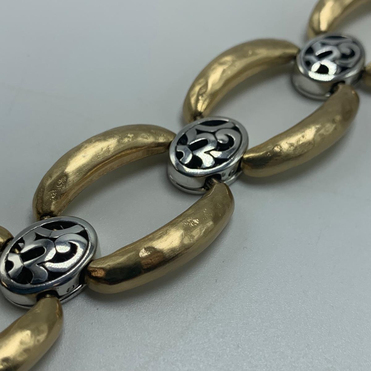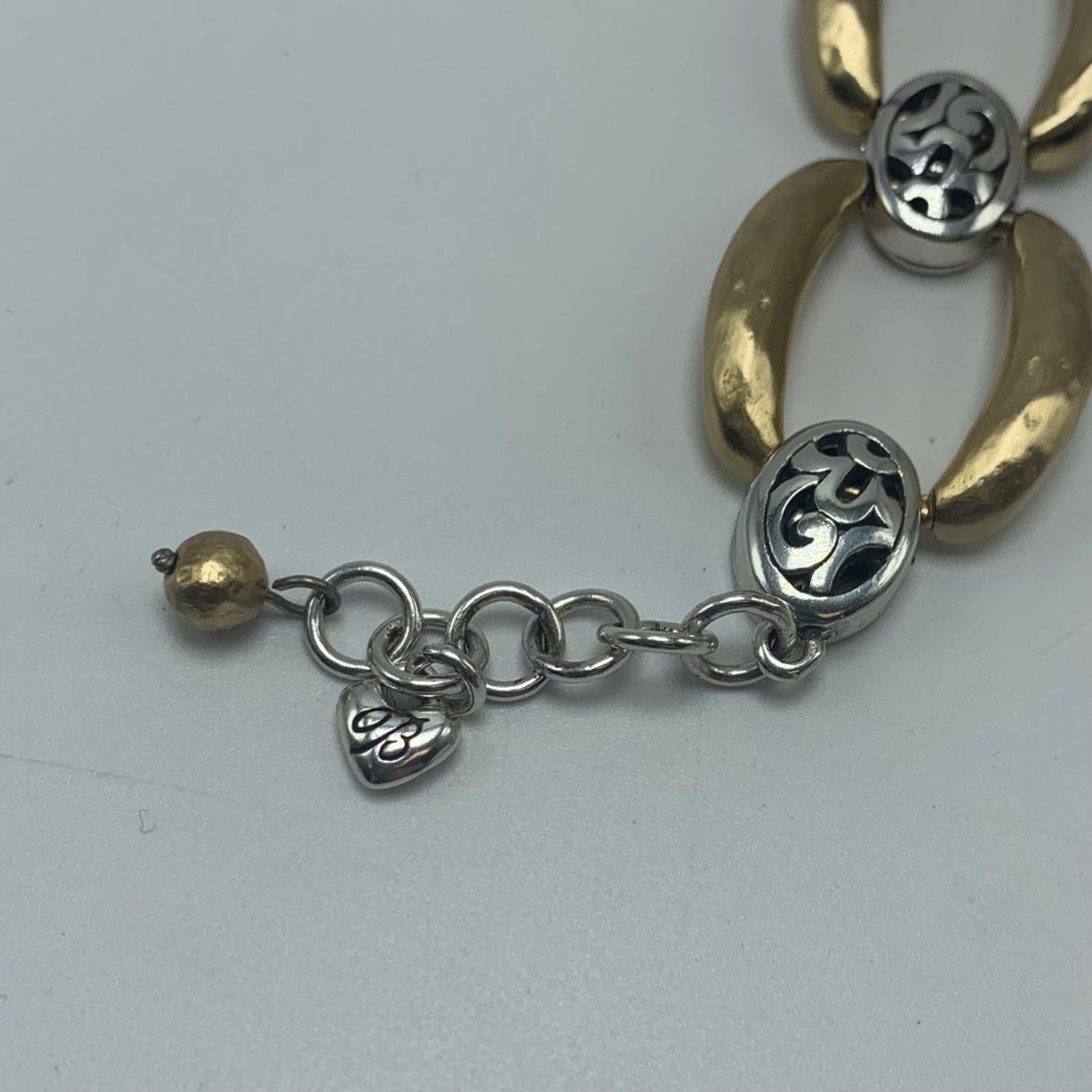 Brighton bracelet is made of gold and silver colored metals. It is approximately 8.5” and is adjustable in length. Metal case is included.