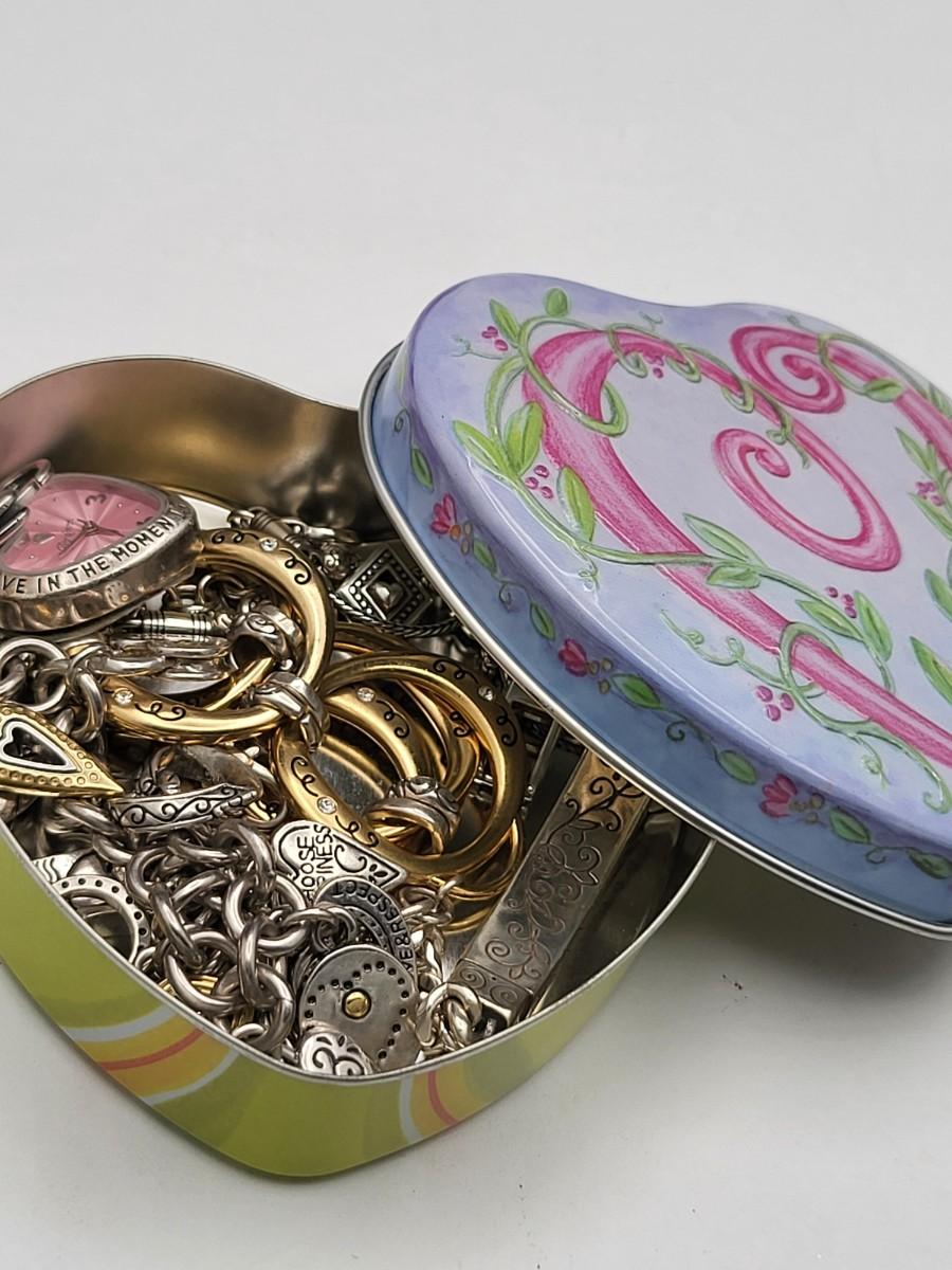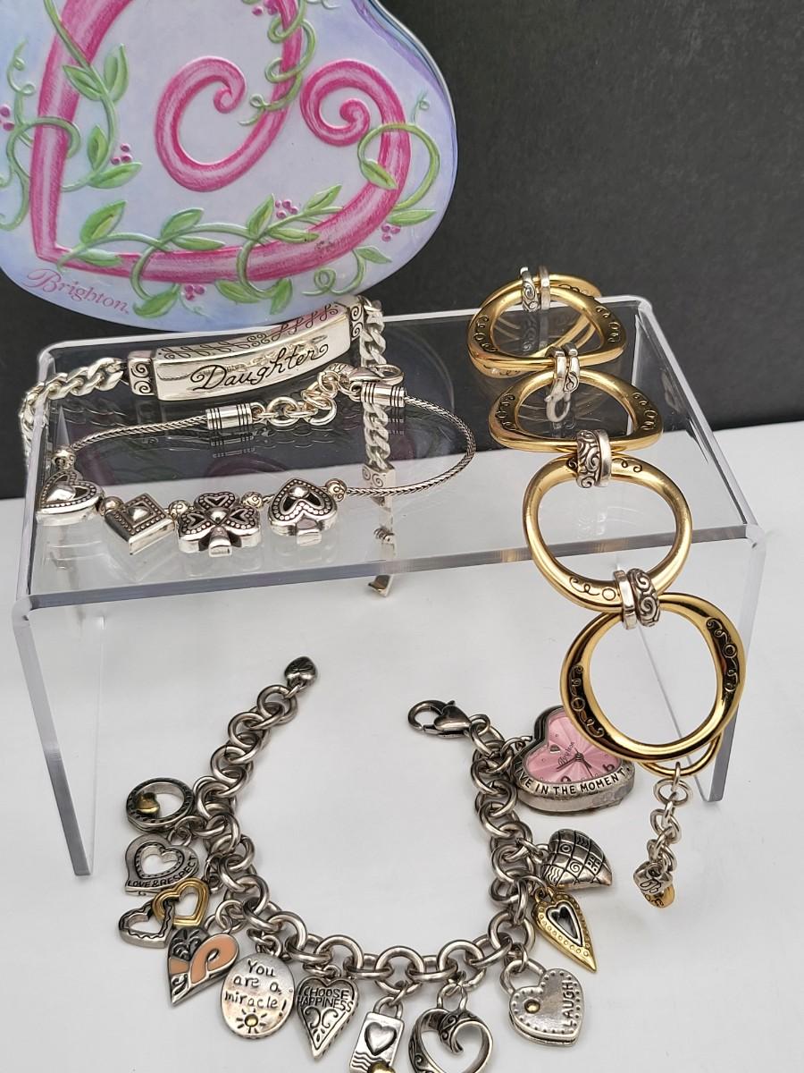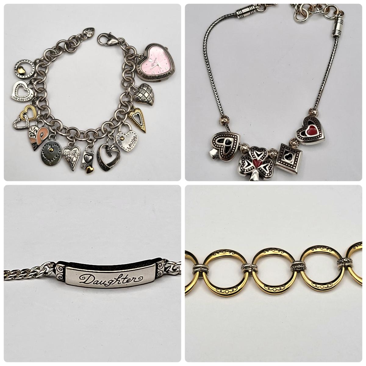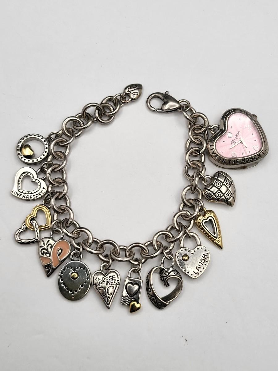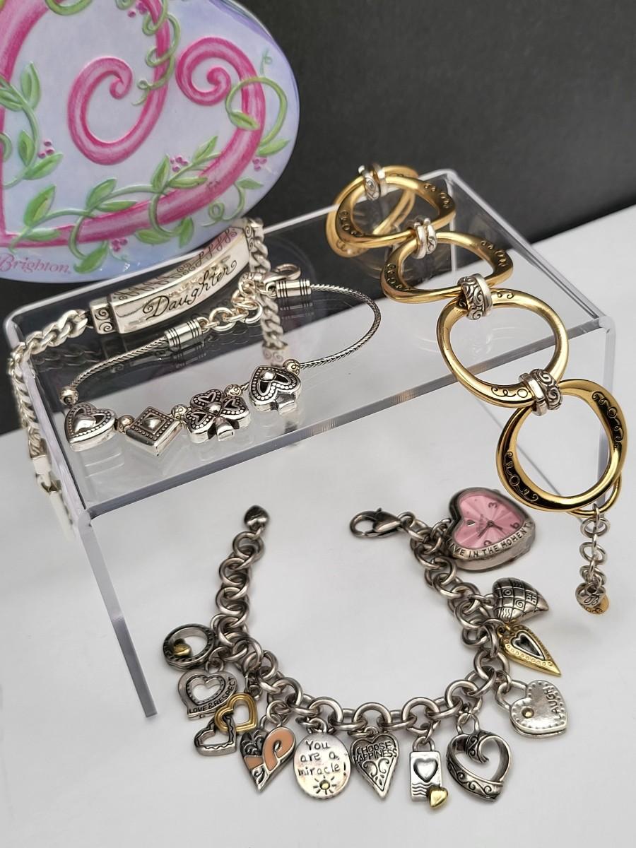Four various Brighton brand 7.5" bracelets.heart charms. Watch does need new battery.