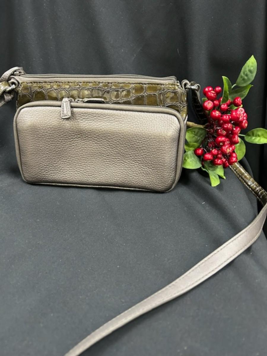 Taupe metallic/brown faux croc bag. Exterior front has a magnetic flap pocket,