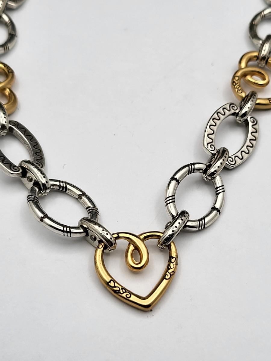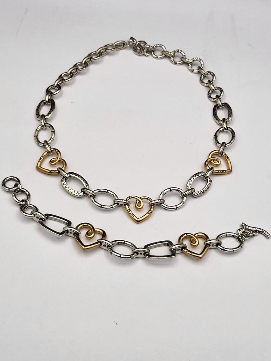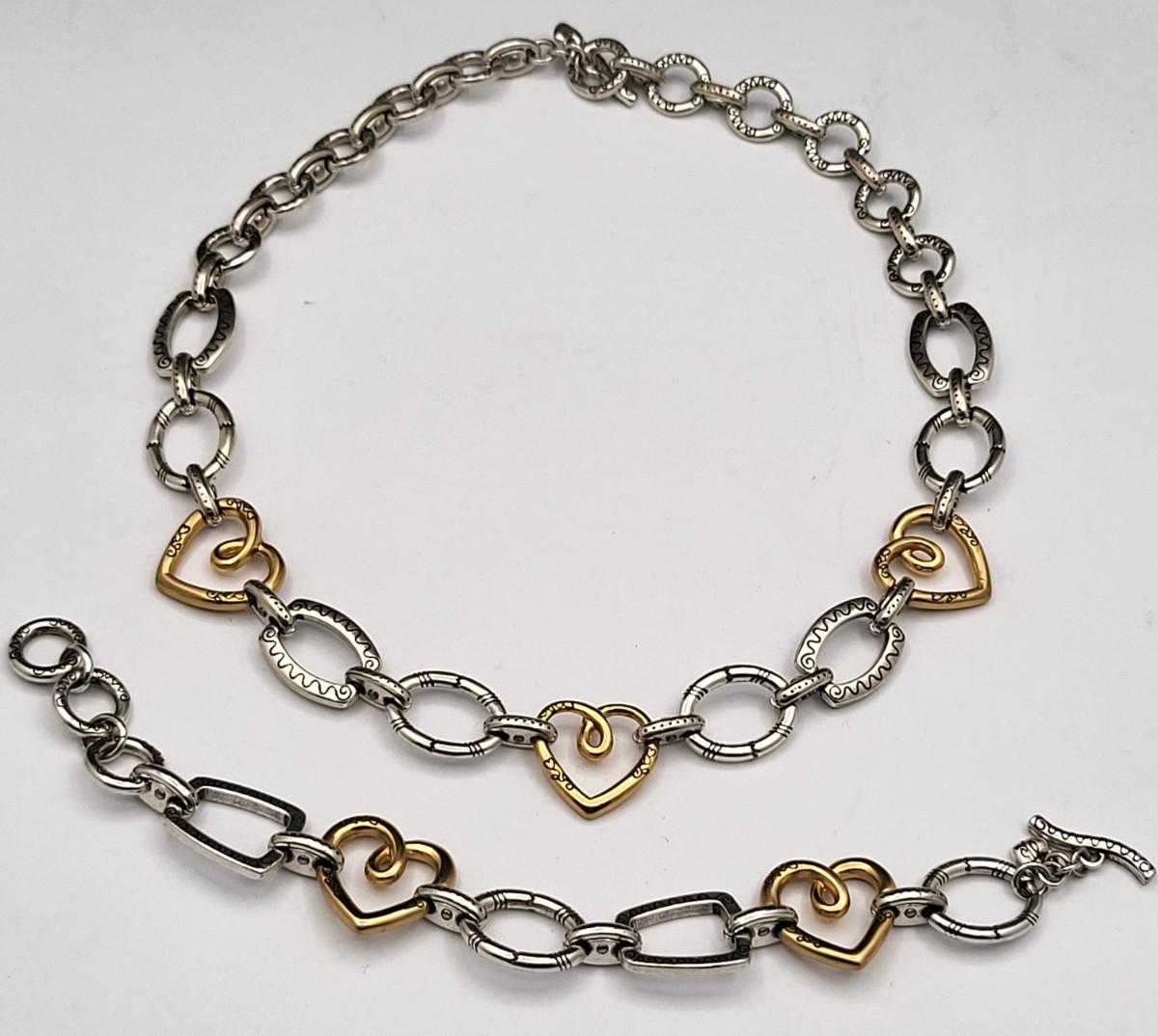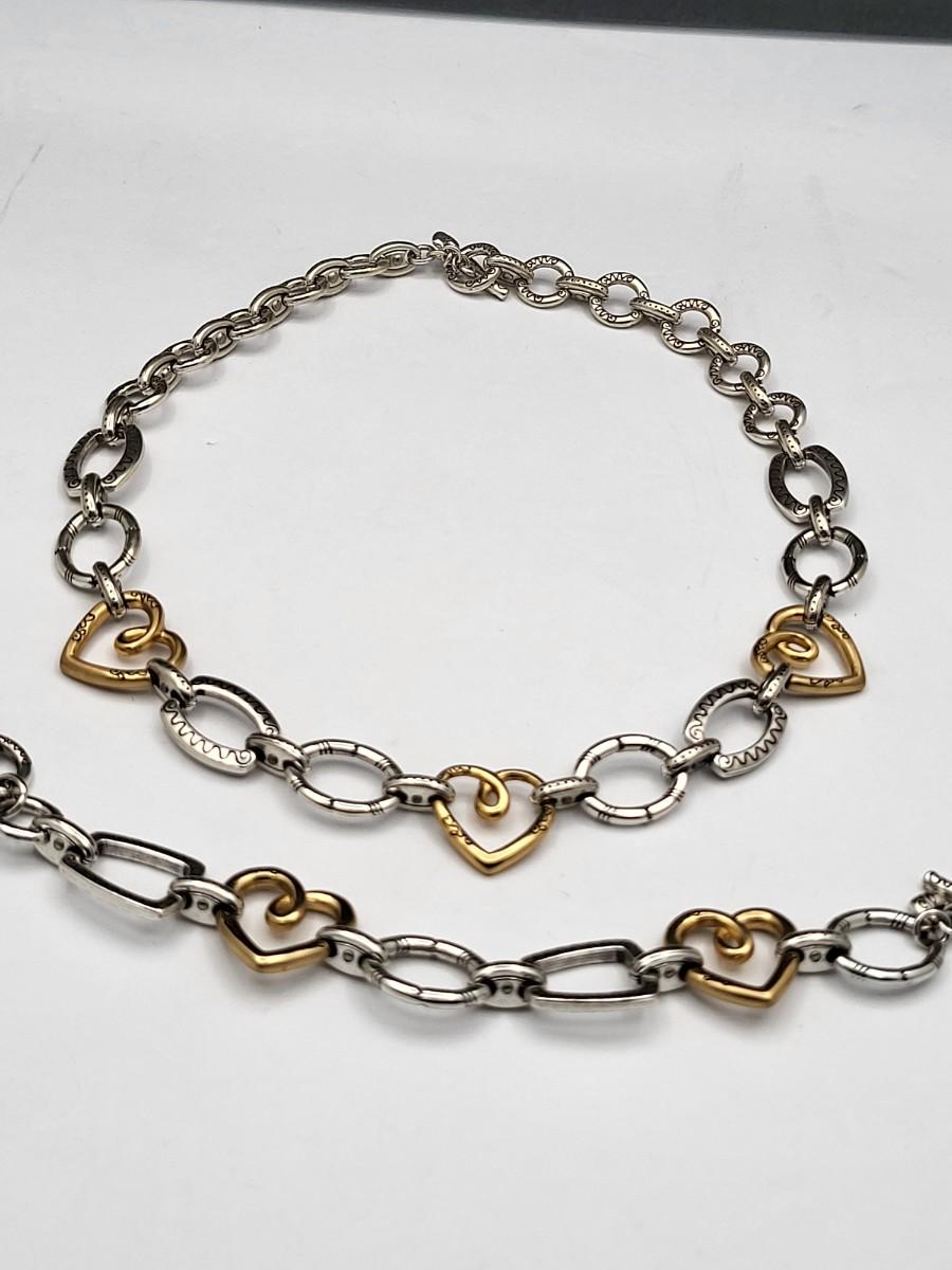 Brighton two-tone jewelry set: Gold tone hearts and silver tone links necklace is 18" long. The matching bracelet is 7.25" long.