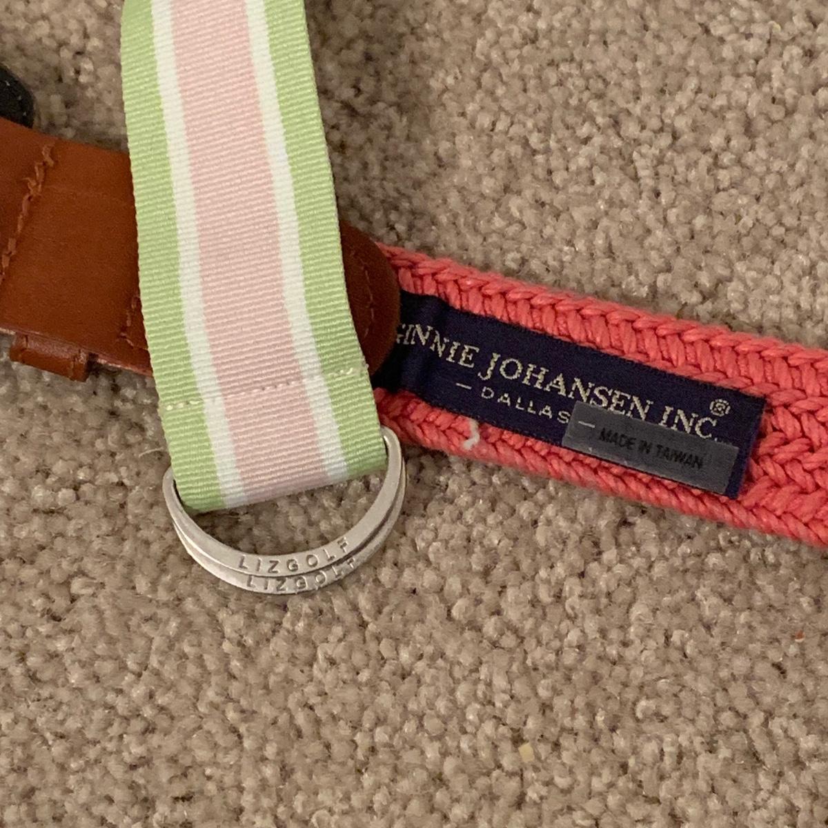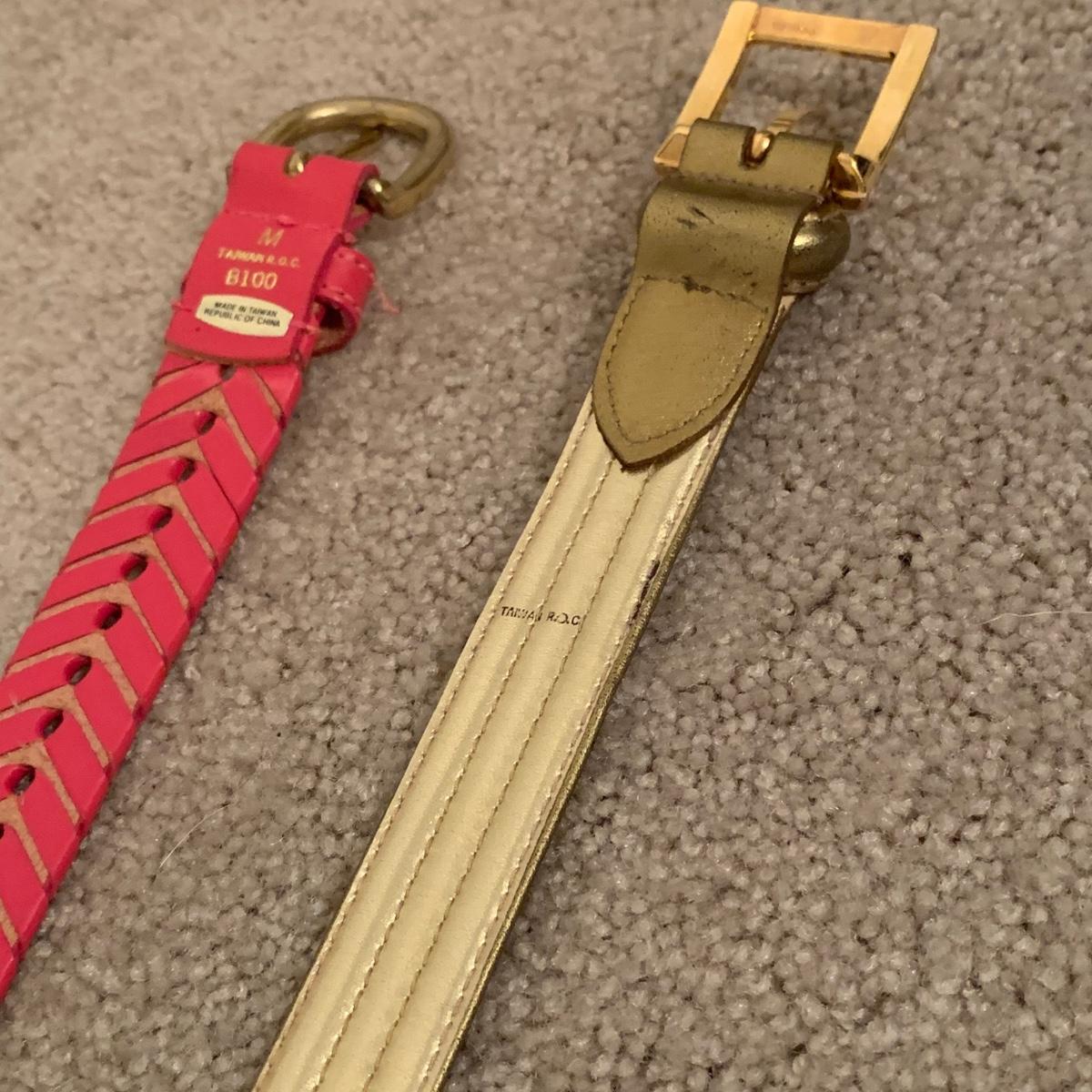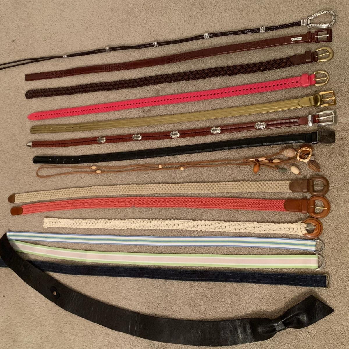 15 ladies belts. Most are about 35” long and a few are around 38”. Eight are leather or pleather, six are fabric, and one is a cord with different shell and bead adornments.