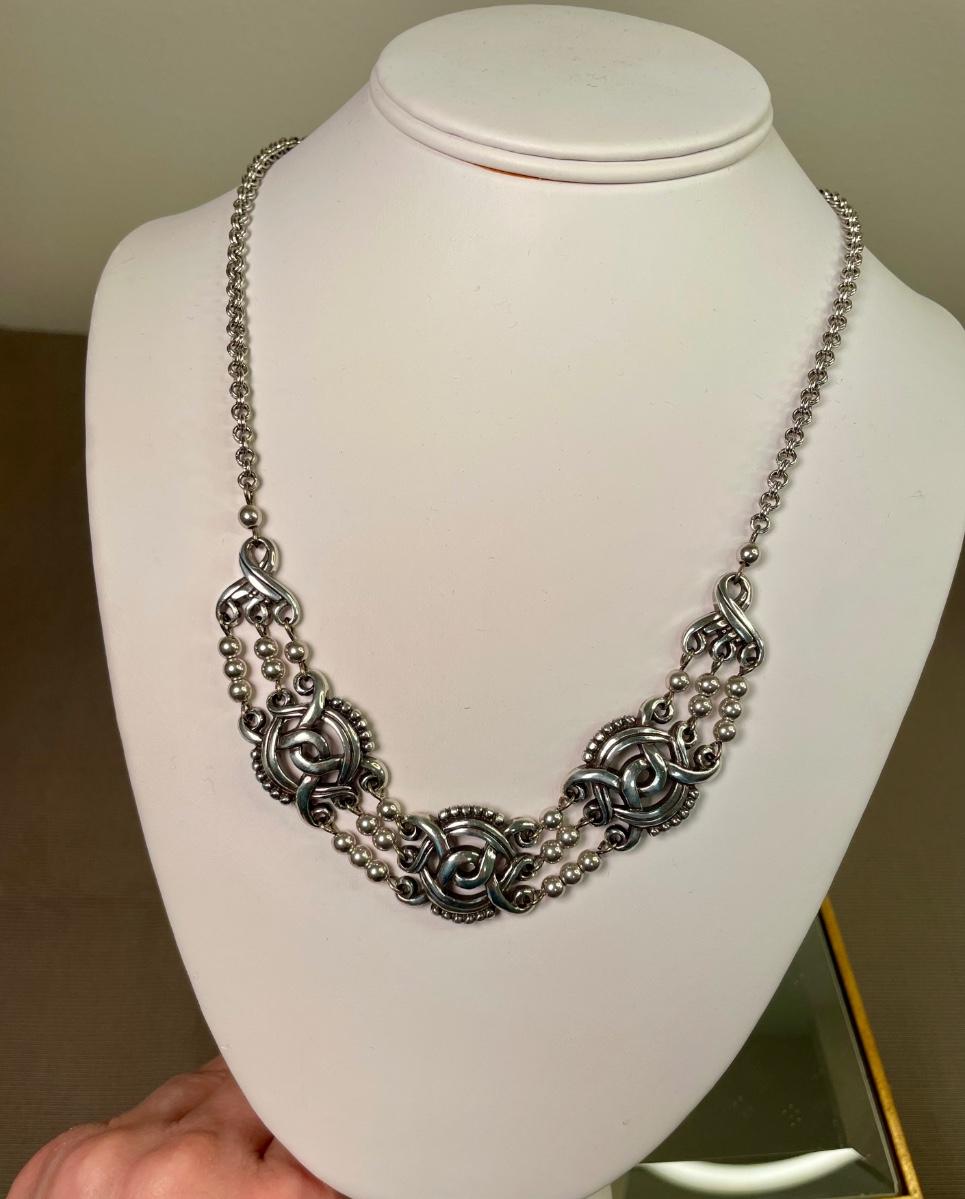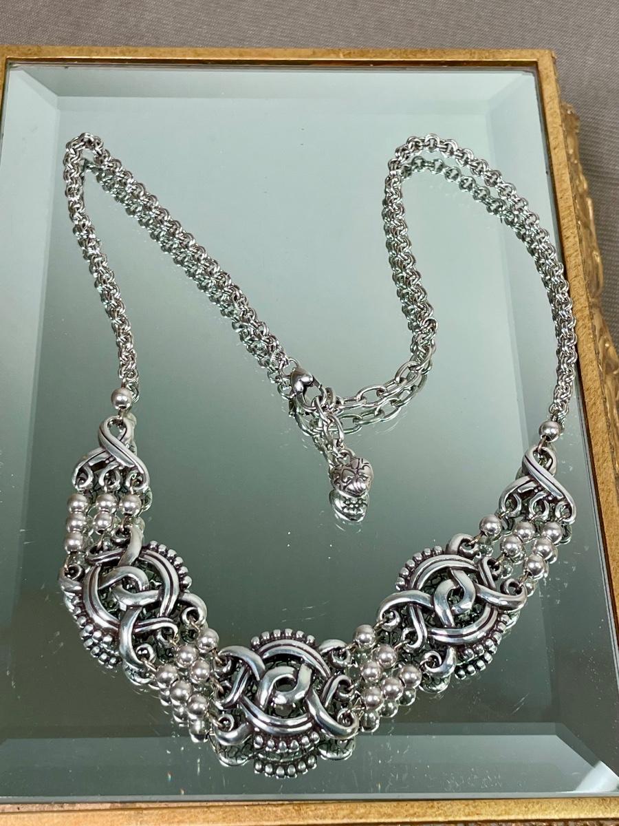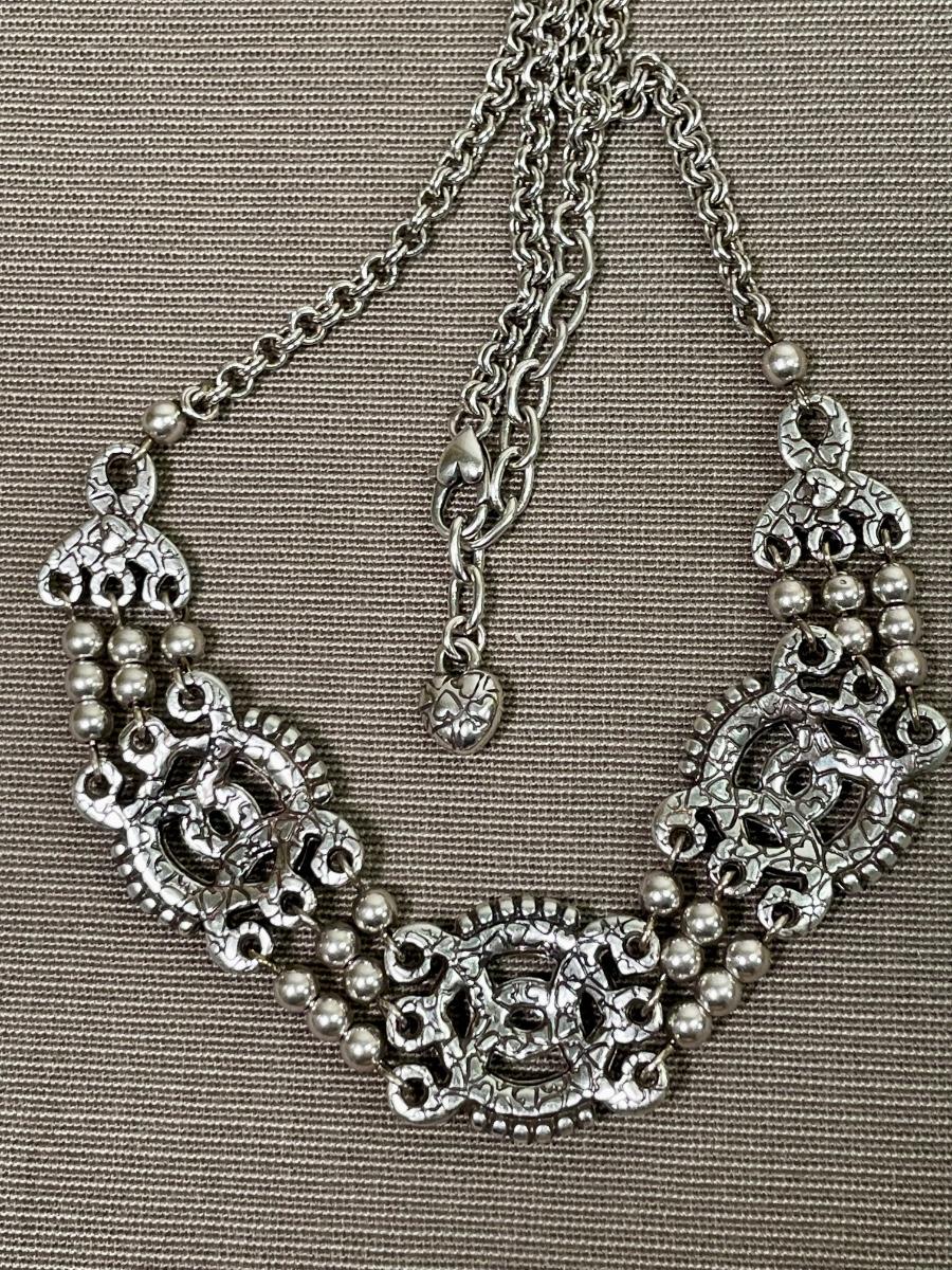 Silver tone. The last photo shows the back of the necklace. Great condition