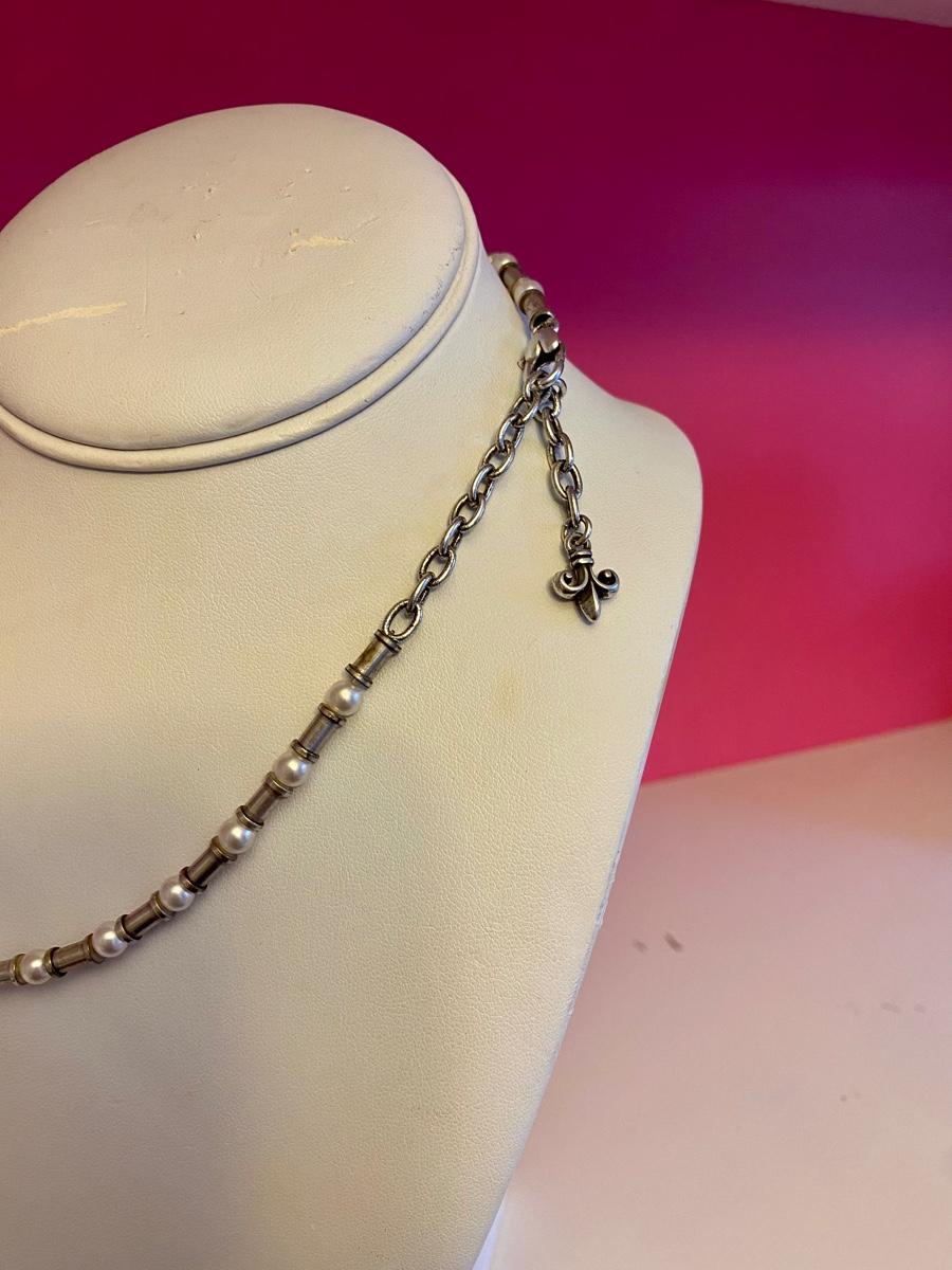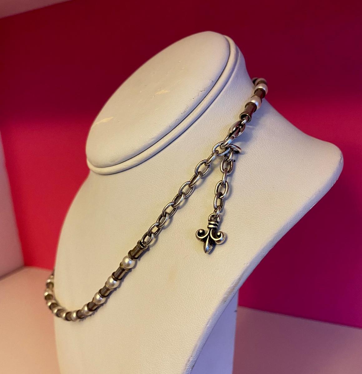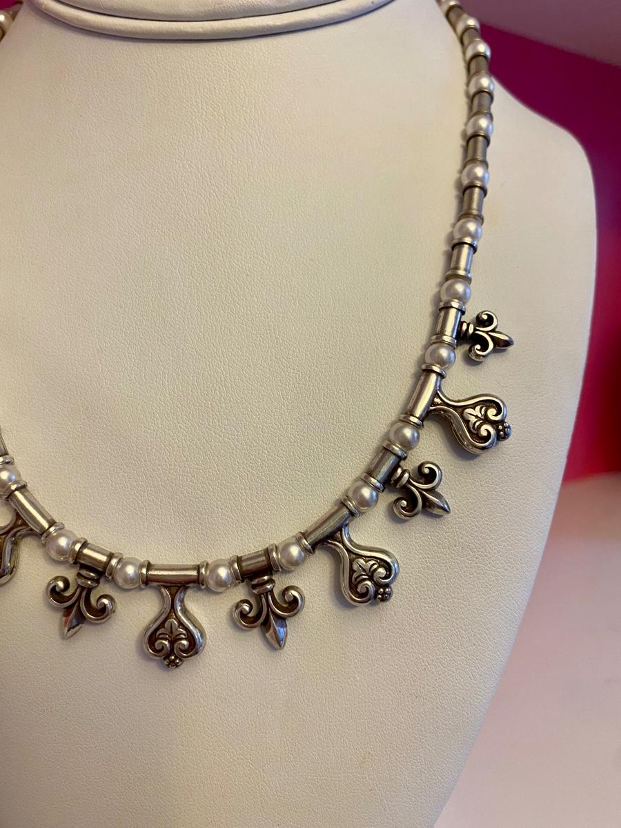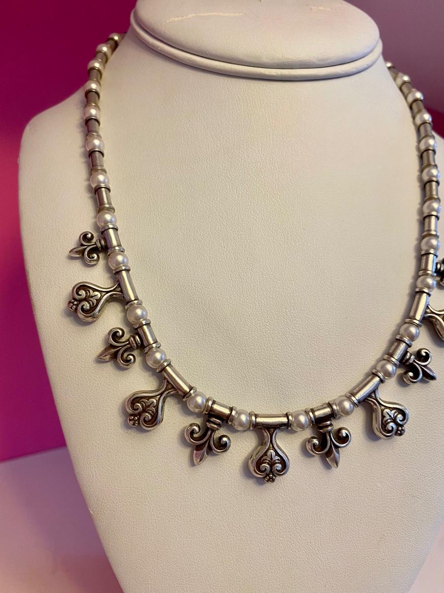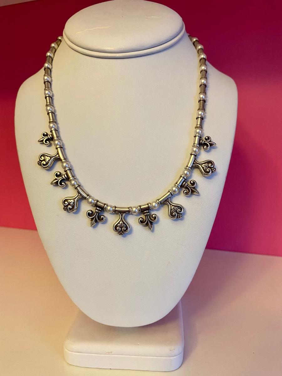 Brighton Necklace Silver Tone Hearts Fleur De Lis Faux Pearl - Rare