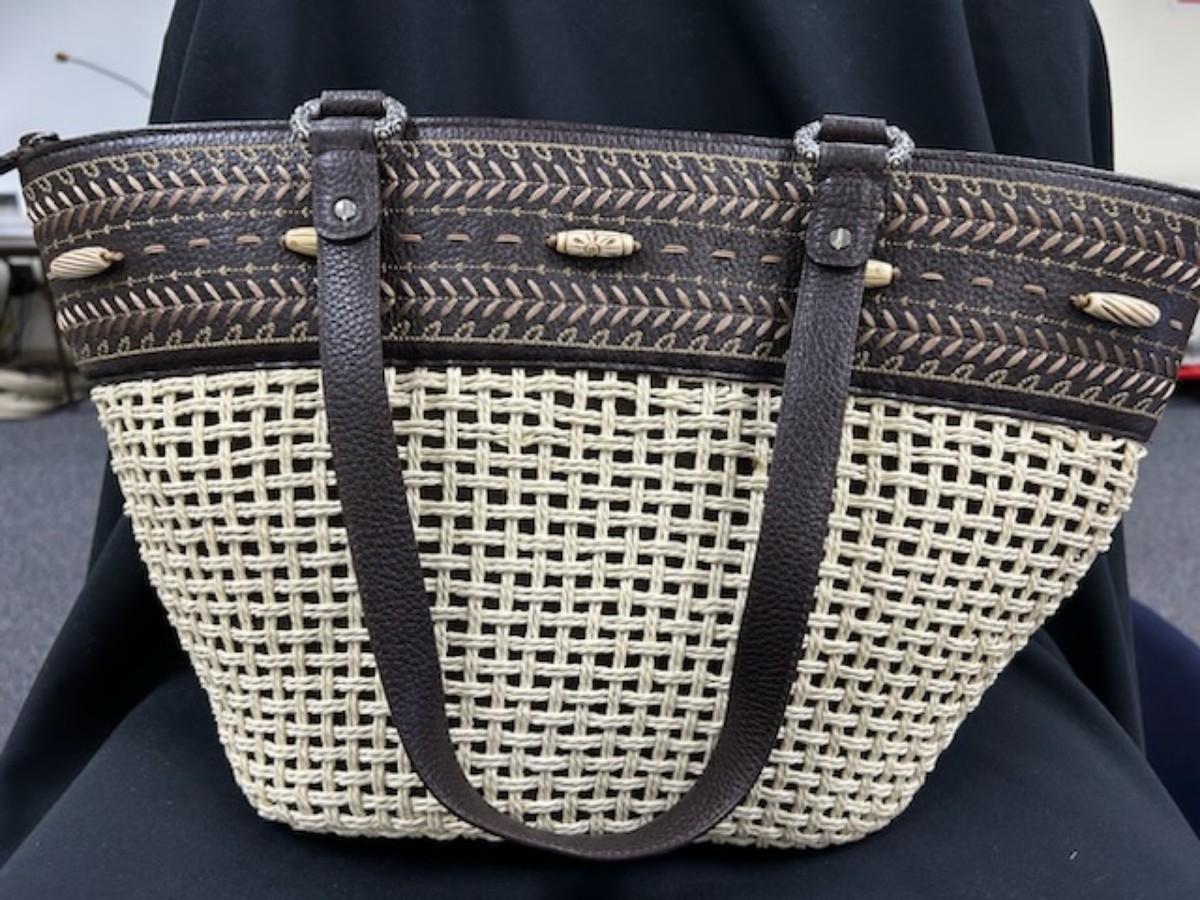 pre-owned. straw and leather shoulder bag, one inside zipper pocket, key fob, cell phone pocket,