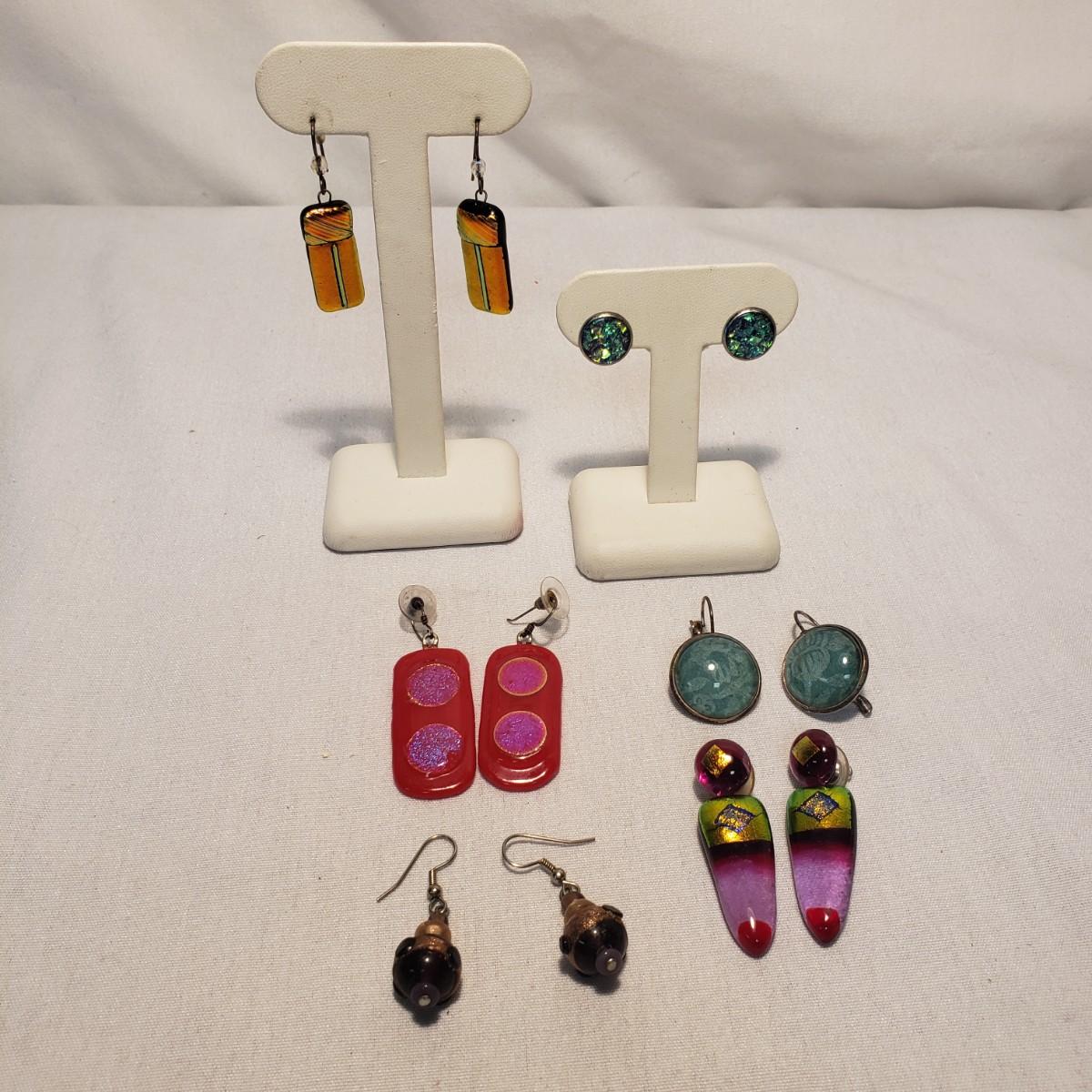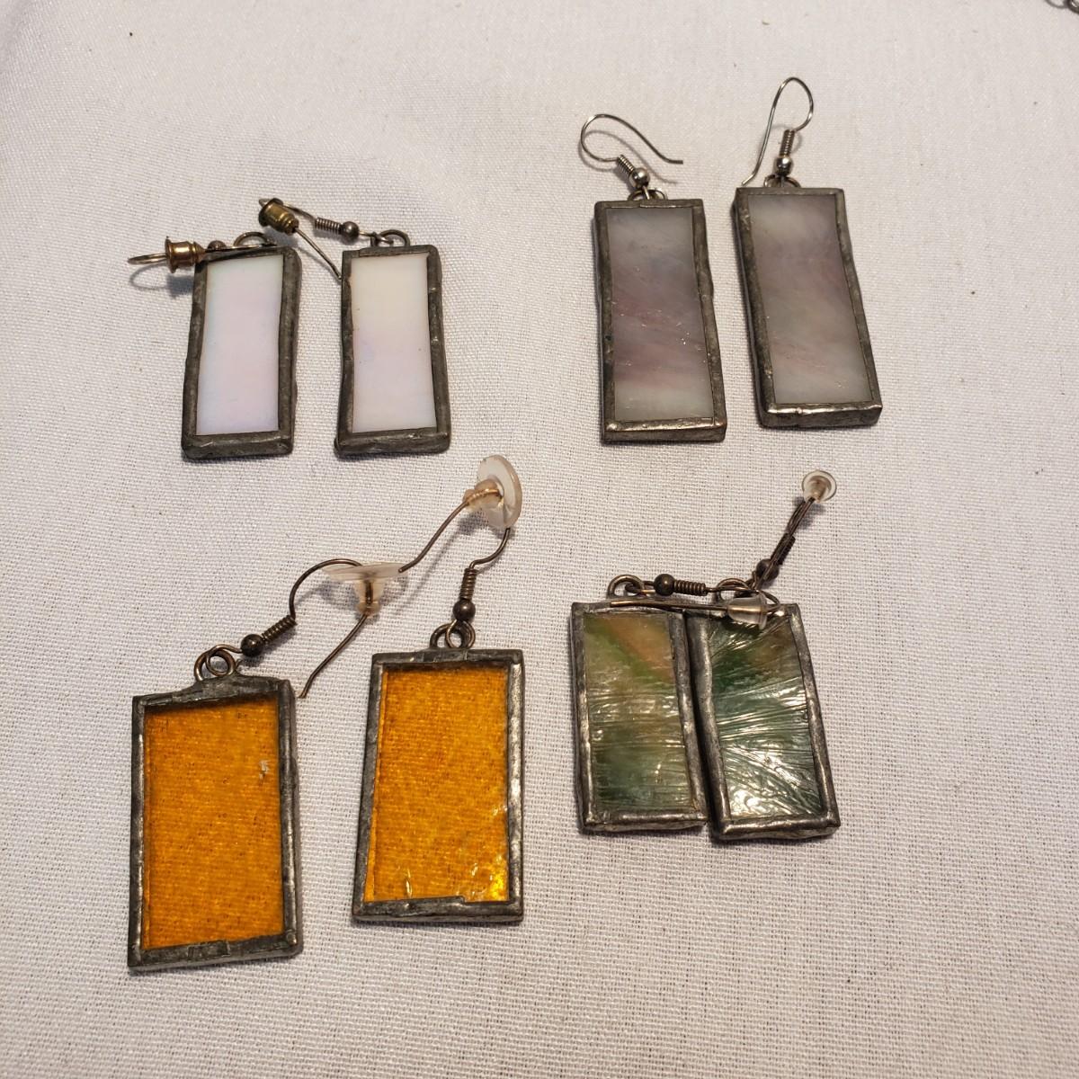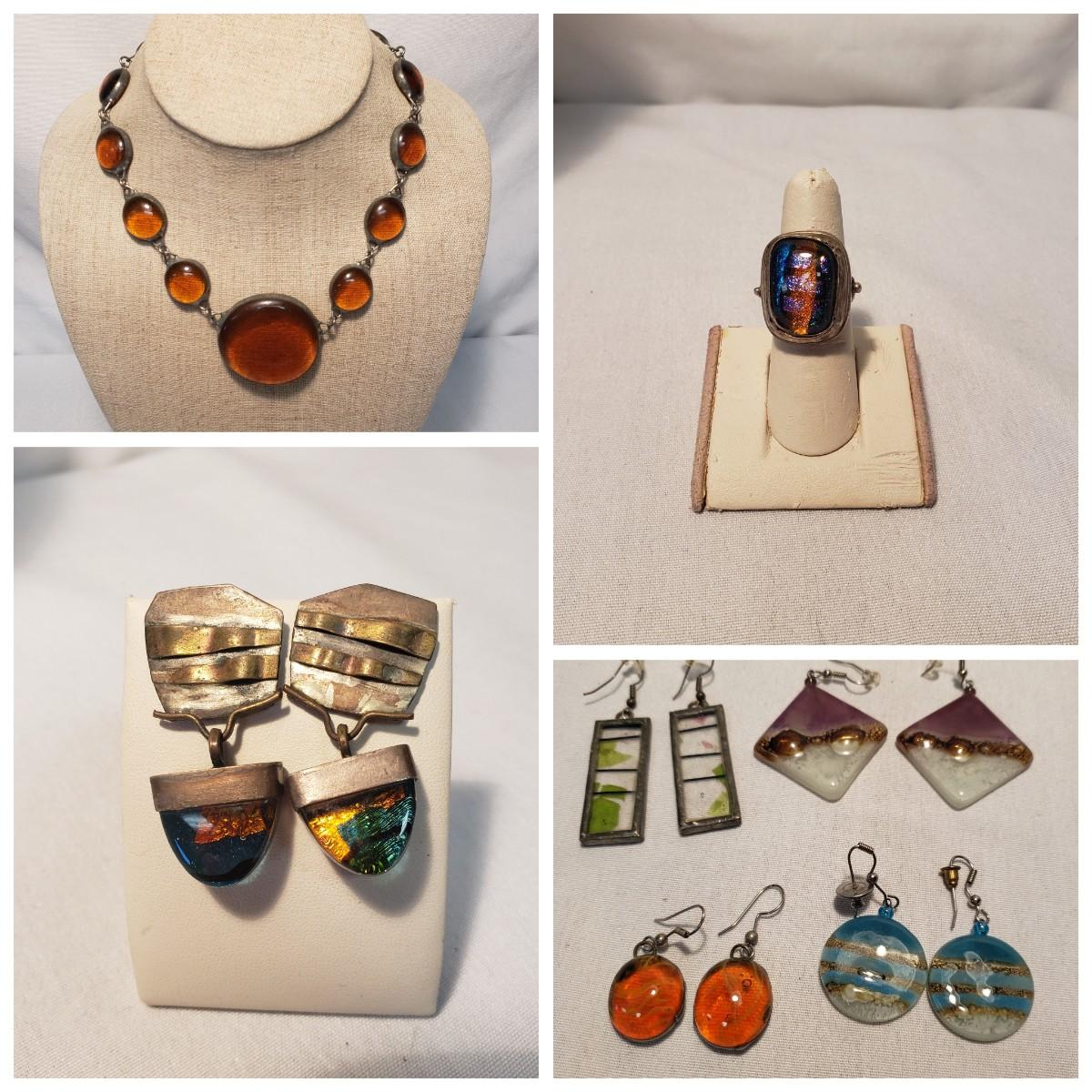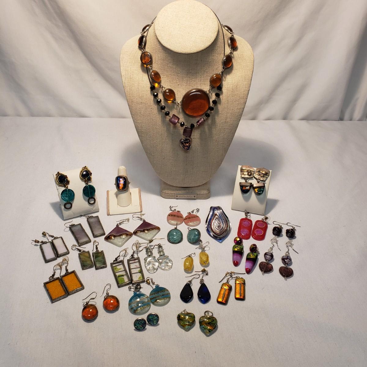 This brilliant 21 piece lot of glass themed jewelry has everything you need, from rings, necklaces, earrings and pendants. The orange hued stained glass round necklace measures 16". The one ring in this lot is marked with sterling silver base and a multiple colored glass feature. Some earrings have backings, while others don't, see pictures.