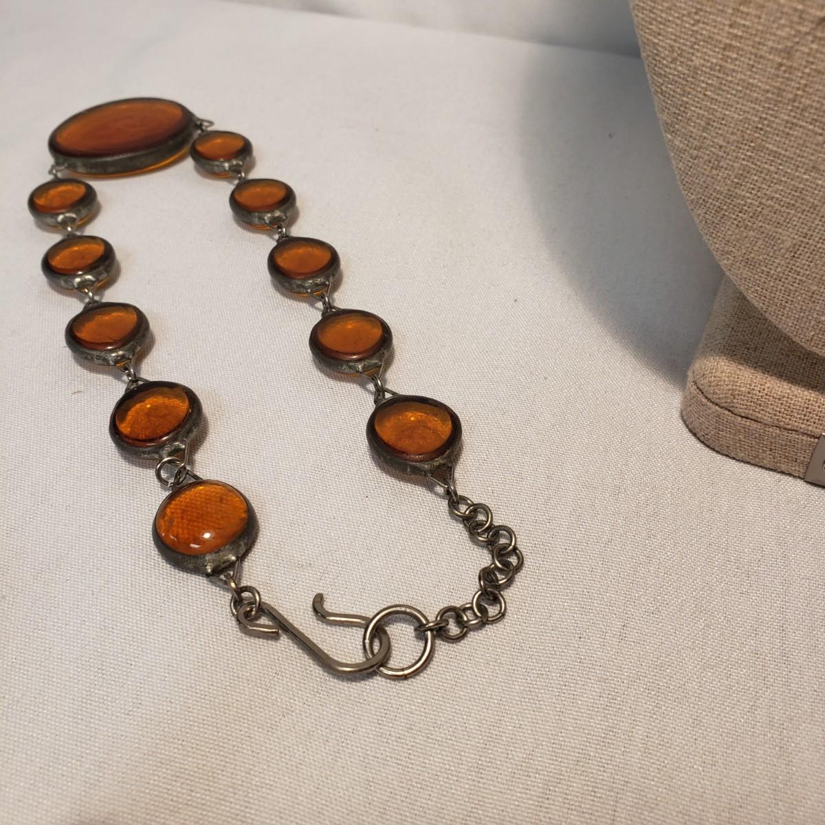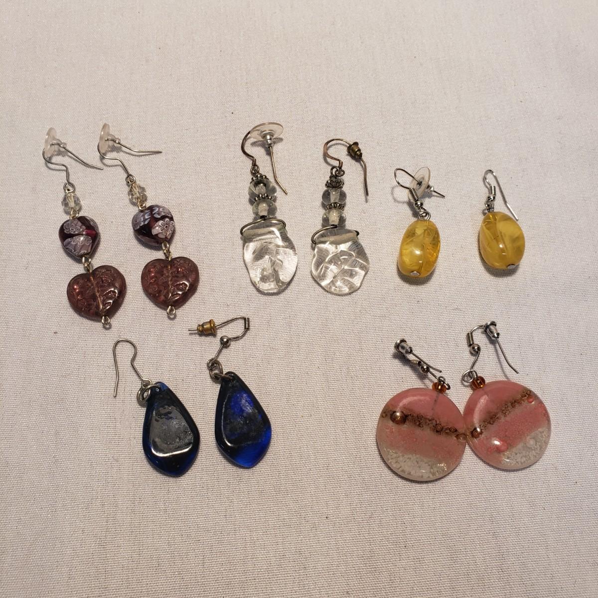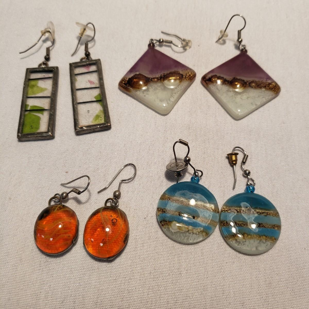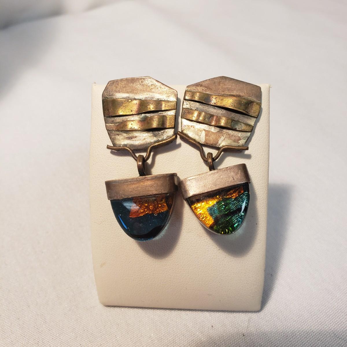 This brilliant 21 piece lot of glass themed jewelry has everything you need, from rings, necklaces, earrings and pendants. The orange hued stained glass round necklace measures 16". The one ring in this lot is marked with sterling silver base and a multiple colored glass feature. Some earrings have backings, while others don't, see pictures.