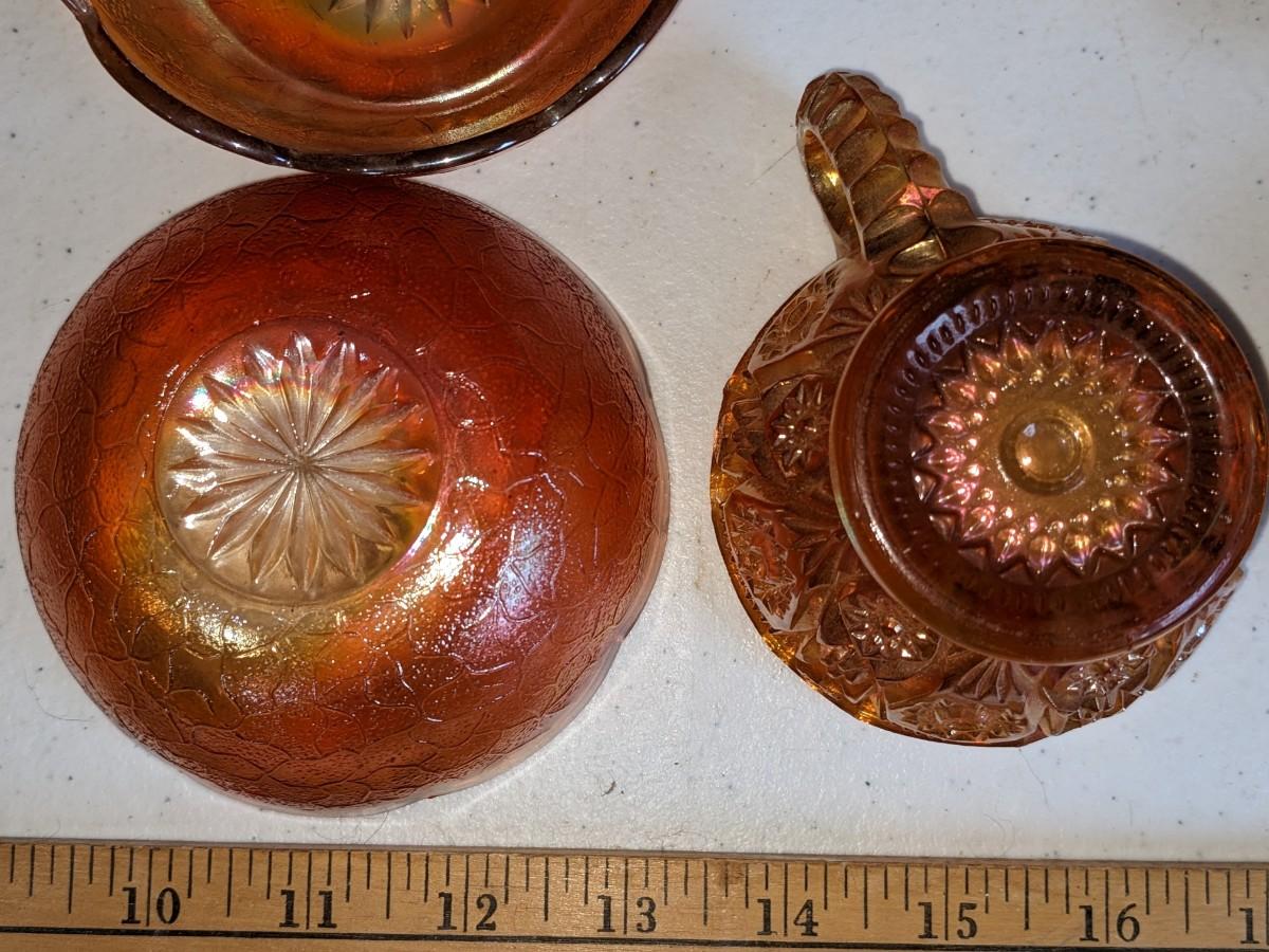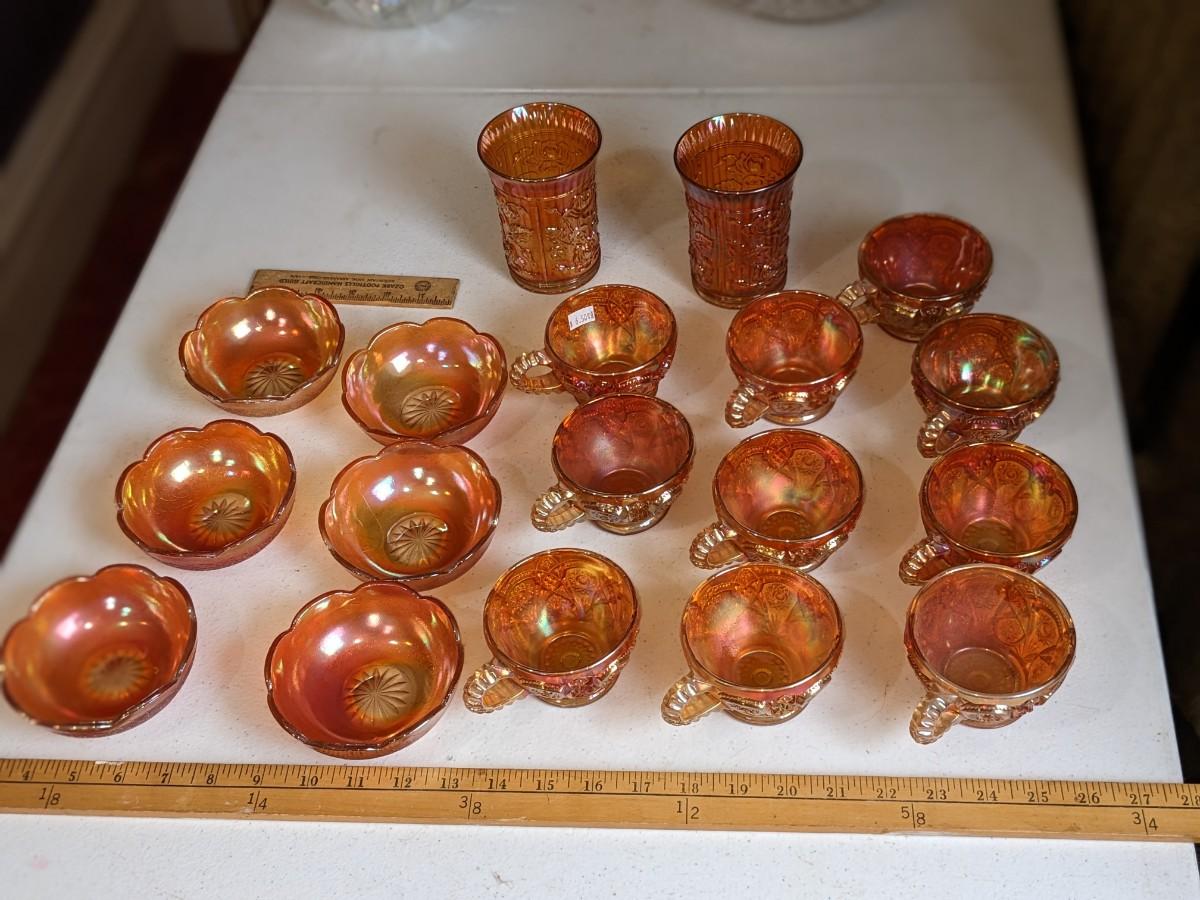 Brilliant Marigold Orange Cups, Bowls, Tumblers Carnival Glass Set