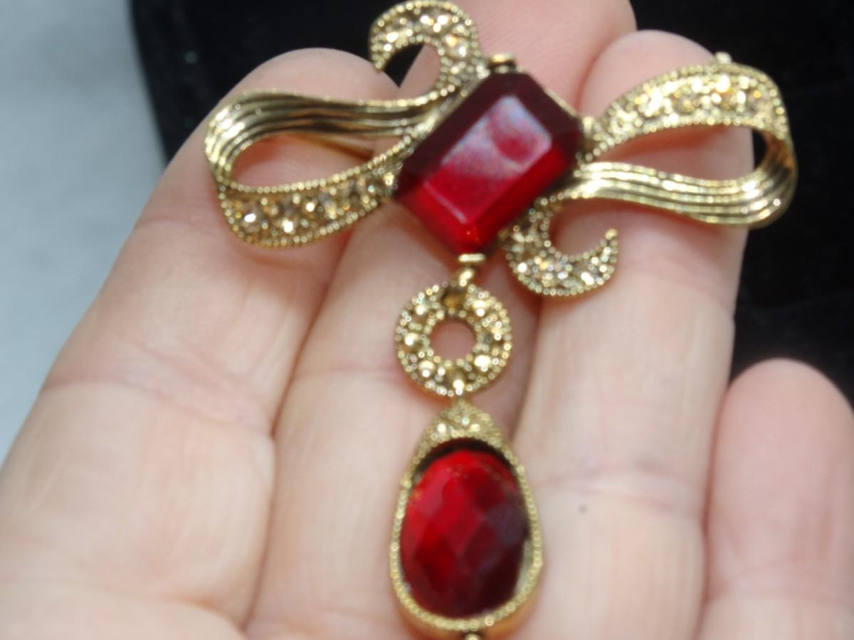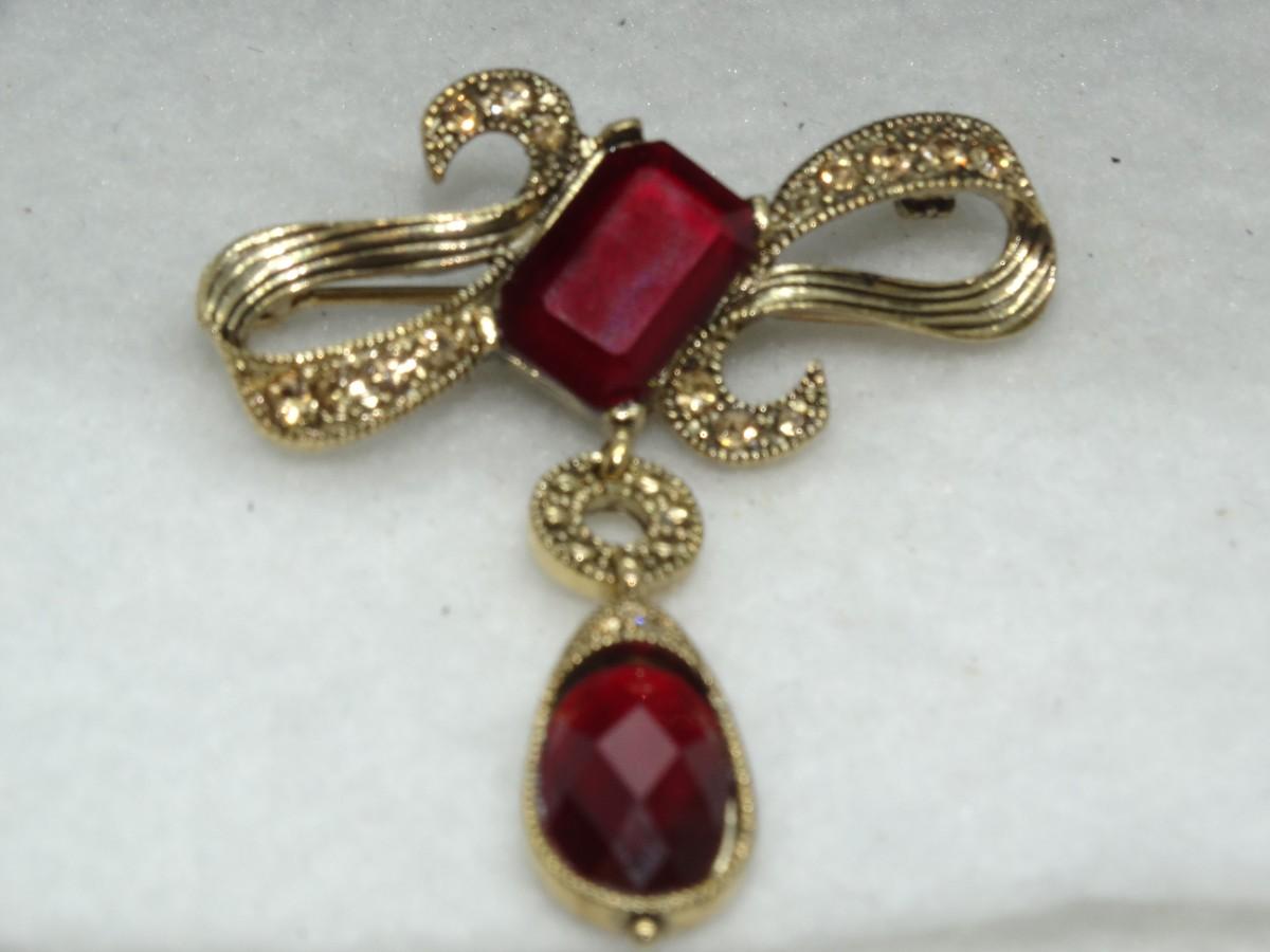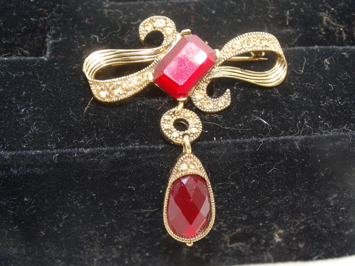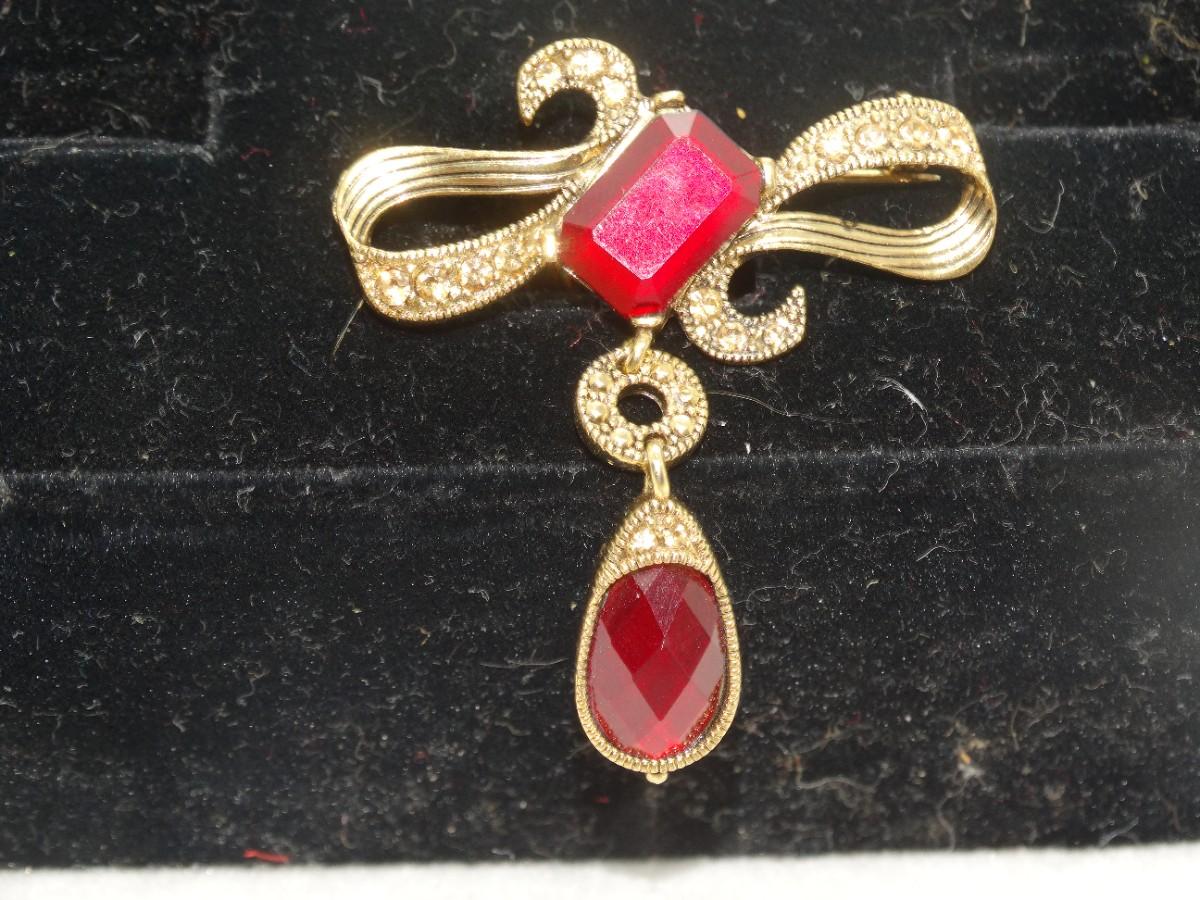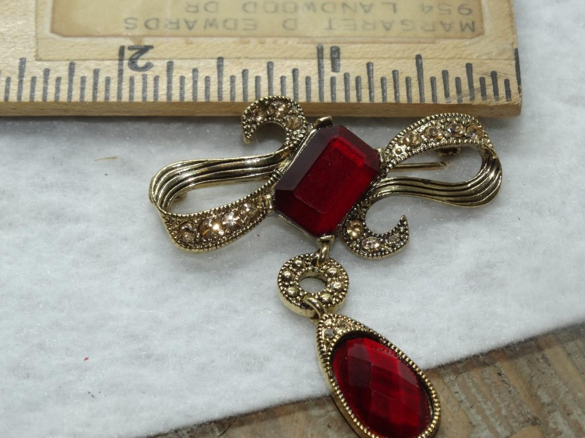 Brilliant Ruby Red & Gold Tone Victorian Drop Brooch - Beautiful!