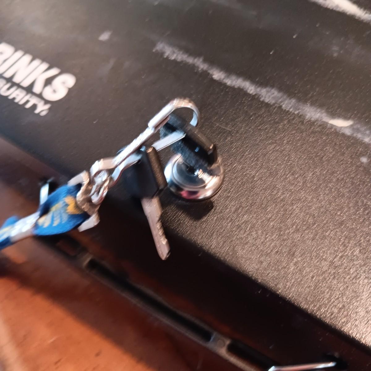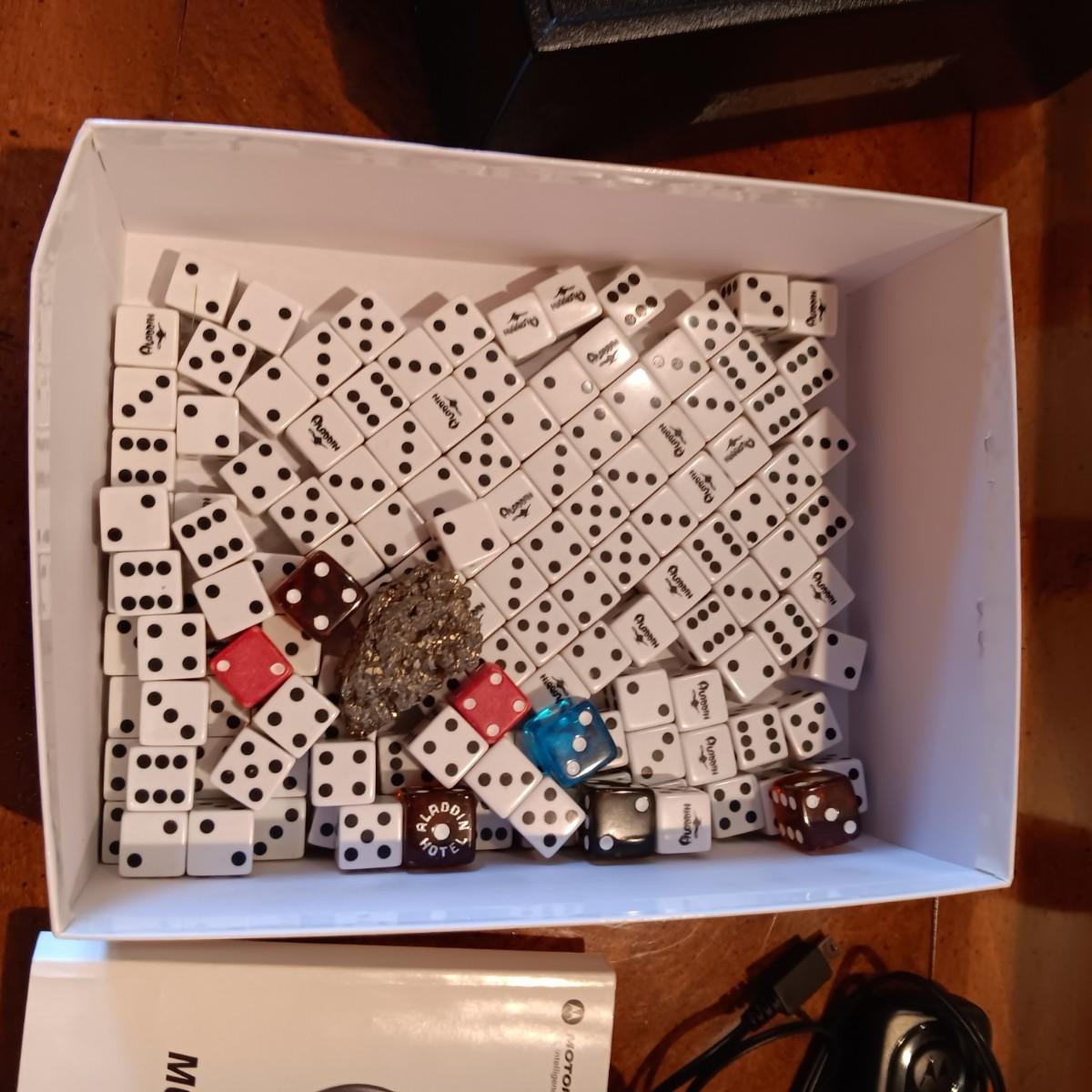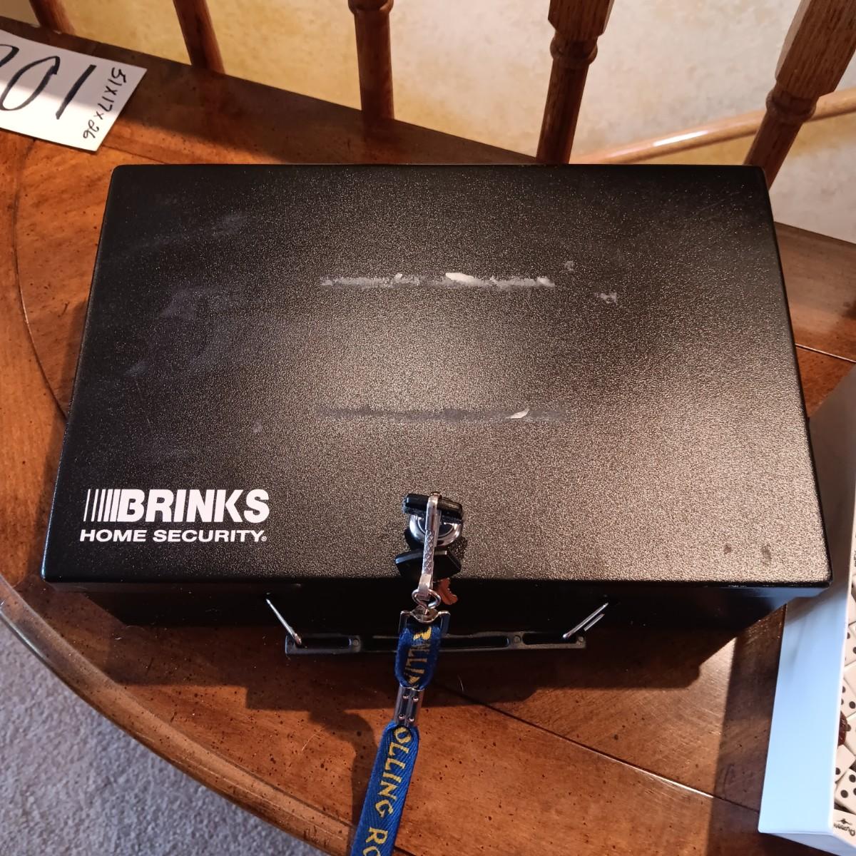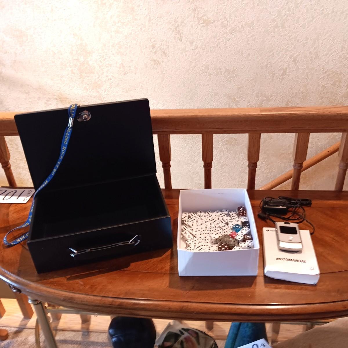 BRINKS LOCK BOX, MOTOROLA FLIP PHONE AND A BOX OF CASINO DICE