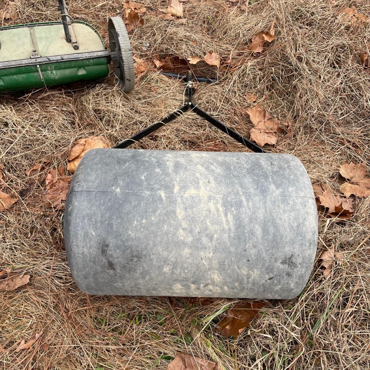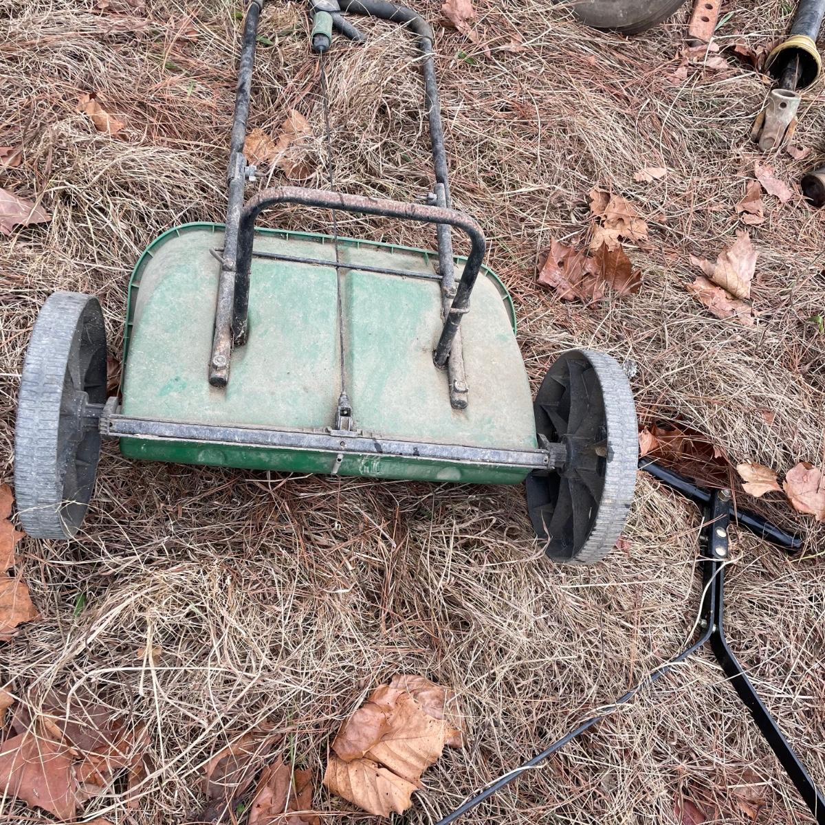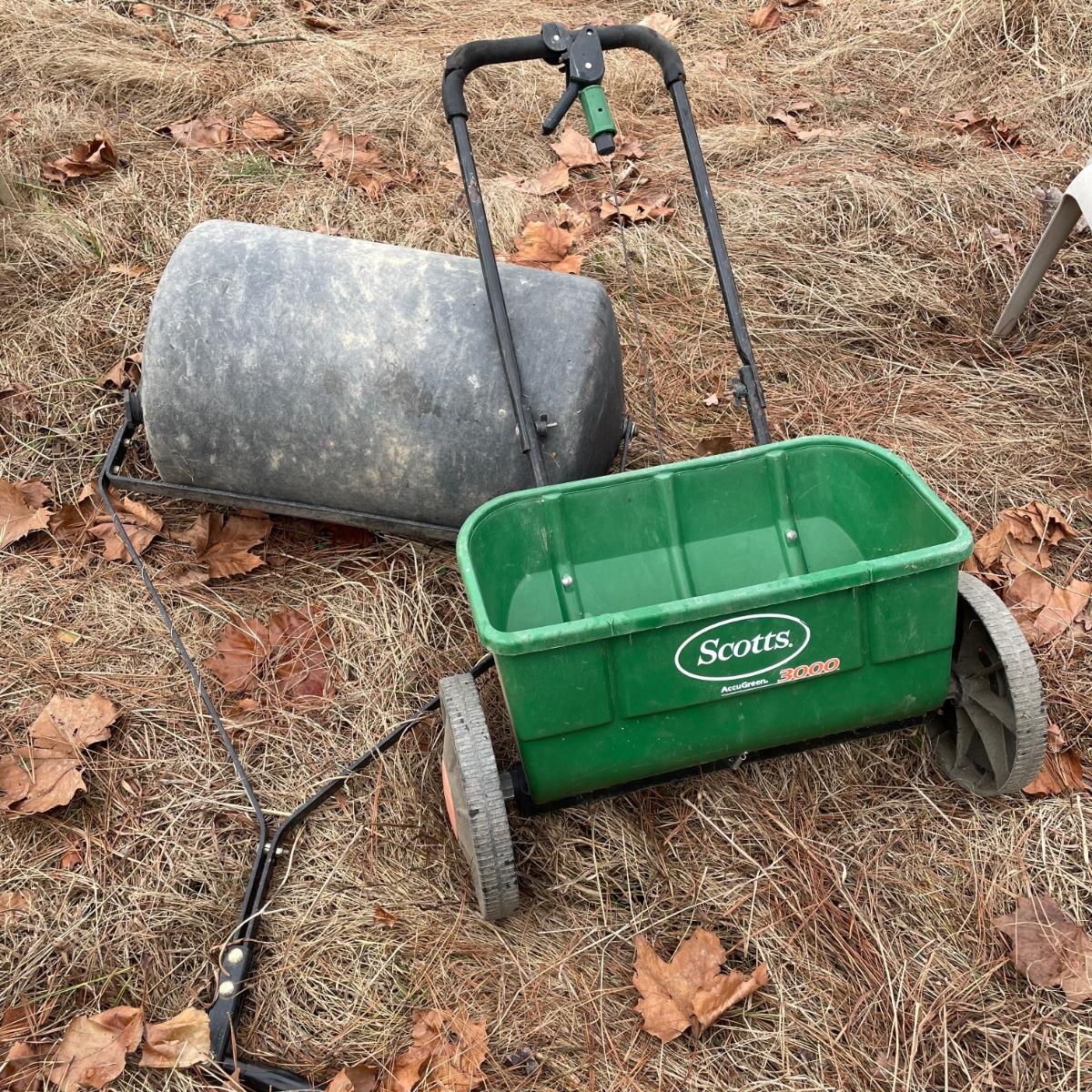 This hand push Brinly roller measures 30” wide and can be weighted by filling drum with water. Also included is a Scott’s Accugreen 3000 seed spreader.