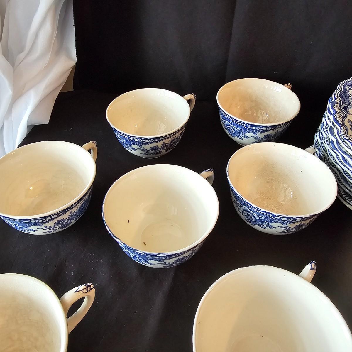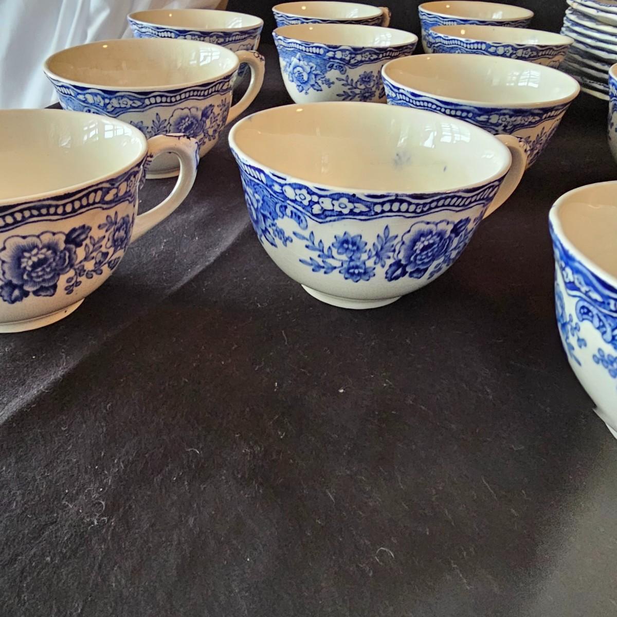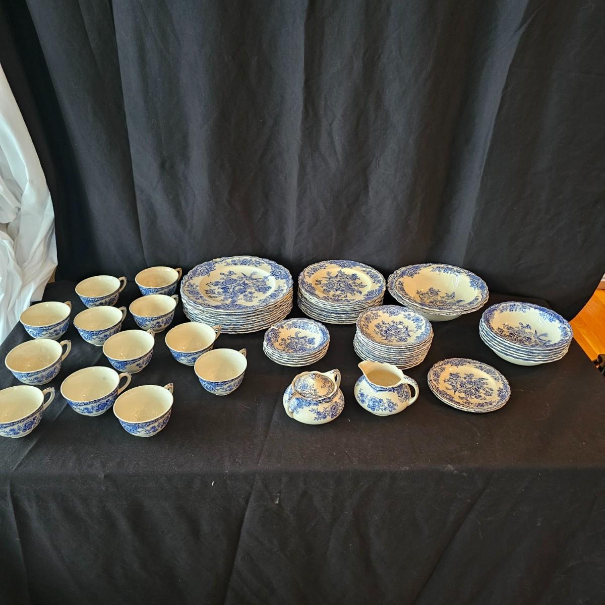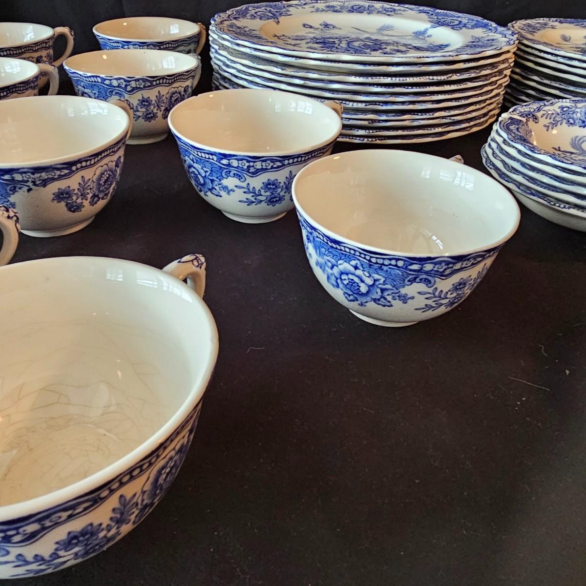 Over 60 pieces of this English china in the 'Bristol' Crown Ducal pattern. Plates, bowls, cups, saucers, serving bowls and more. There are different amounts of pieces on some of these. A number of items have cracks, chips and/or breaks. Please note items in end of photos for damages. See photos for details. Local pickup only.