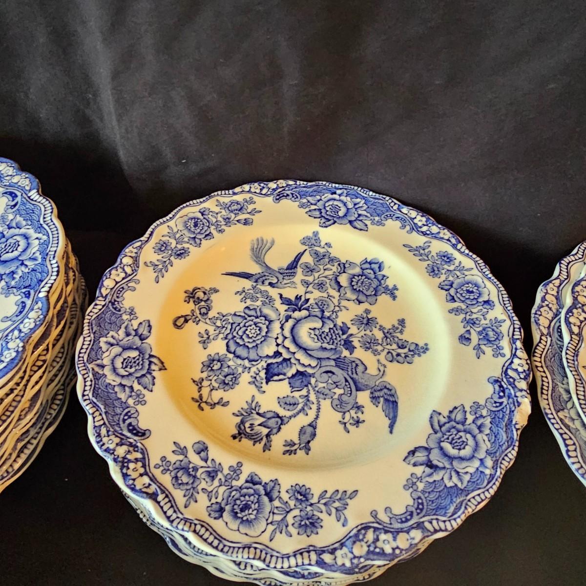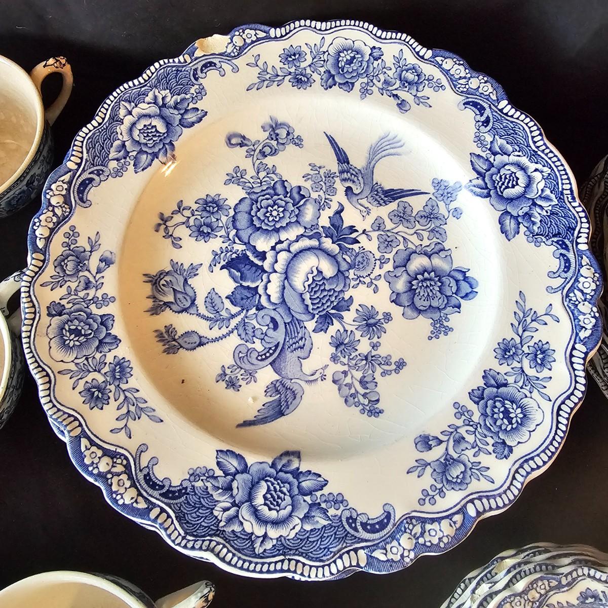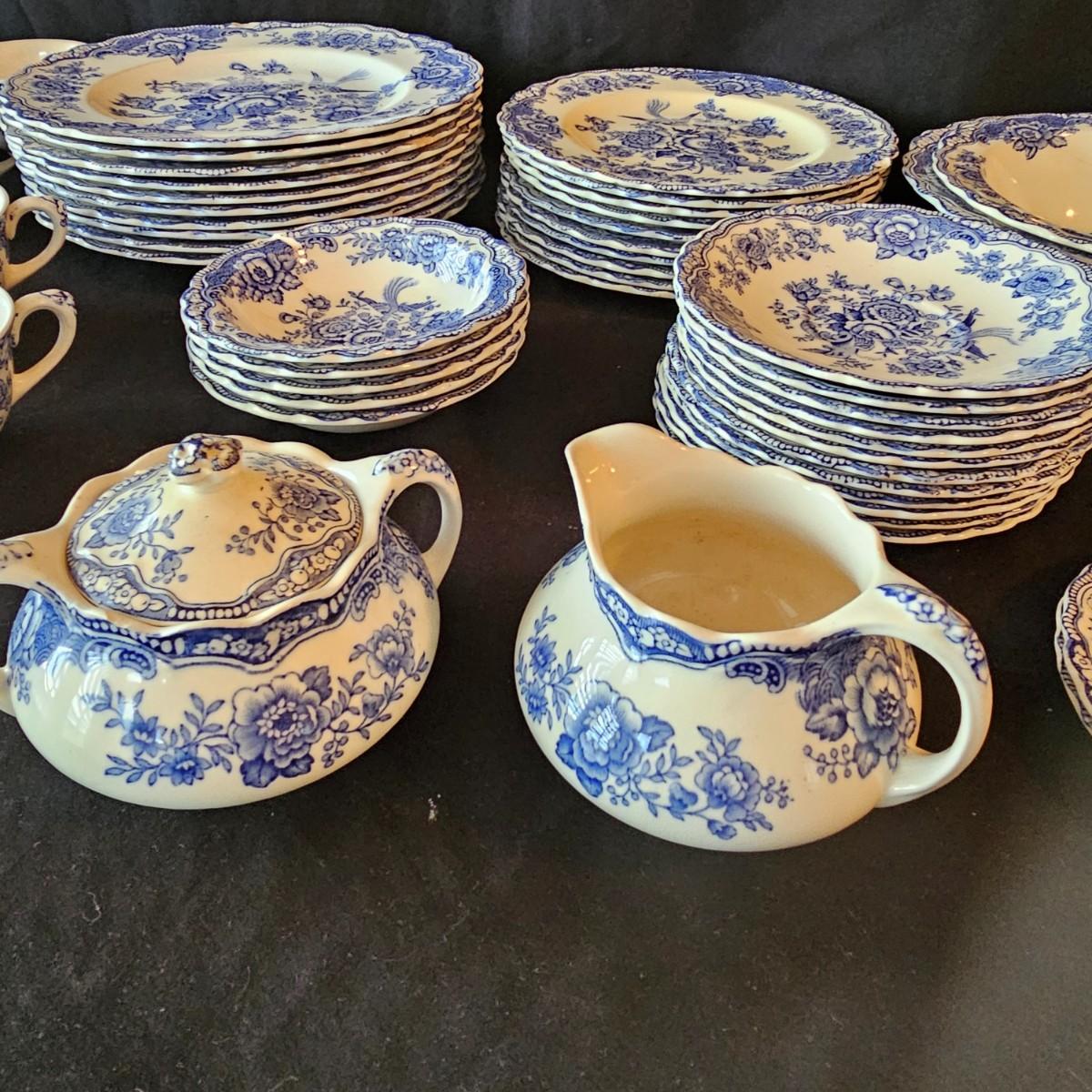 Over 60 pieces of this English china in the 'Bristol' Crown Ducal pattern. Plates, bowls, cups, saucers, serving bowls and more. There are different amounts of pieces on some of these. A number of items have cracks, chips and/or breaks. Please note items in end of photos for damages. See photos for details. Local pickup only.