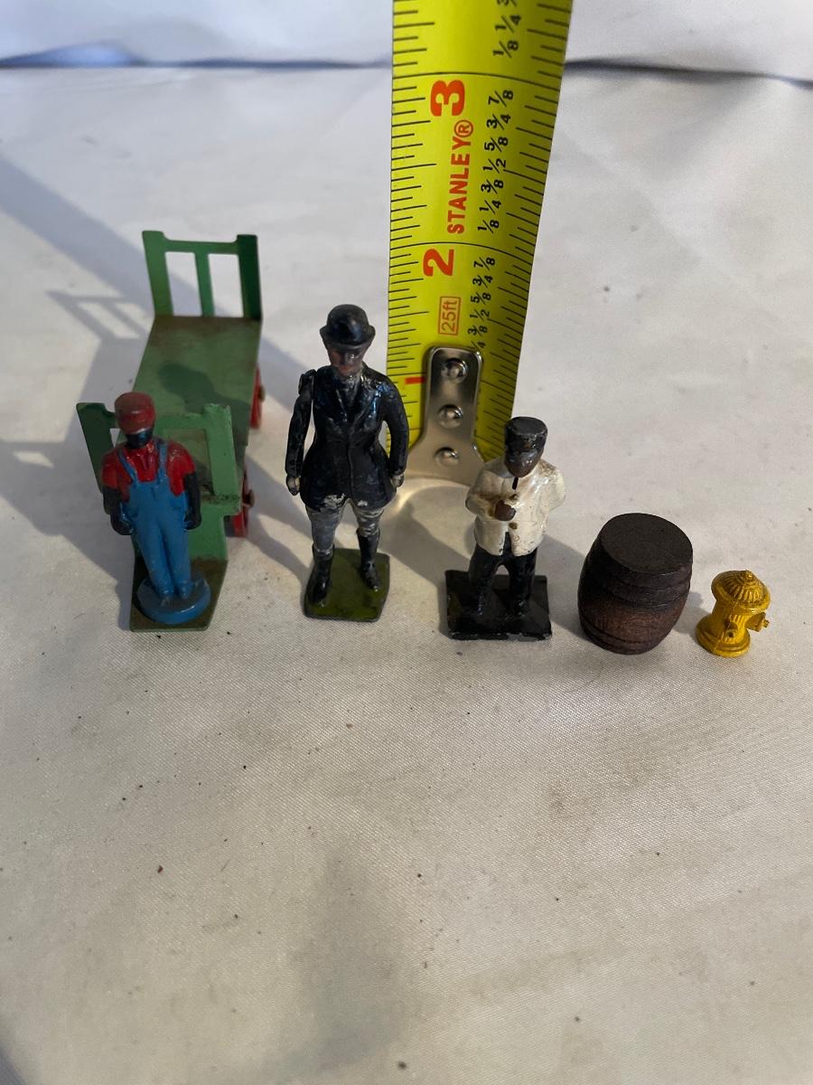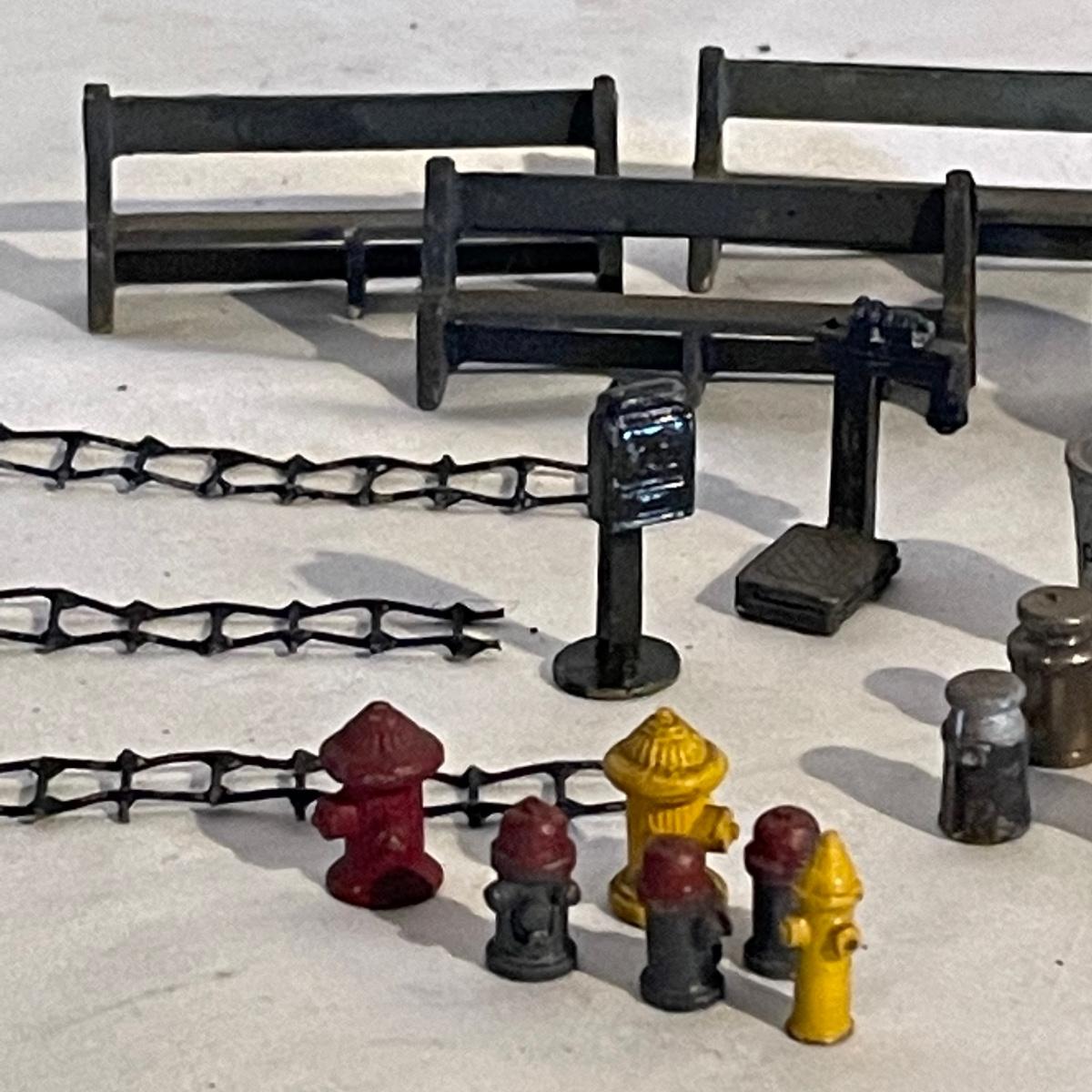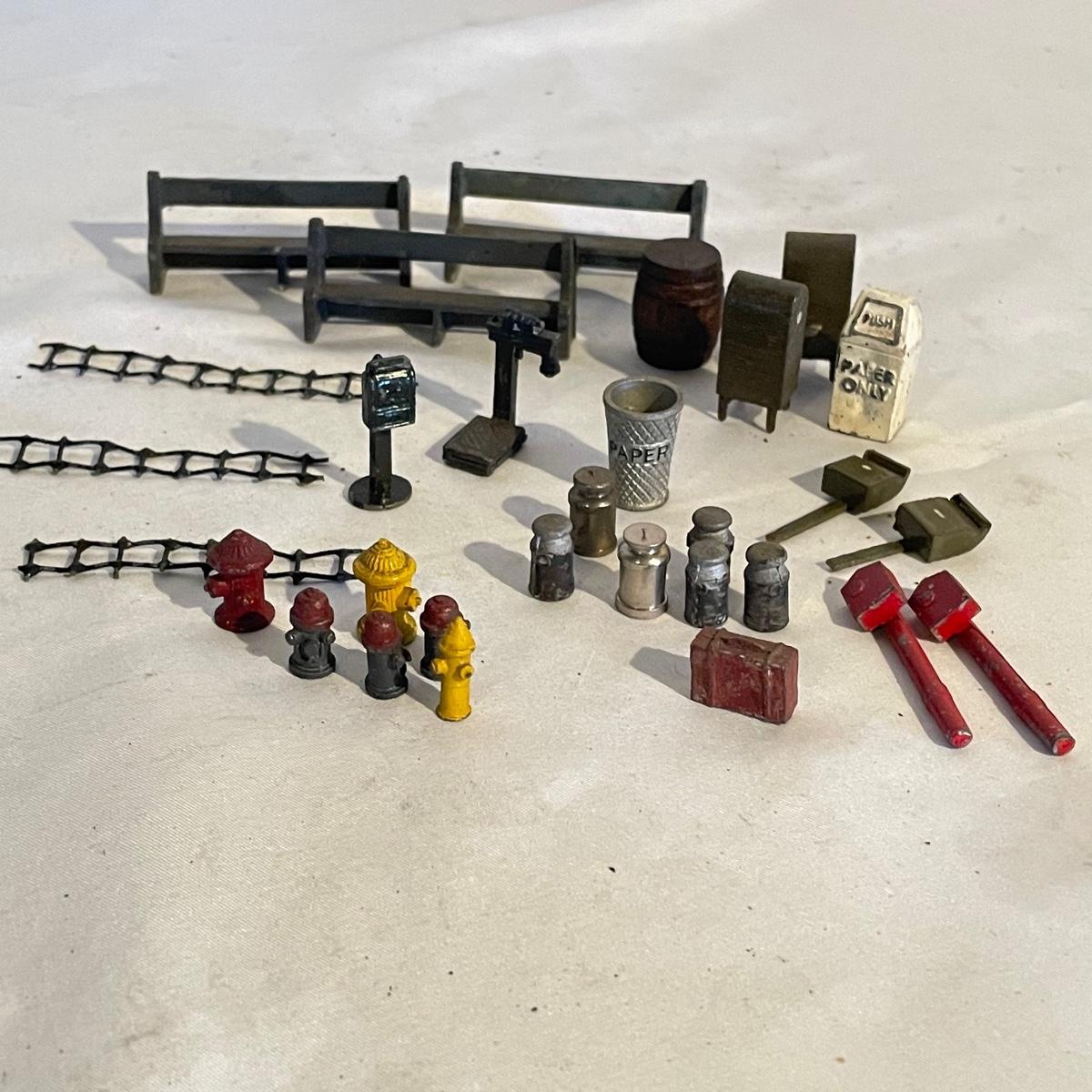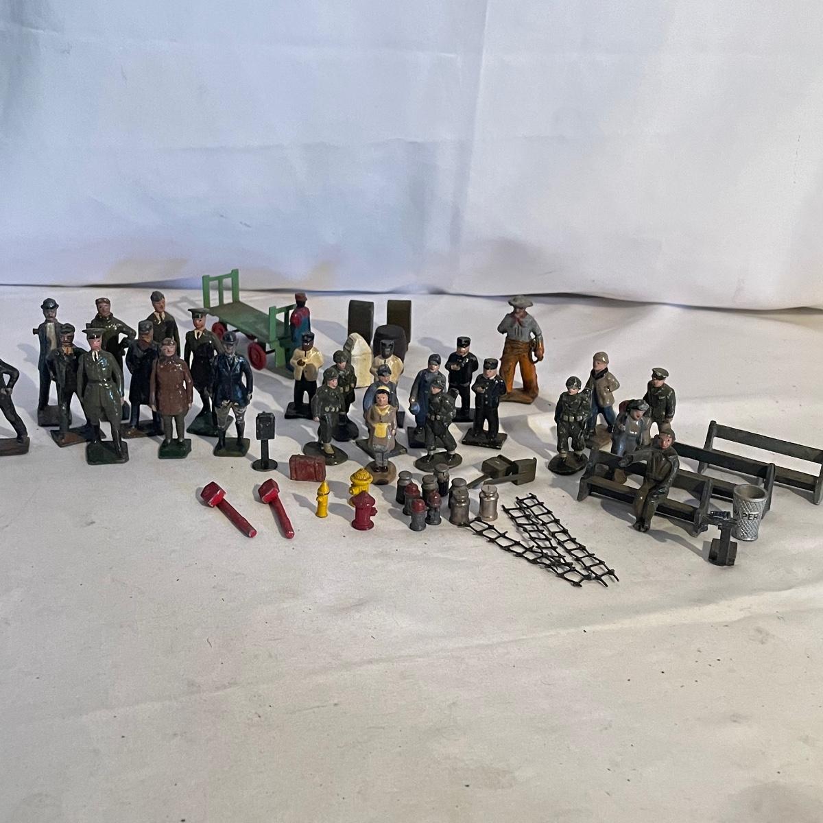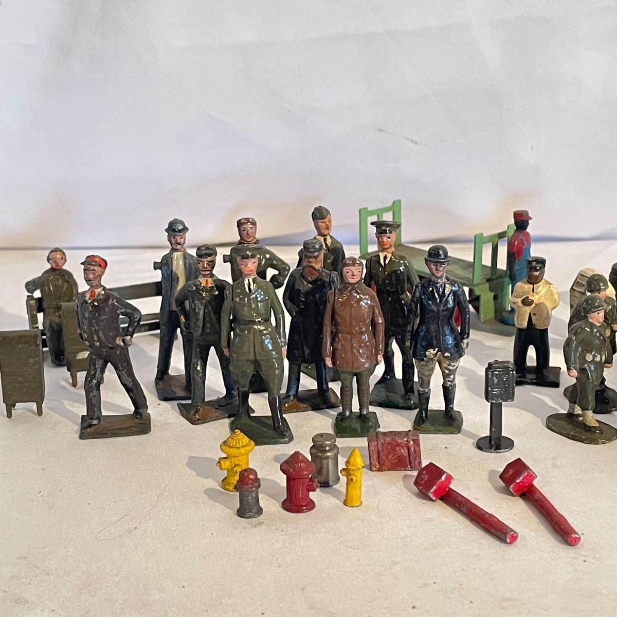 Over twenty die cast figures in this lot plus lots of accessories such as benches, fire hydrants, mailboxes and more. A group of these figures are Britains Ltd with a movable arm (two have broken arms) and another group are Tru Craft plus more. The Lincoln Log figure is missing his arm.