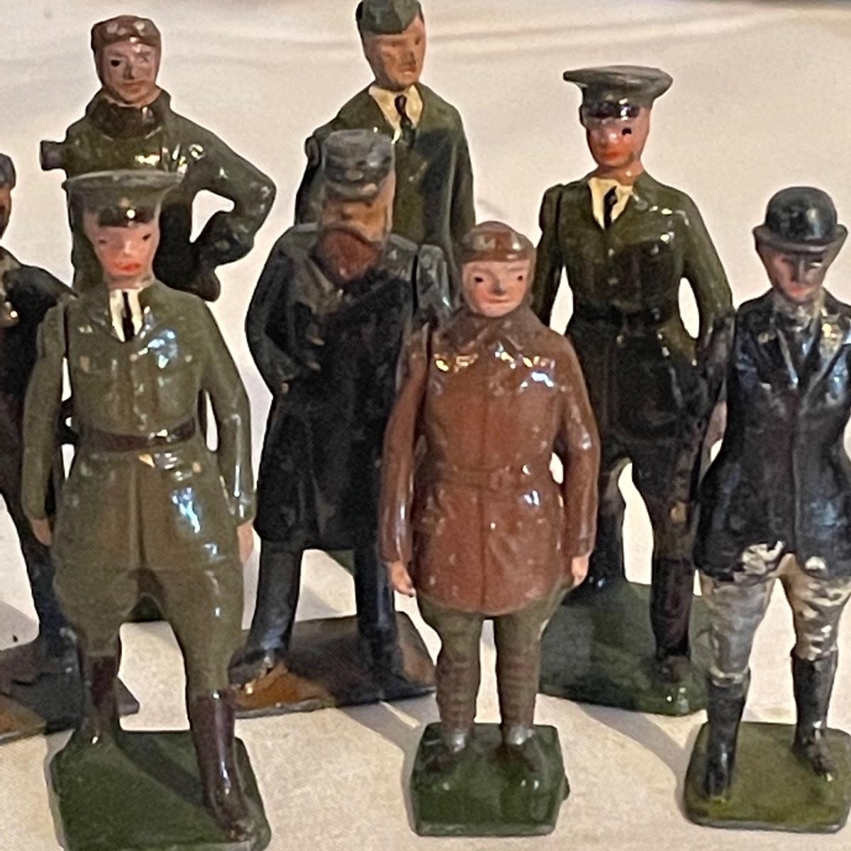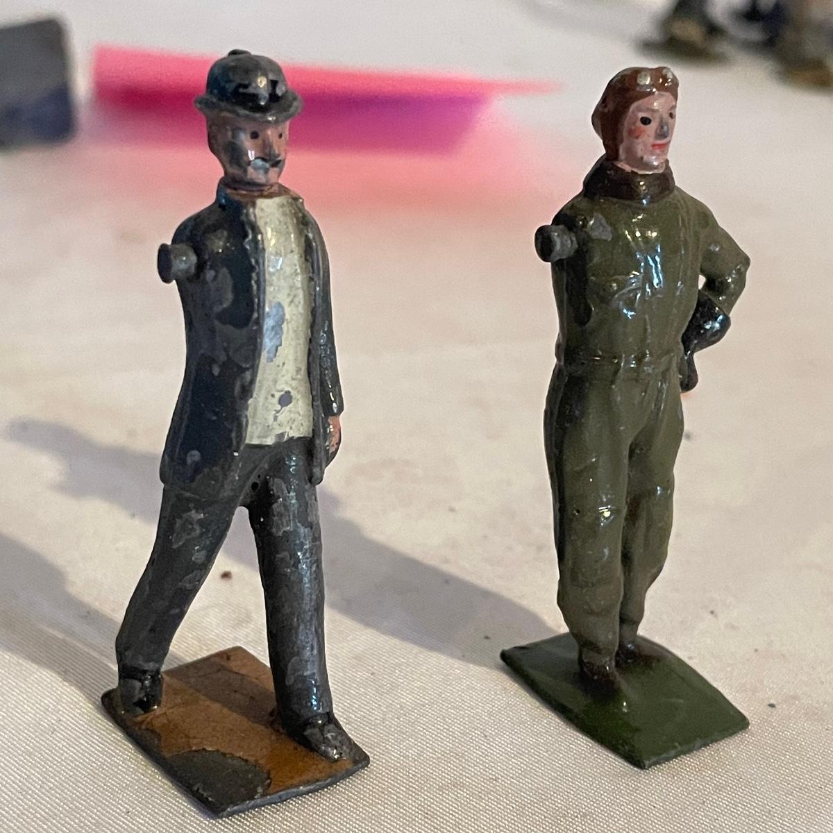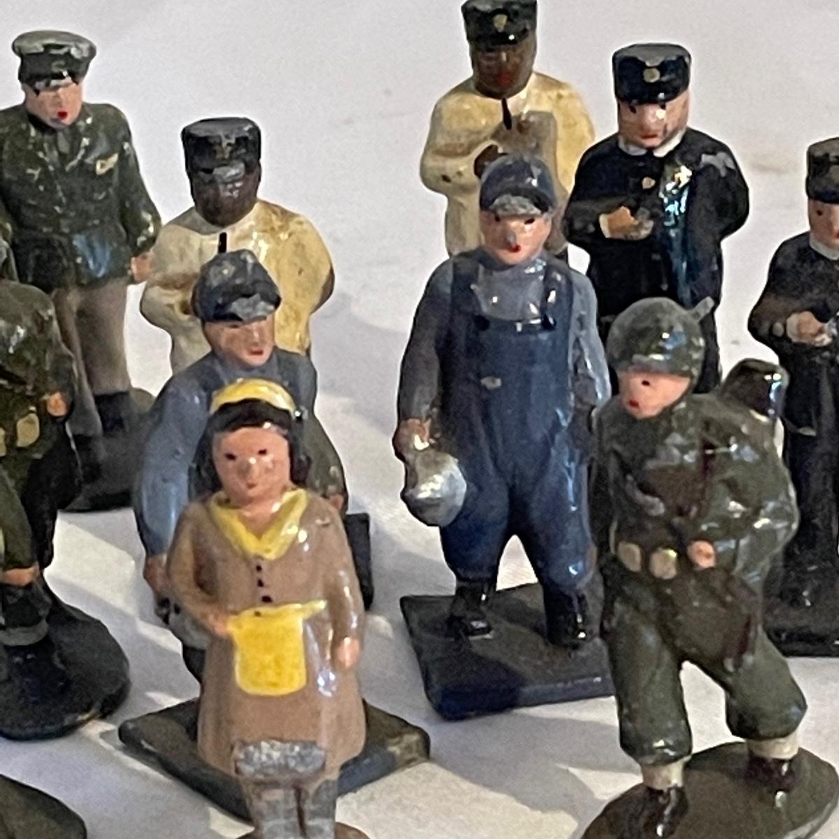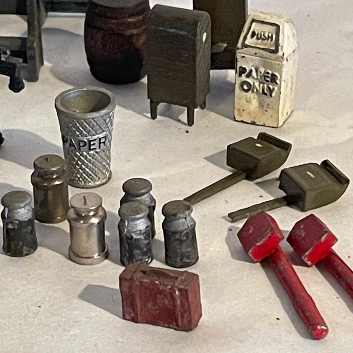 Over twenty die cast figures in this lot plus lots of accessories such as benches, fire hydrants, mailboxes and more. A group of these figures are Britains Ltd with a movable arm (two have broken arms) and another group are Tru Craft plus more. The Lincoln Log figure is missing his arm.