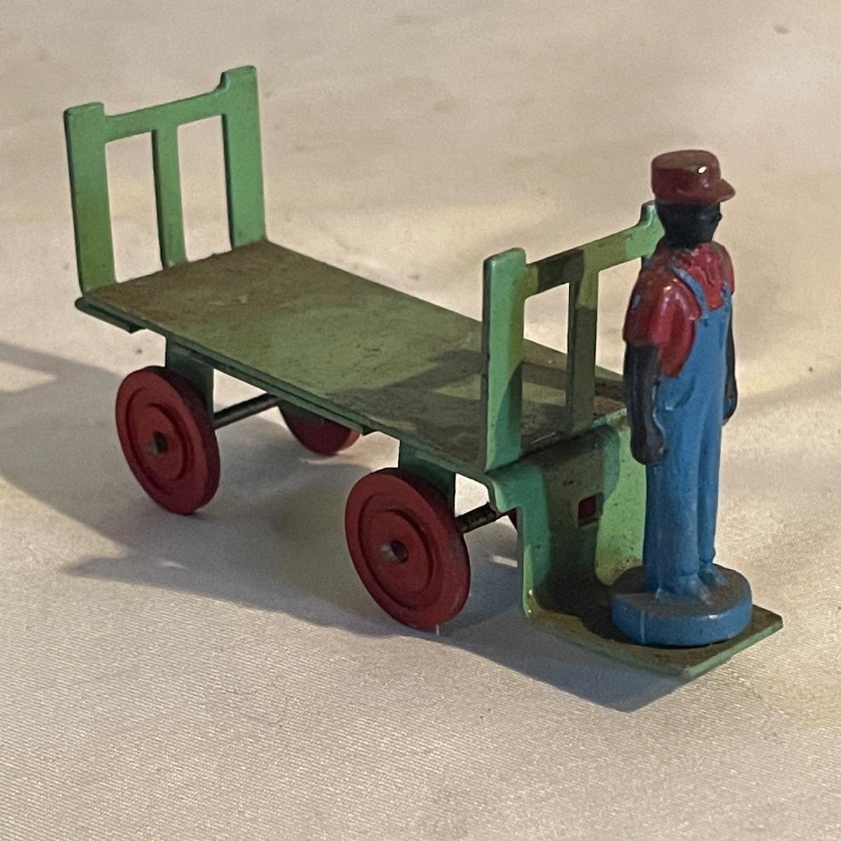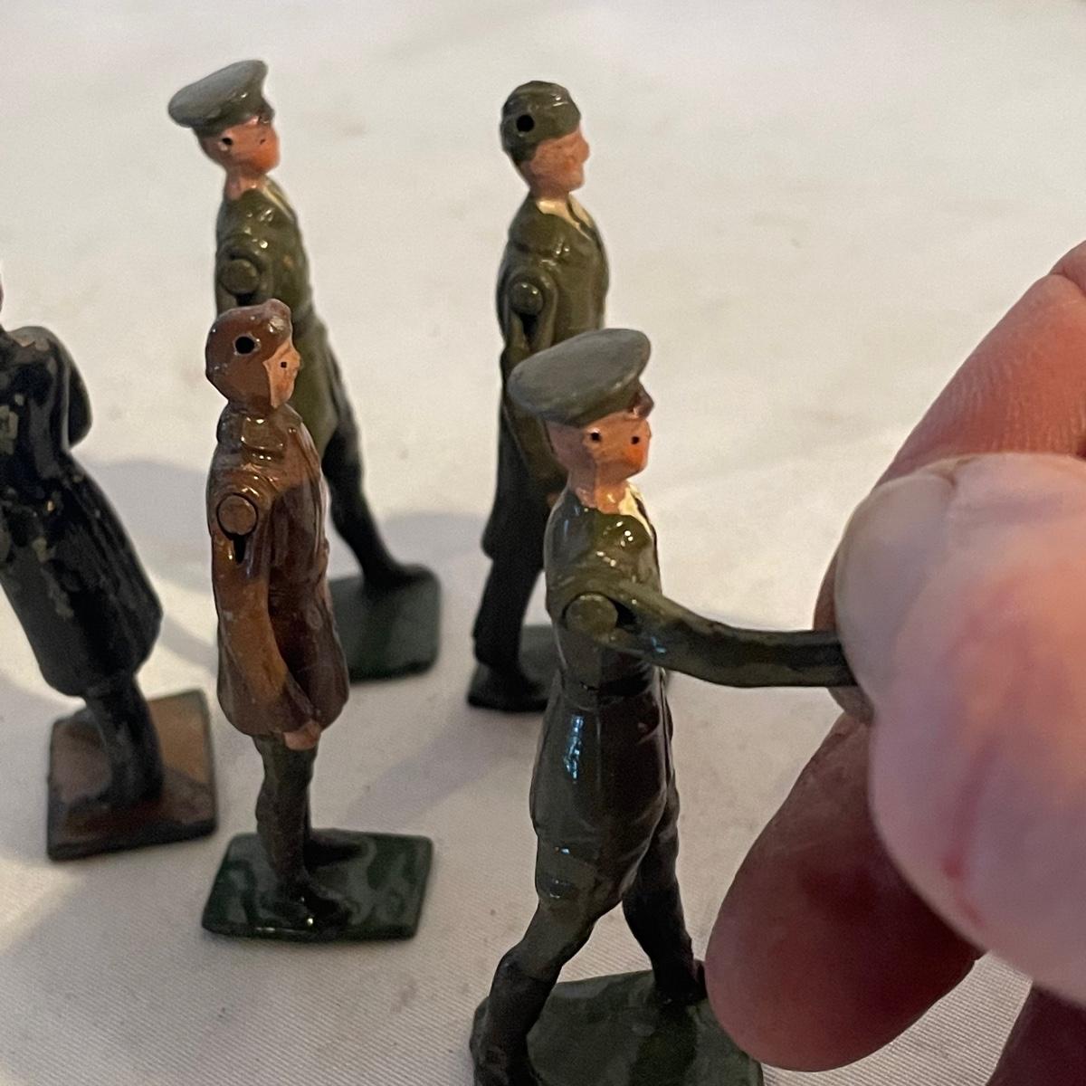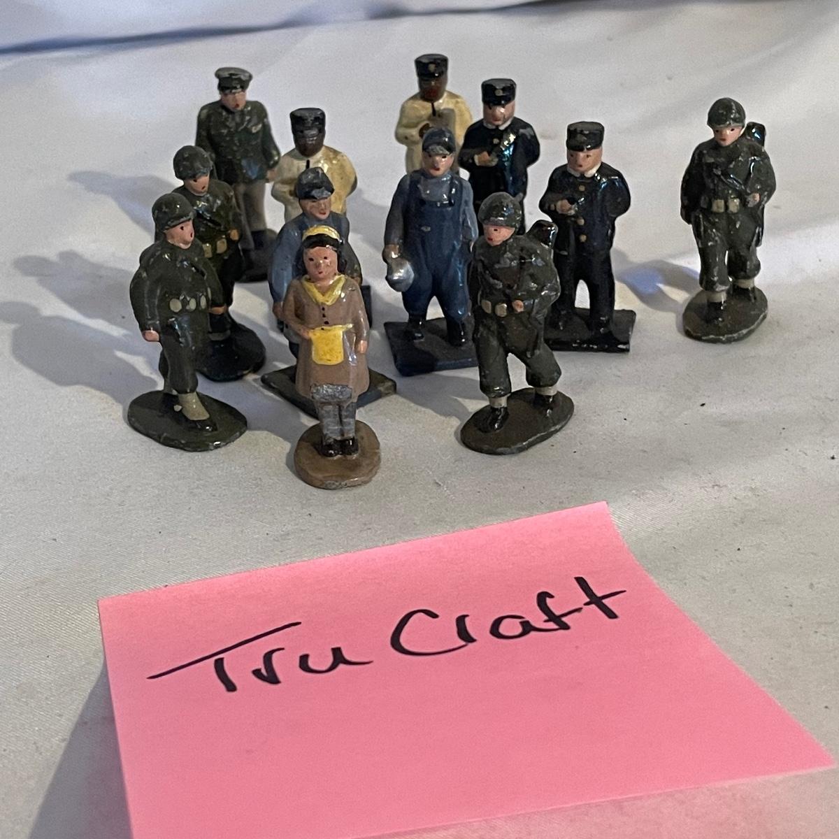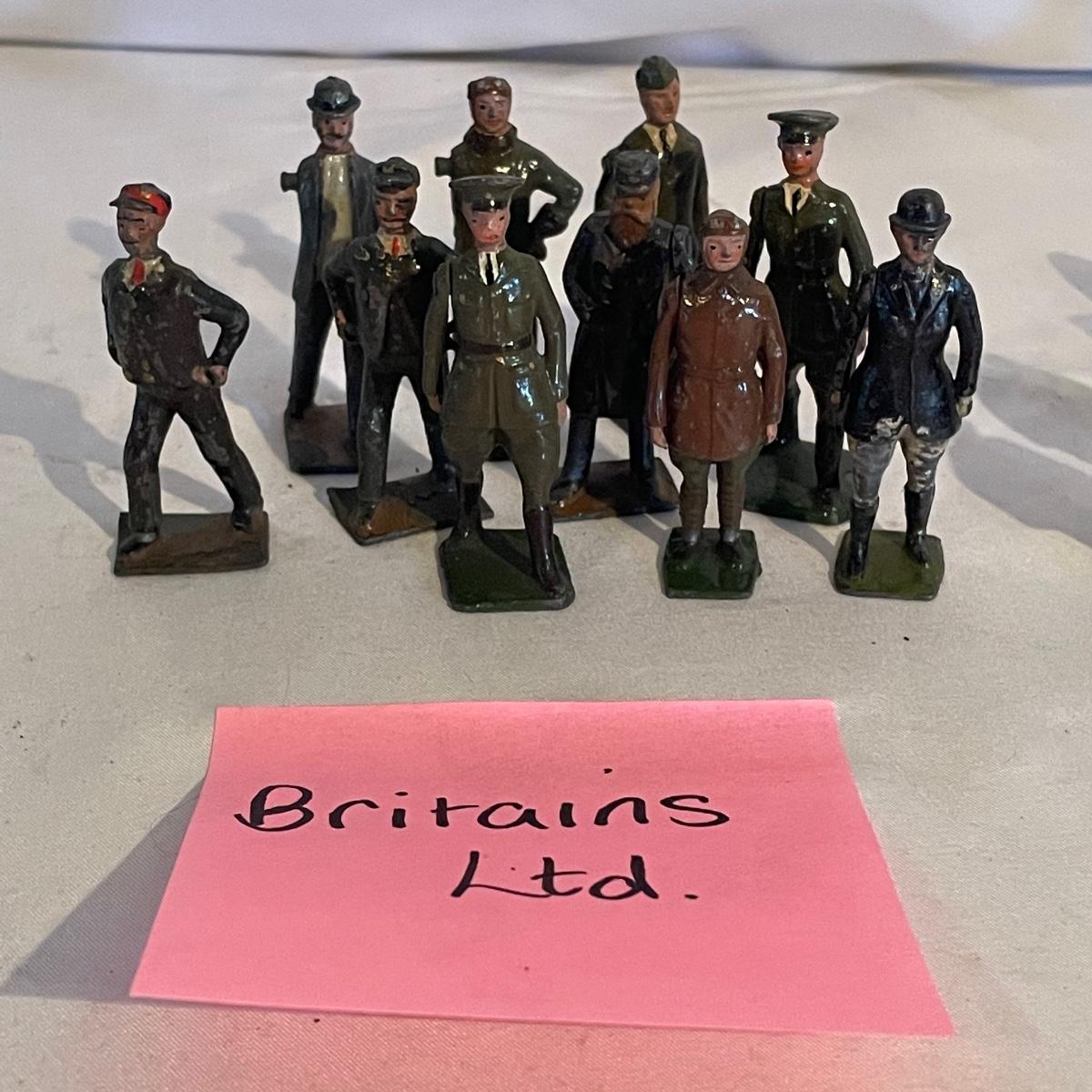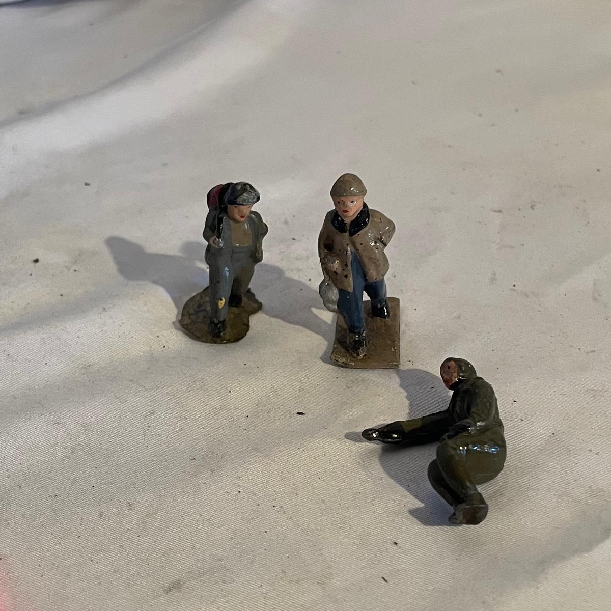 Over twenty die cast figures in this lot plus lots of accessories such as benches, fire hydrants, mailboxes and more. A group of these figures are Britains Ltd with a movable arm (two have broken arms) and another group are Tru Craft plus more. The Lincoln Log figure is missing his arm.