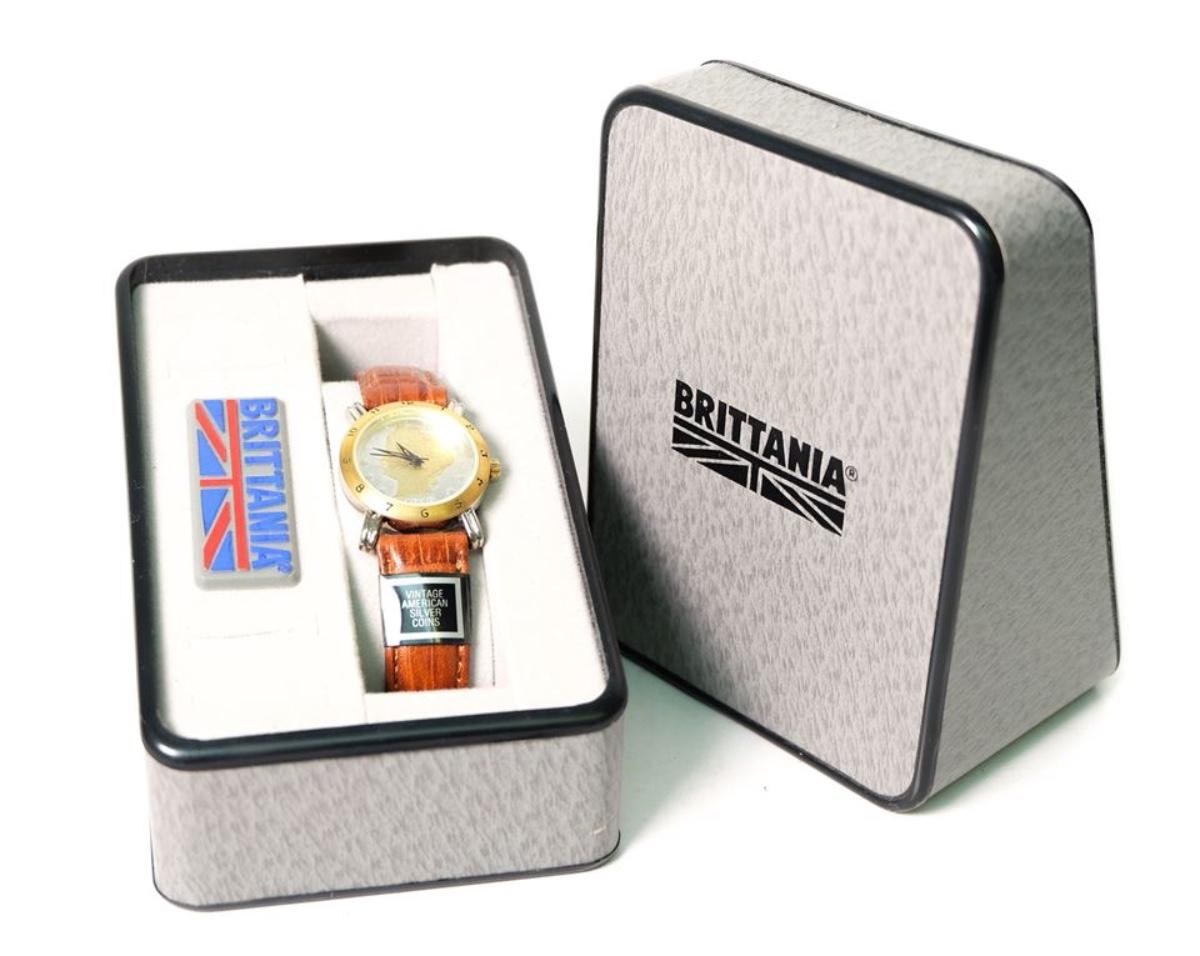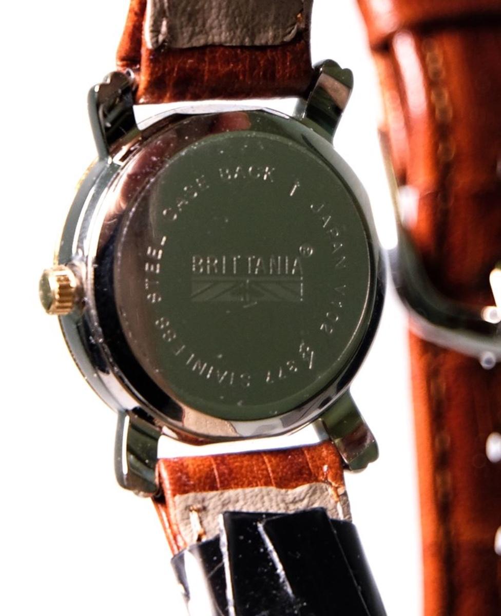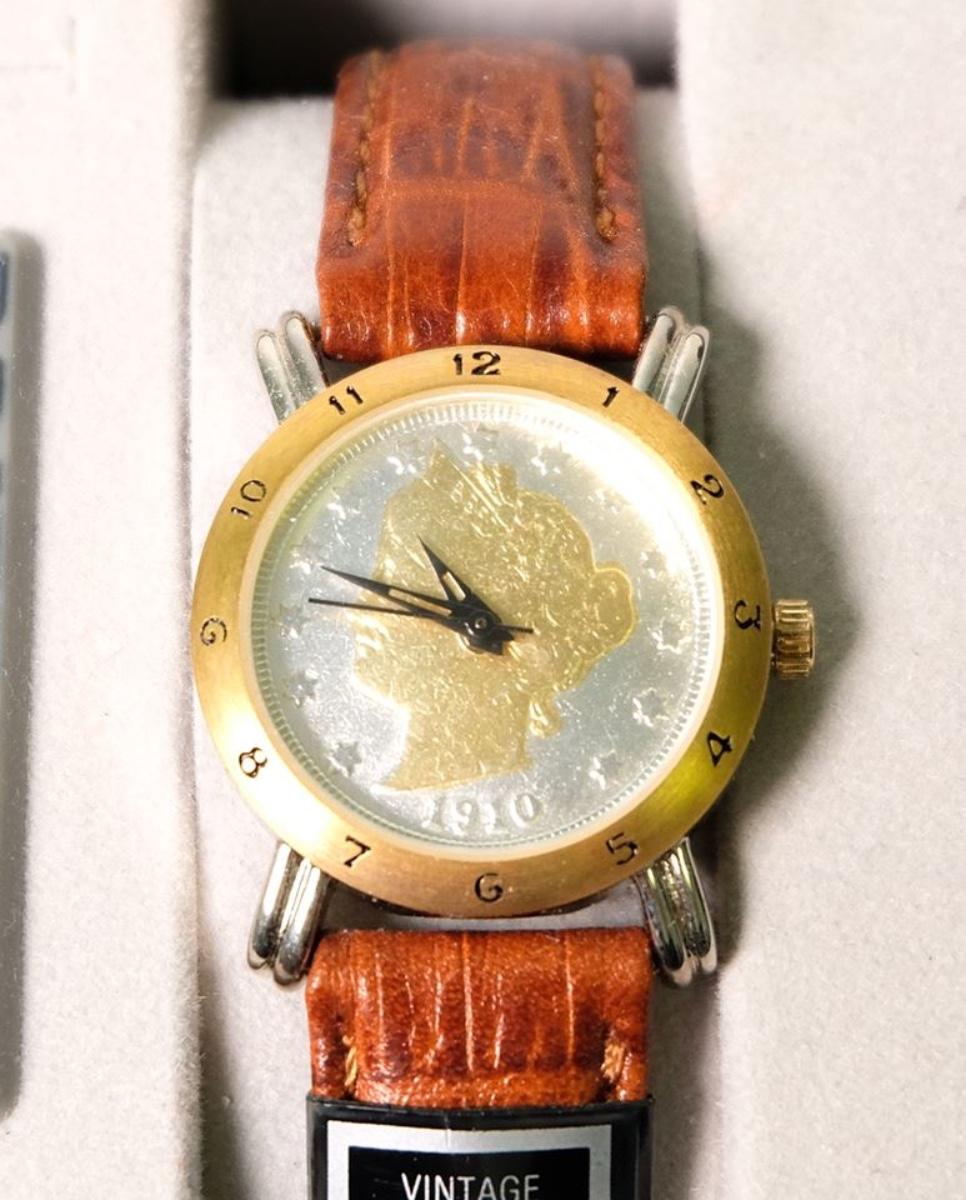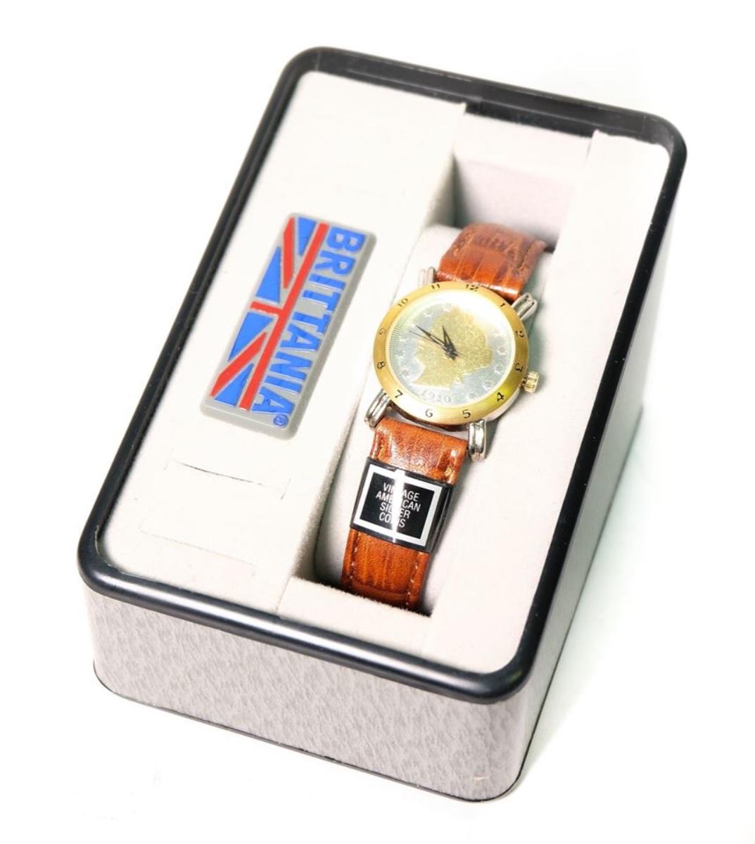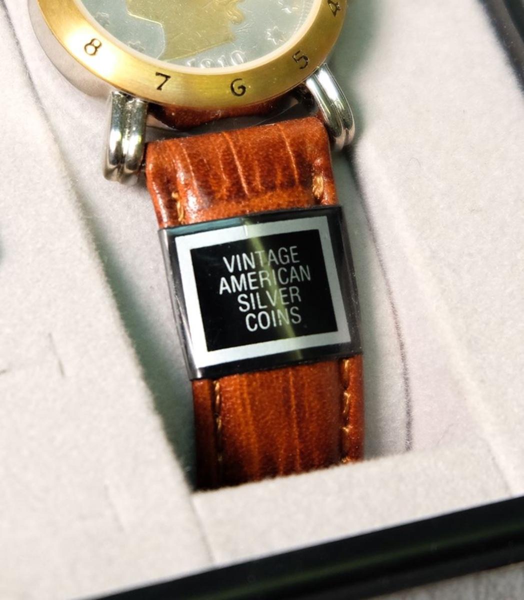 Accompanied by box. Leather band. Adjustable band measures approx. 6.5". Unsure of working condition, needs a new battery.