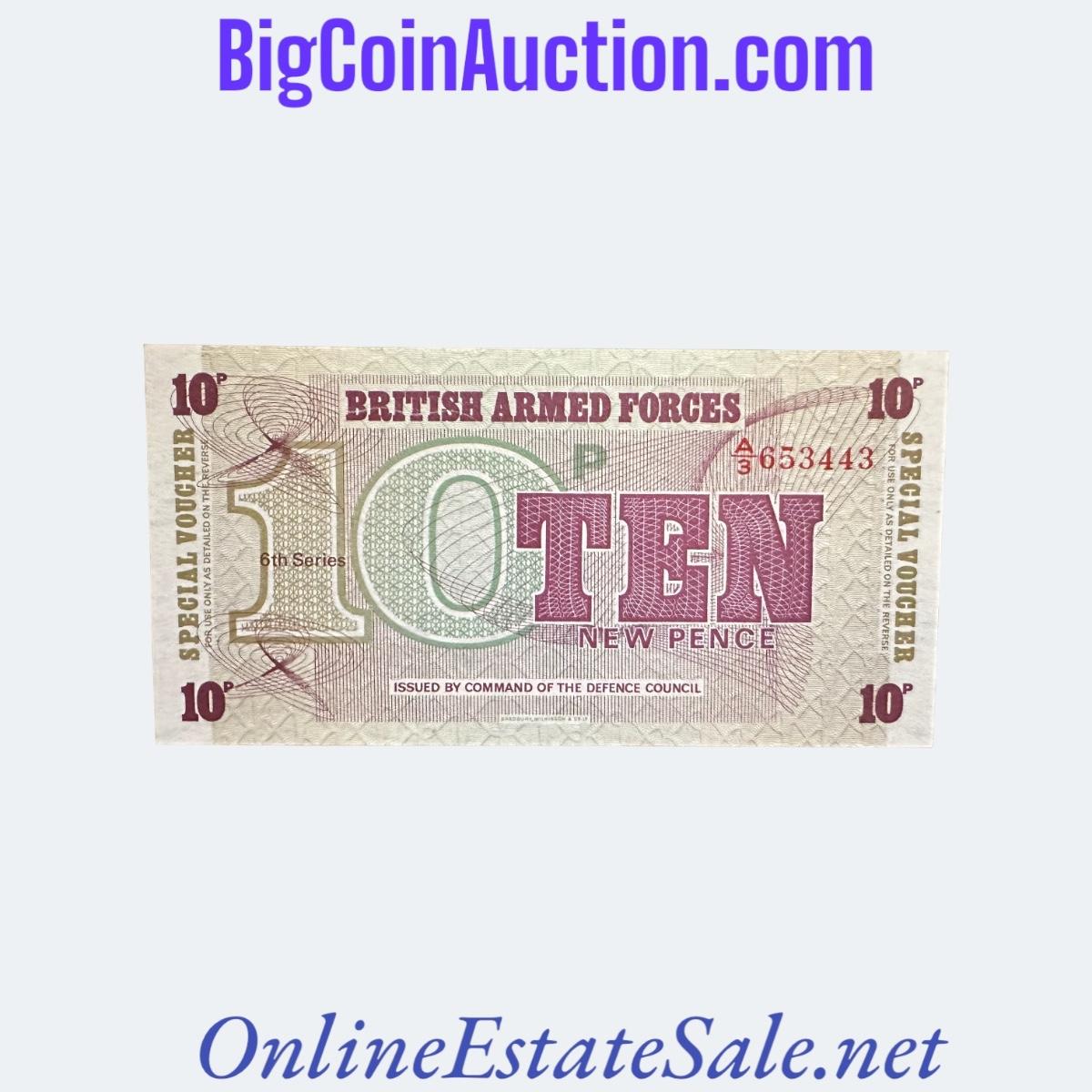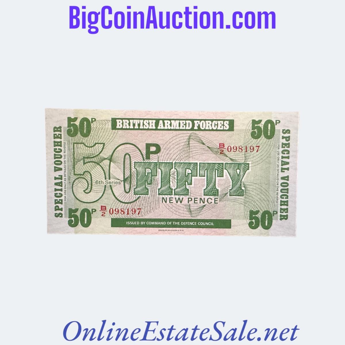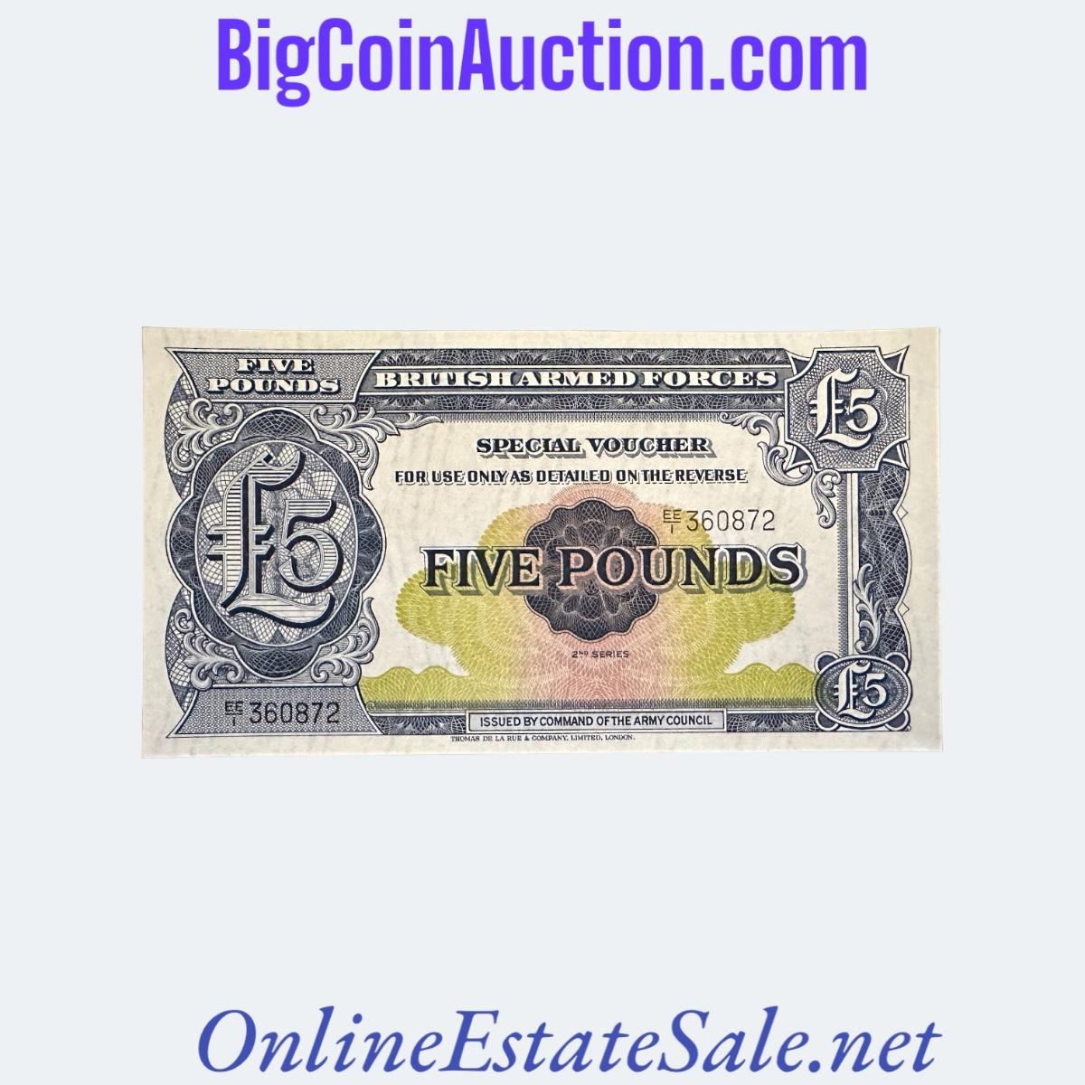 BRITISH ARMED FORCES SET OF 7 SPECIAL VOUCHERS - 5 PENCE, 10 PENCE, 50 PENCE, 3 - 1 POUND VOUCHERS, AND 5 POUNDS