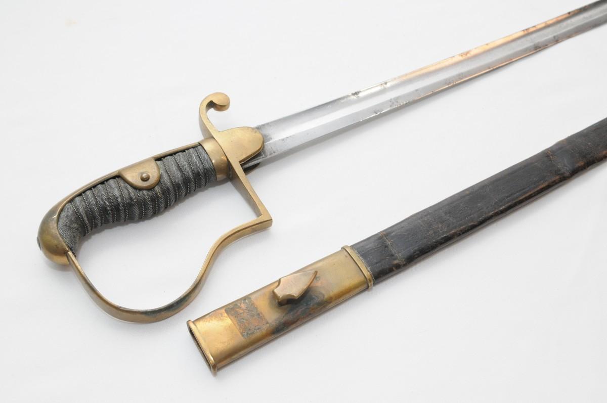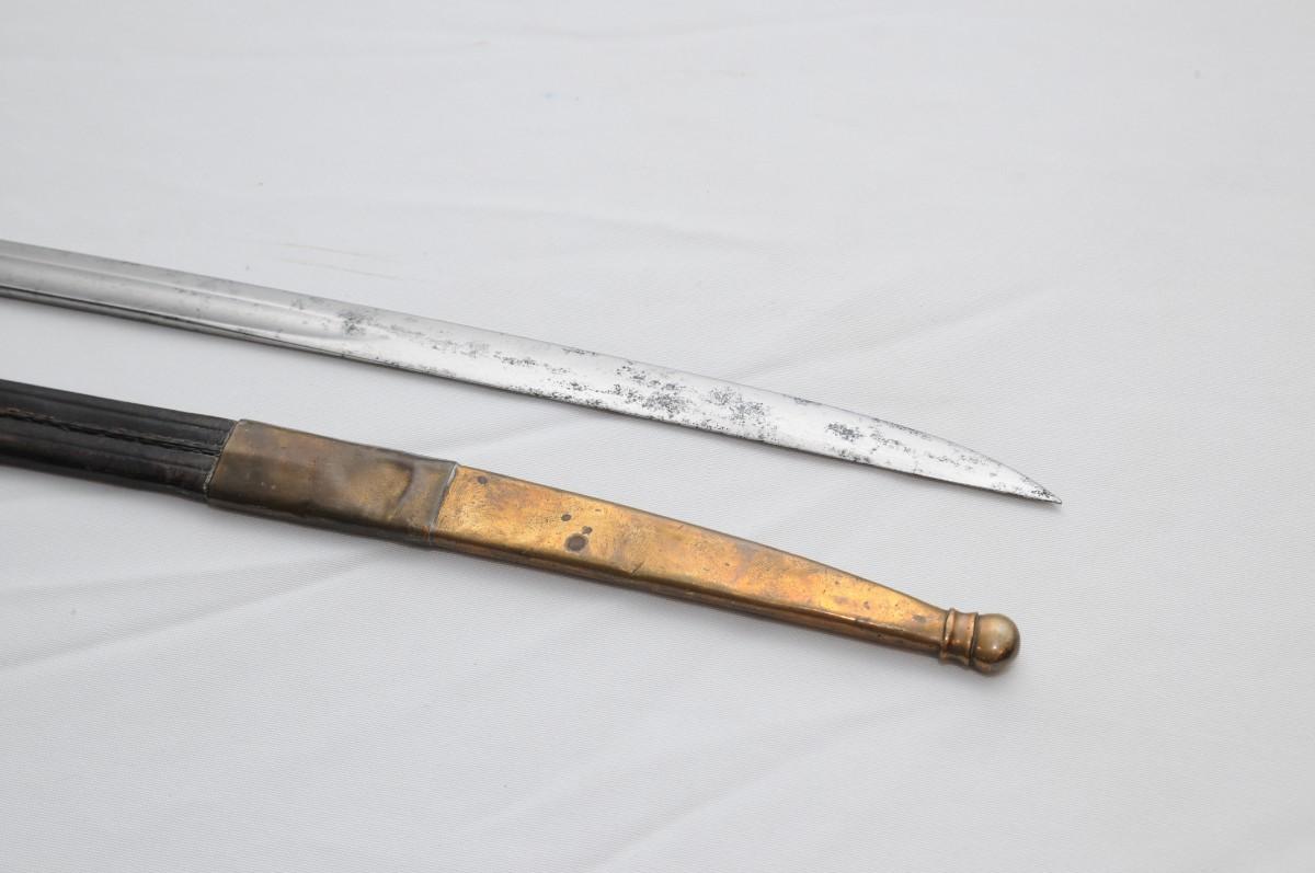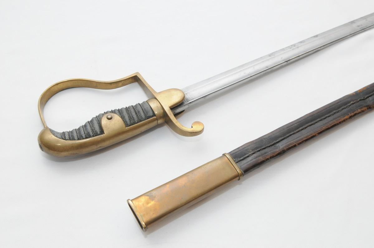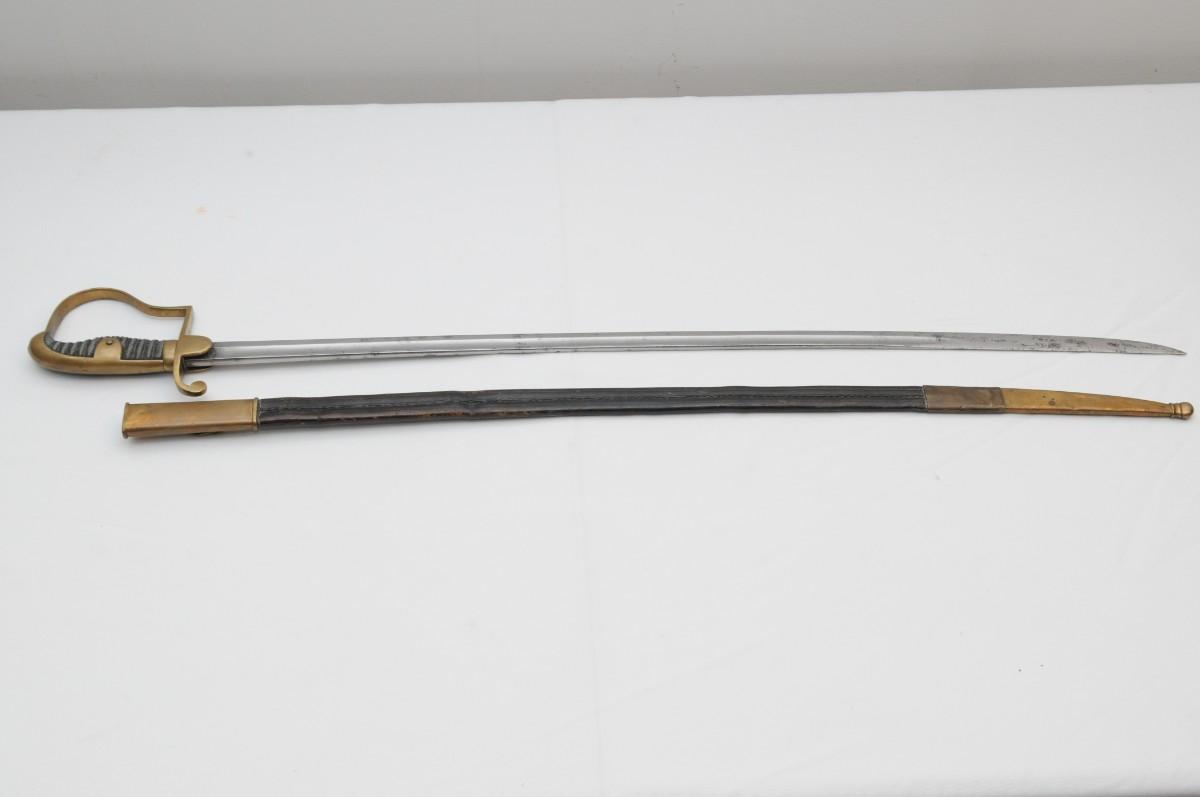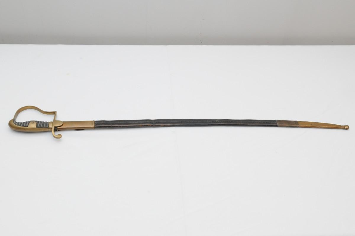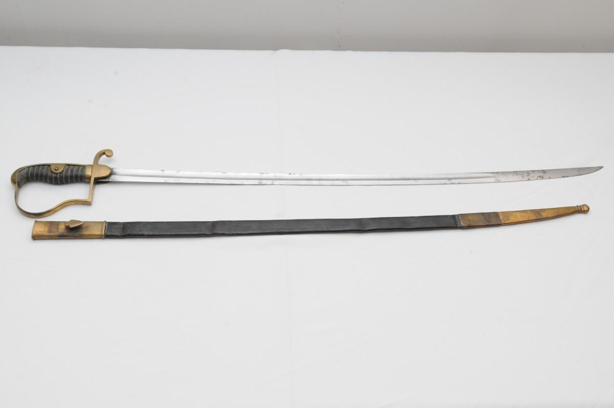 British Light Cavalry Saber manufactured by Thurkle of London. It is mounted with a blade that measures 31" in length by 1 1/2" wide. The blade has survived in good condition with a few small dents. The Brass guard also remain in nice condition as does the carved wooden handle. Scabbard is made of brass & leather and has dents and dings. Measures 38"x1"