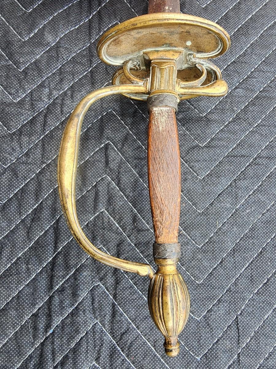 1787 French FA Epee' D' Officer Smallsword. Fencing blade (possibly has been replaced) with a length of 34" and width of 11/16". The handle is black leather and brass (pasden, guard, and hilt appear authentic). No scabbard. Good condition. Authentic, except blade, which is not confirmed.