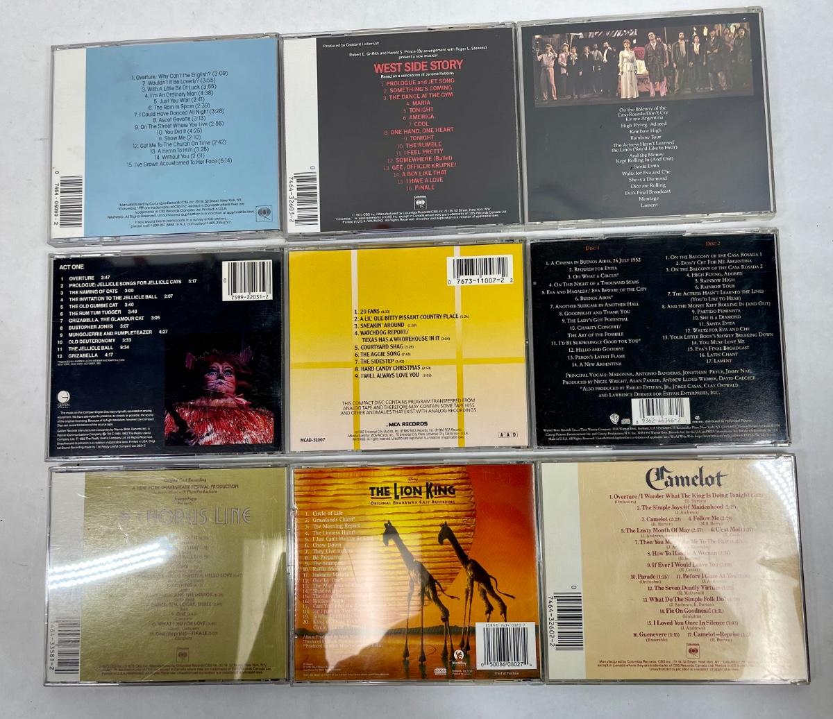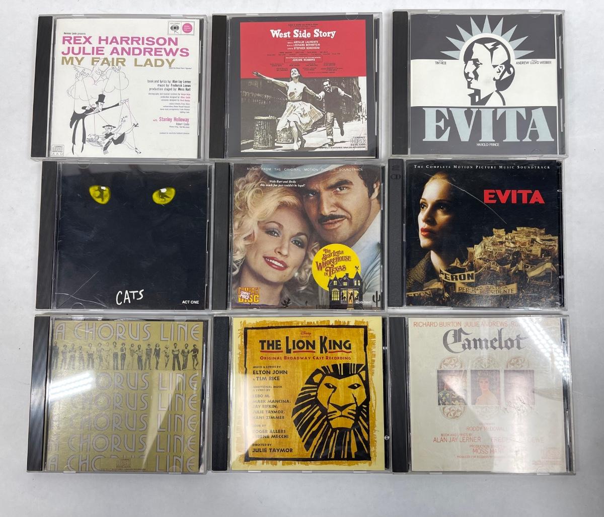 Titles include: The Lion King, Evita, West Side Story, Cats, My Fair Lady, Camelot, and others. Most are Broadway Cast recordings, others are from the movie soundtrack.