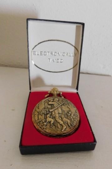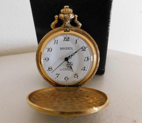 Brodex Pocket Watch in Box Hunter Scene Case. Winds and appeared to work work while being tested. Not checked since listed. Bid accordingly.