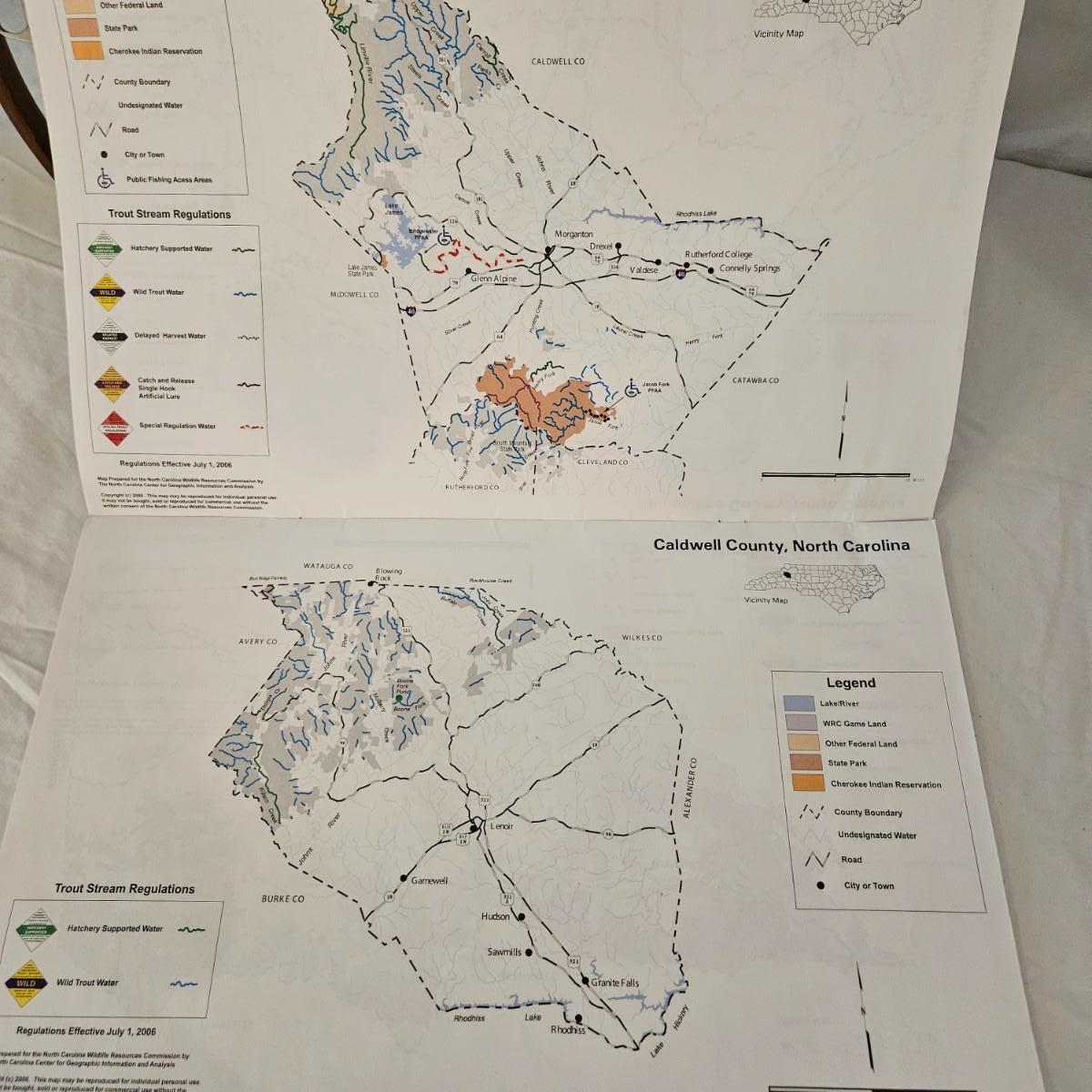 A Brodin handcrafted net constructed of two types of wood and a silicone net. It measures approximately 28"L x 12"W. Also included is a Really Right Stuff soft sided rod case for multi piece rods that measures approximately 30" in length and a second edition NC trout maps book that shows all the public trout waters in NC with their designation. Shipping available