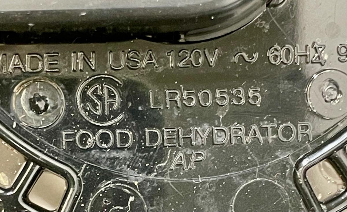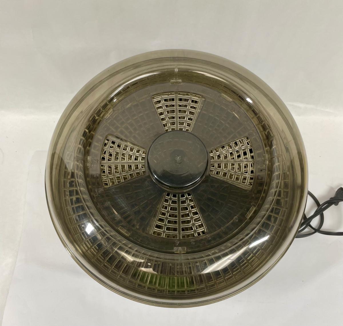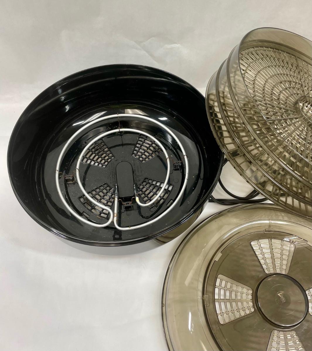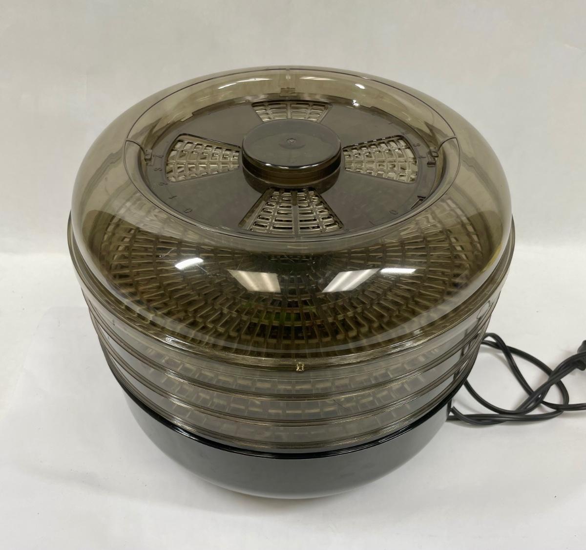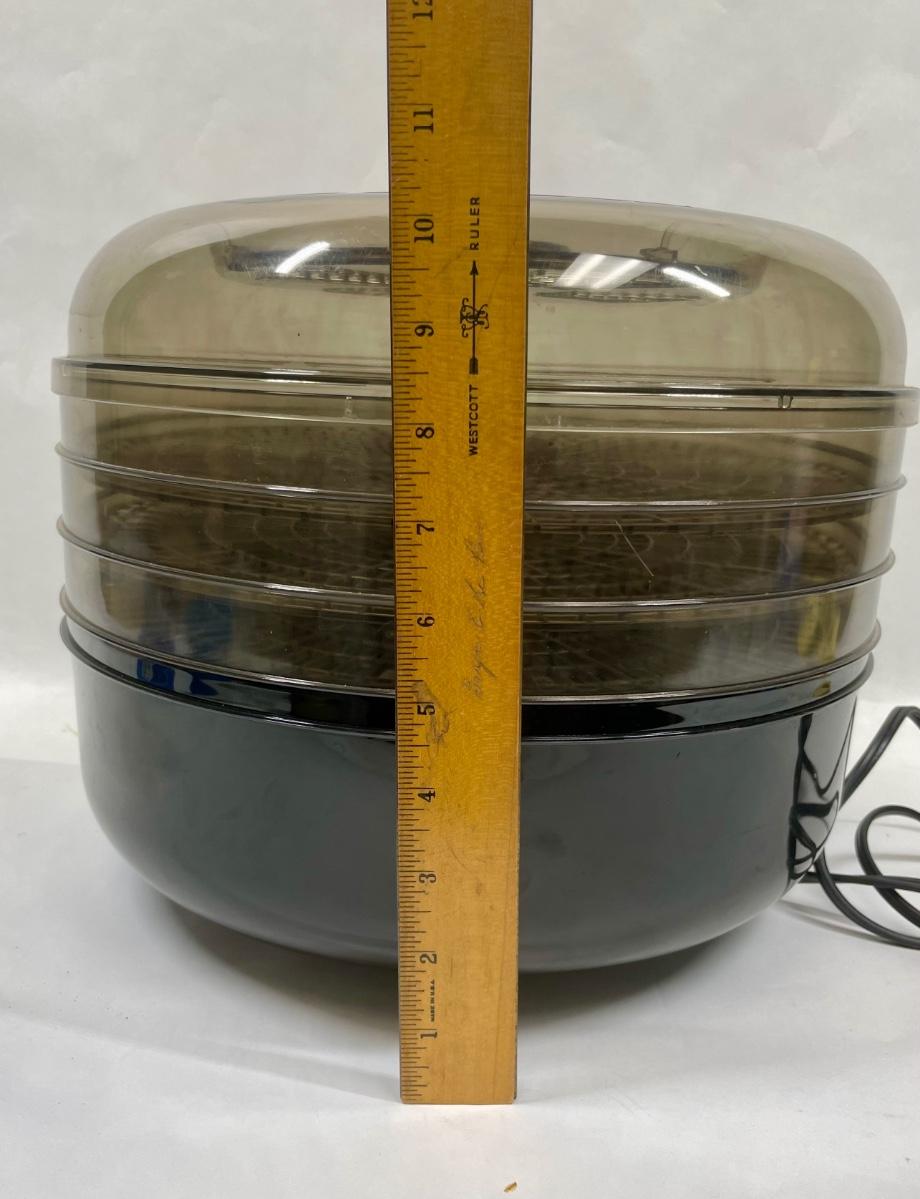 Model 187-04. For drying fruit, vegetables and meat strips. Has 3 stackable drying trays, heating element is inside base. Includes instruction manual. Tested, heats as expected.