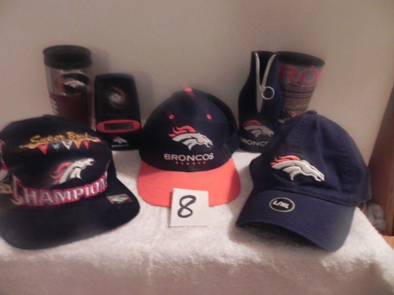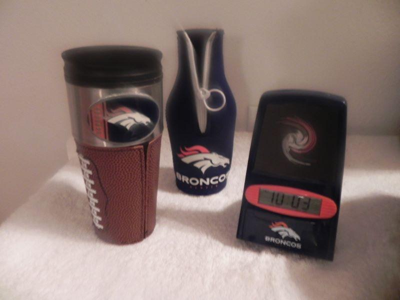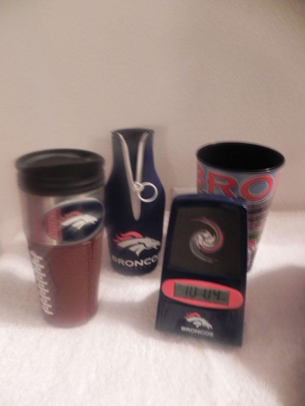 Official Bronco hats, alarm clock, Drinking cup w/lid, bottle cover, and plastic cups.