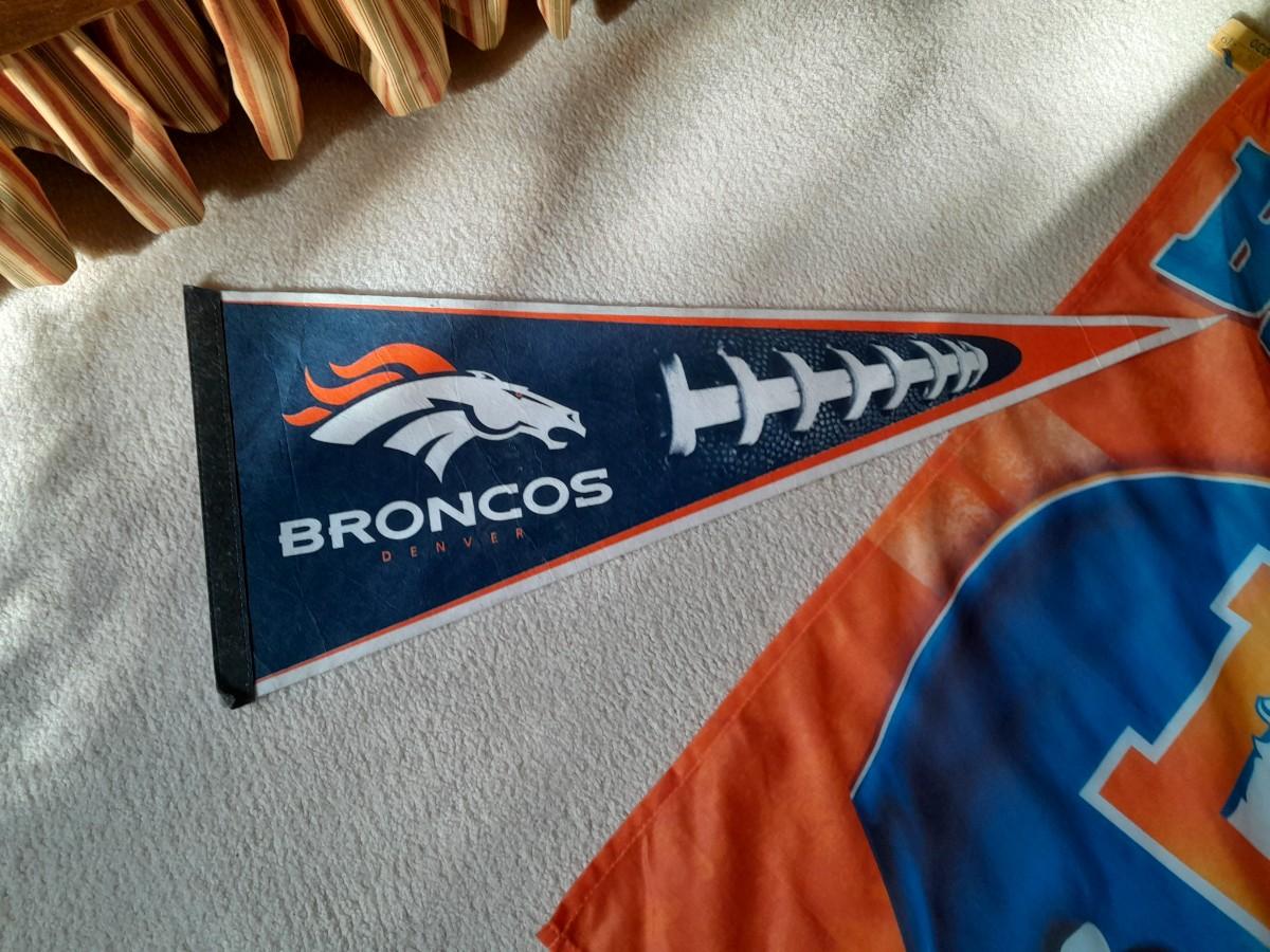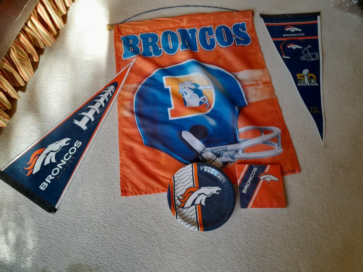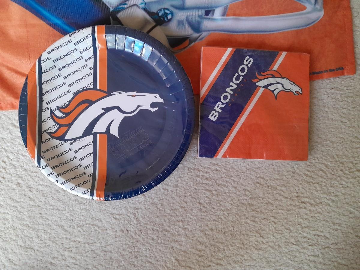 BRONCO'S FLAG, TWO BRONCO'S PENNANT / BANNERS, BRAND NEW PAPER PLATES AND NAPKINS FOR YOUR FOOTBALL PARTY!