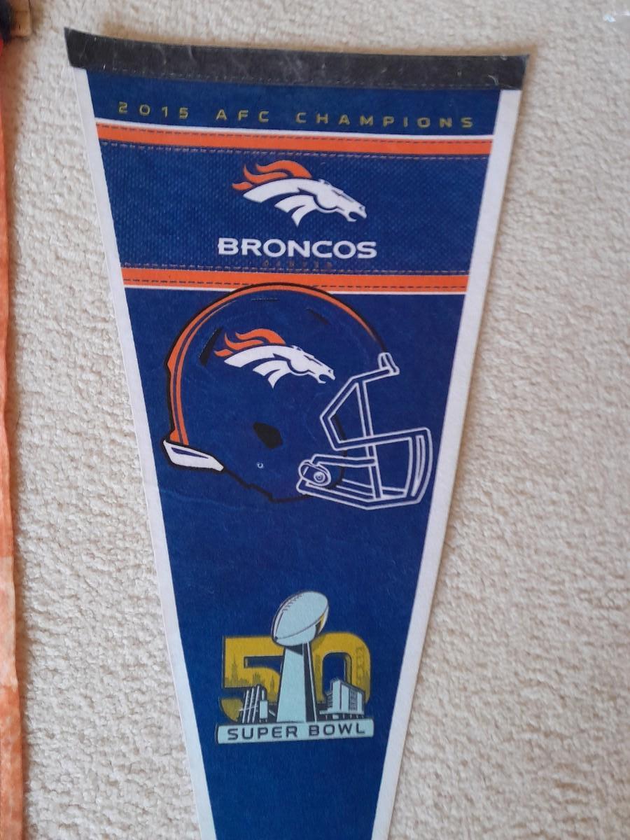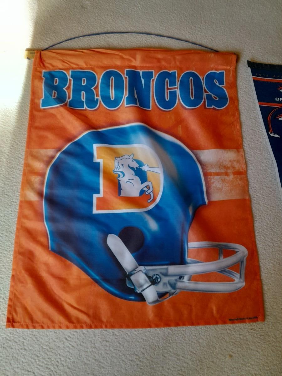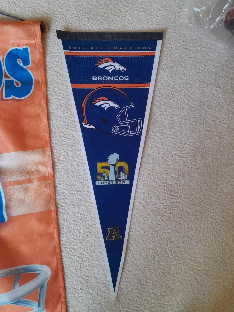 BRONCO'S FLAG, TWO BRONCO'S PENNANT / BANNERS, BRAND NEW PAPER PLATES AND NAPKINS FOR YOUR FOOTBALL PARTY!