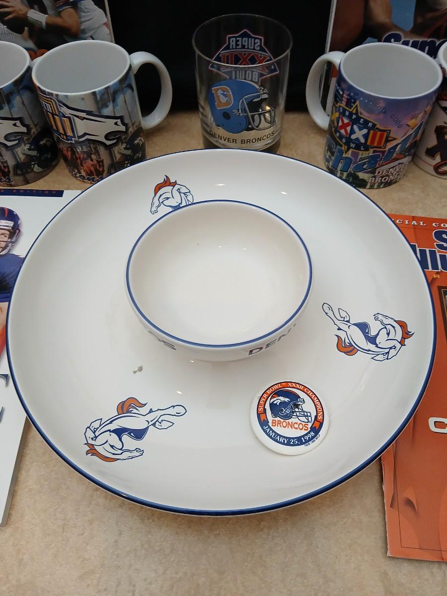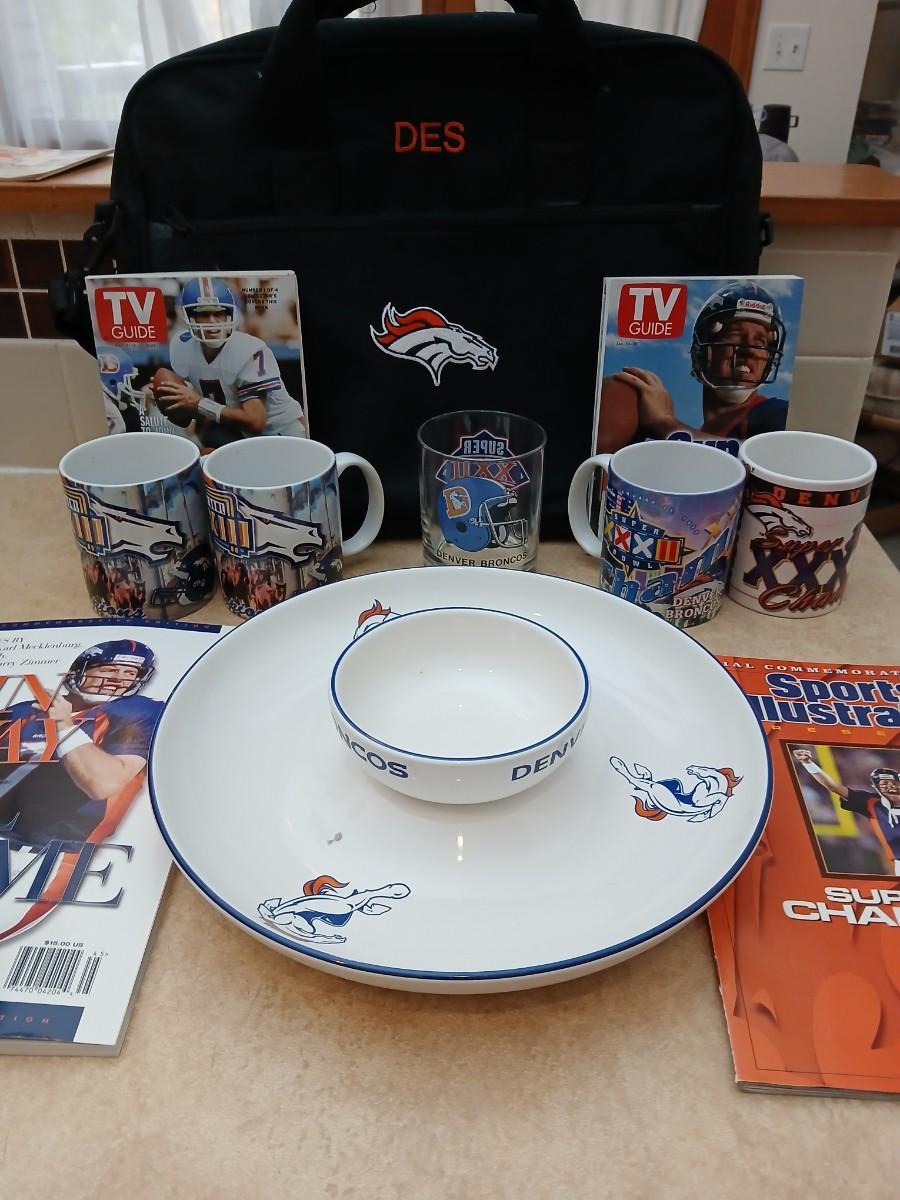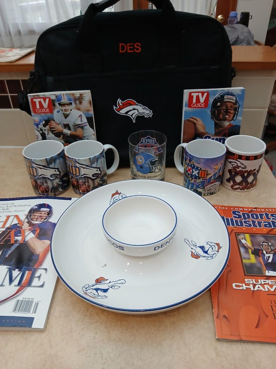 Bronco's Football collectibles - Chip and dip bowl, magazines, and Coffee mugs with a bag