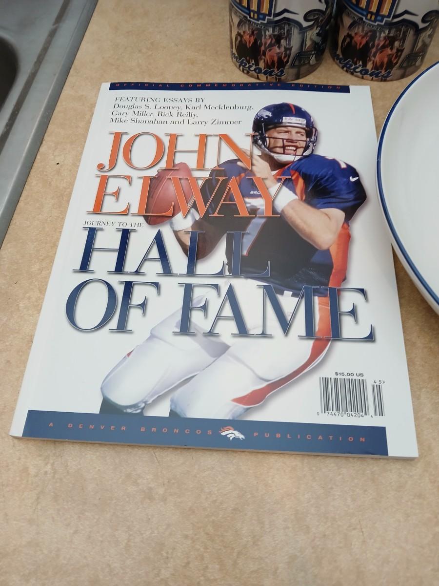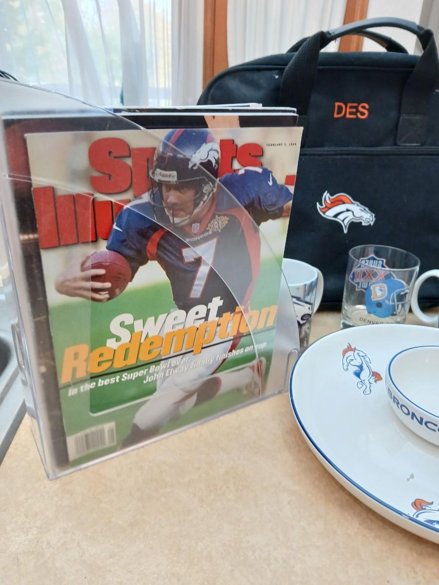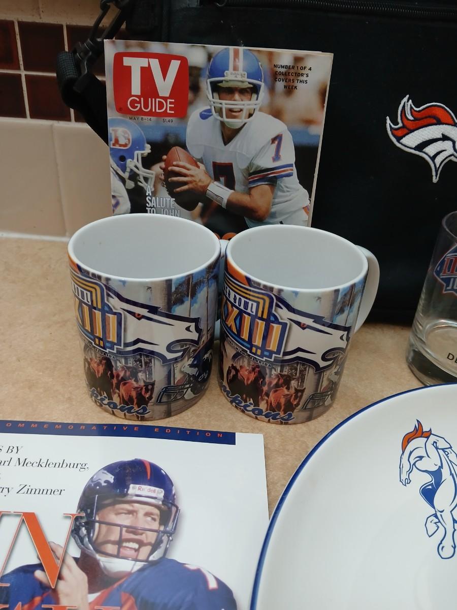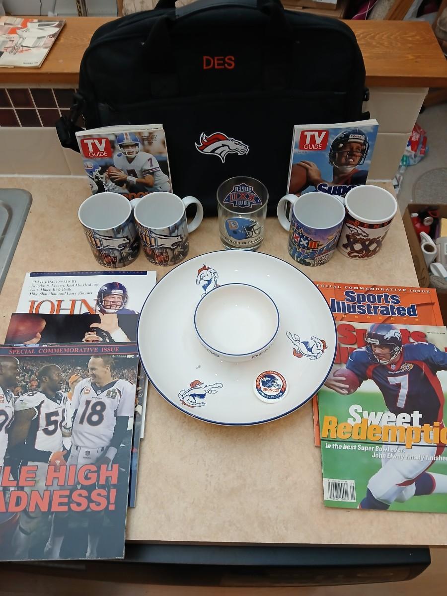Bronco's Football collectibles - Chip and dip bowl, magazines, and Coffee mugs with a bag