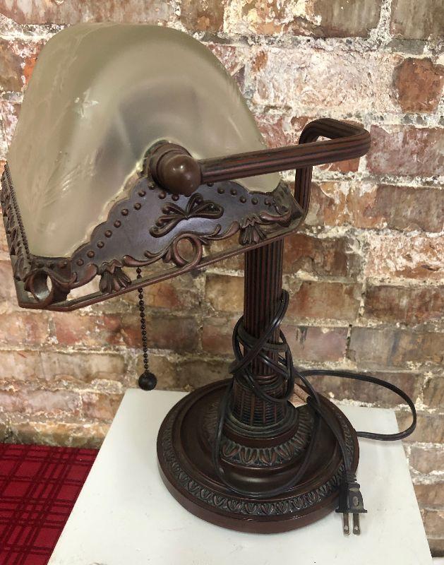 With an etched shade here is a bronze-tone reproduction of an antique desk lamp...a handsome piece...